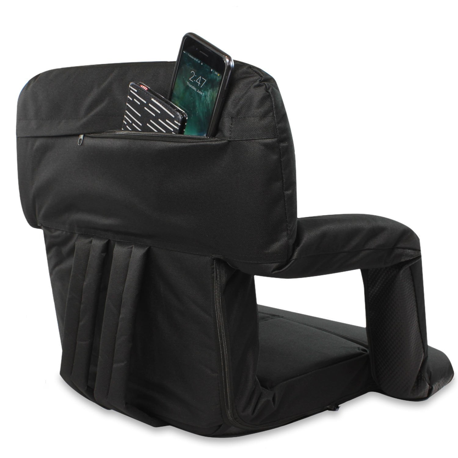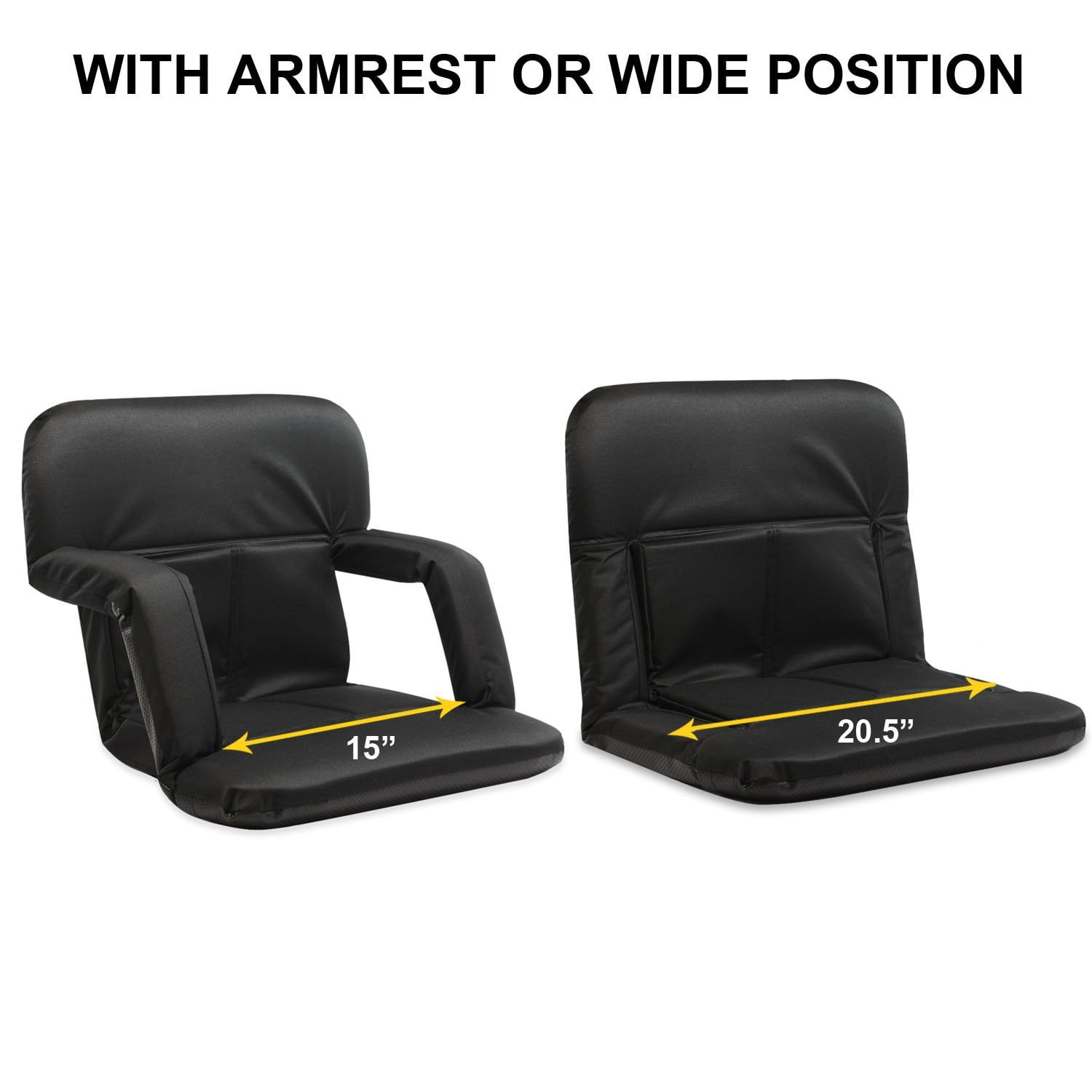 PADDED STADIUM SEATS: The cushioned stadium seat is the perfect comfortable chair for your next sporting event, backyard hangout or beach vacation. DURABLE CUSHIONED CHAIR: Each stadium seat is equipped with a polyester-covered padded cushion attached to a durable steel frame for optimal comfort. The bottom of each seat is built with a water resistant material allowing for your underside to remain dry ARMREST, STORAGE POCKET & CARRY STRAPS: The stadium seat features comfortably padded armrests, zipper storage pocket for stowing away extra accessories. When carrying to and from the game, the chair is equipped with backpack-style shoulder straps for ease of transport. 2 WIDTH POSITIONS: The sports chair may be set with armrests up fitting a width of 15”. Set the chair with no armrests to reach a maximum width of 20.5”. OVERALL DIMENSIONS: 20.5” Width x 32” Length x 2” Height 6 RECLINING POSITIONS: The sports chair is built to recline to 6 different positions to adjust to your unique fit. Folds flat for ease of storage.