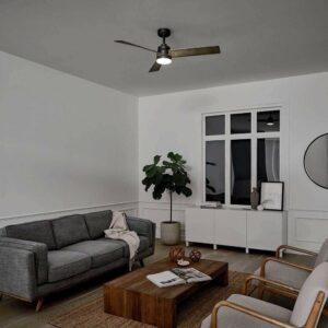 Kichler Lighting-300275NI-Collection: Spyn, Material: Steel, Finish Color: Brushed Nickel, Blade Span: 52″, Blade Color: Black, Number Of Blades: 3, Blade Pitch: 13°, Fan Motor Size: 153MM X 17MM mm, Fan Motor Type: AC, Hanging Method: Stem, Stem Rod Number And Lengths Included: 1-6, Light Kit Type: Integrated, Lamping Type: LED, Cri: 80, Color Temperature: 3000 Kelvin, Control Type: Wall, Wet Location: Dry Rated, Desc: Squared edges and angles give this 52in. Spyn LED ceiling fan in Anvil Iron it’s contemporary style and industrial look. Sized for bedrooms or smaller spaces, the integrated LED light delivers terrific room-filling illumination. Rod Length(s): 1-6 / Dimable: Yes. ,-Spyn – Ceiling Fan with Light Kit – 14.5 inches tall by 52 inches wide-Brushed Nickel Finish