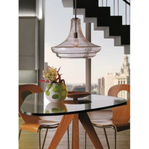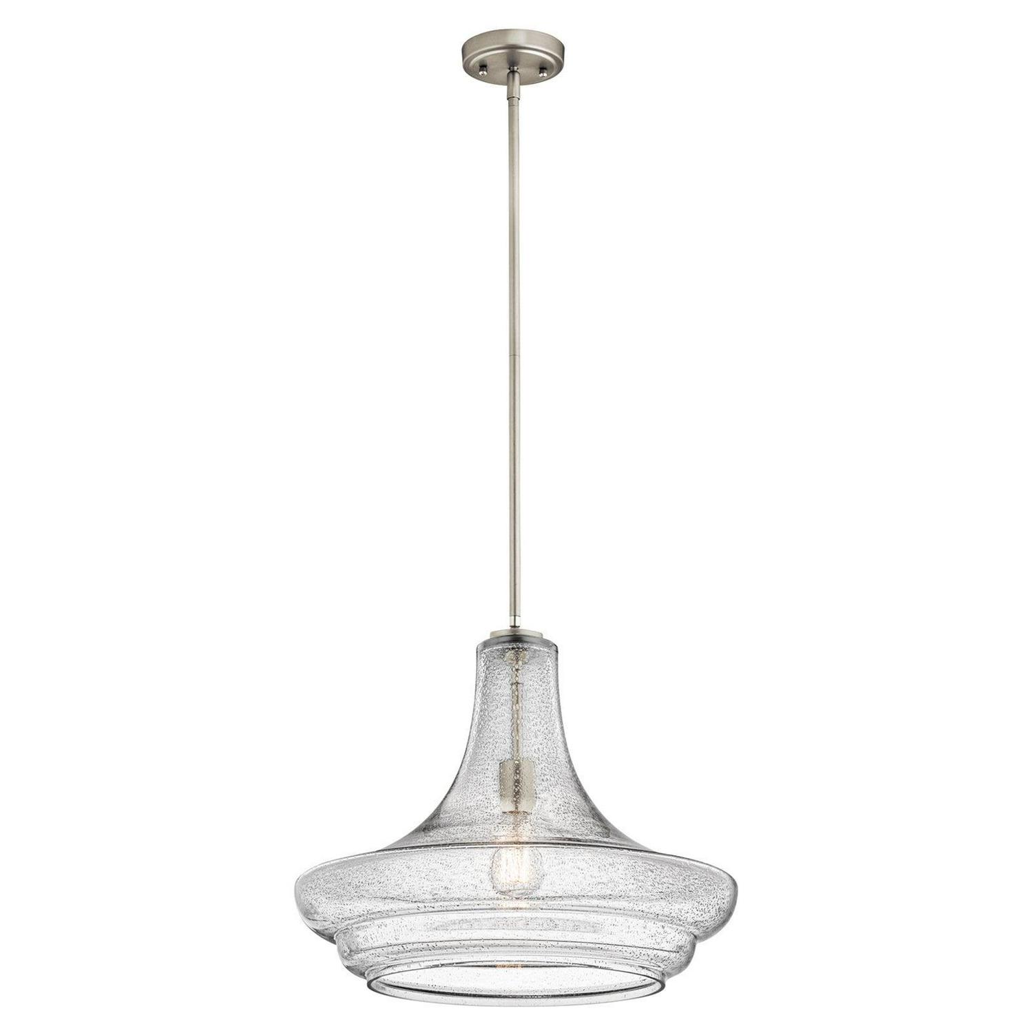 The clear seeded glass shade on this Kichler Everly 42329 Pendant Light is artfully shaped and suspended from a simple fixture in your choice of finish. This pendant light requires one 100-watt incandescent bulb (not included).