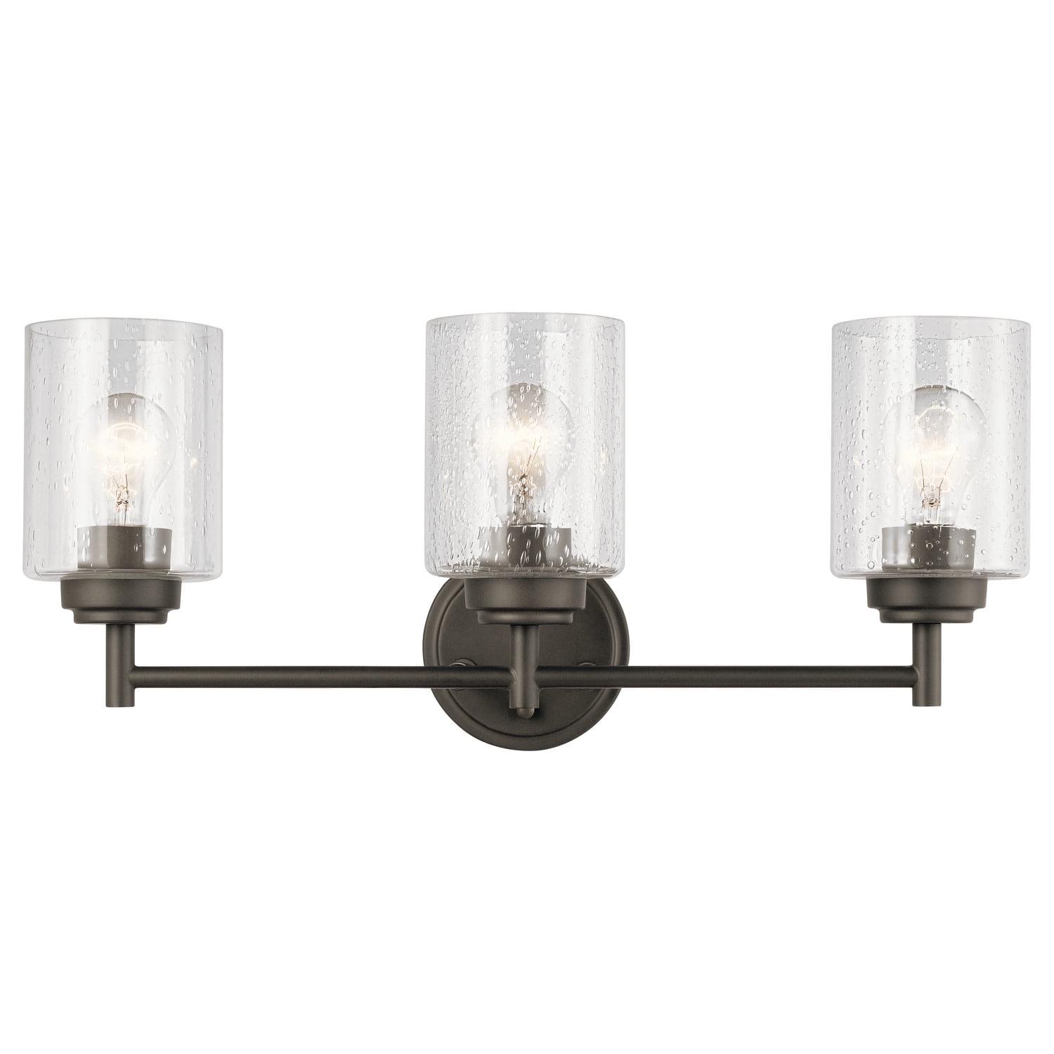 Kichler Lighting-45886OZ-Collection: Winslow, Material: Steel, Finish Color: Olde Bronze, Width: 21.5″, Height: 9.25″, Depth: 6.5″, Height From Outlet Box: 7″, Backplate Width: 4.75″, Lamping Type: Incandescent, Number Of Bulbs: 3, Wattage: 75 Watts, Dimmable: No, Moisture Rating: Damp Rated, Desc: The modern Winslow 3-light 21.5in. bath light in a Black finish with Clear Seeded glass shade pair beautifully with the linear arms, bringing light and dimension to a space. Mounting Direction: Up or Down / Back Plate Width: 4.75. ,-Winslow – 3 Light Bath Vanity Approved for Damp Locations – with Contemporary inspirations – 9.25 inches tall by 21.5 inches wide-Olde Bronze Finish