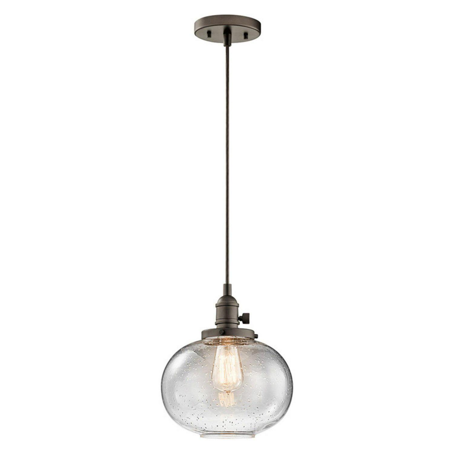 The Kichler Avery 43852 Mini Pendant Light gives you bright light and modern design that will enhance any space. A single metal rod in your choice of available finish supports a clear seeded glass globe and exposed bulb. The understated elegance and blend of classic and new makes this fixture a great fit for your modern home. This pendant light requires one 100-watt incandescent bulb (not included).