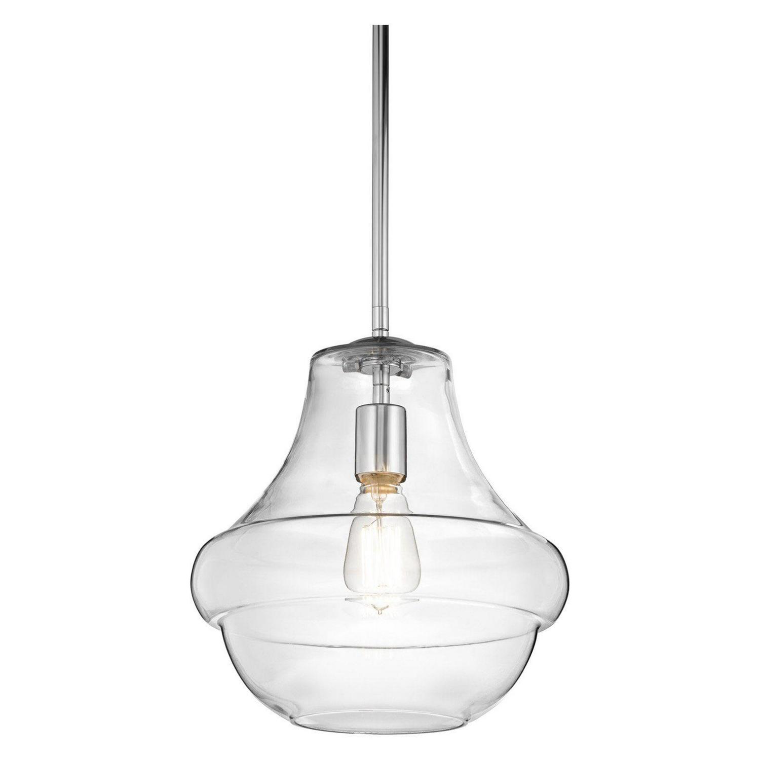 A glorious shaped clear glass shade makes this Kichler Everly 42044 Pendant Light a premium example of practical art. This pendant light would perfectly showcase an Edison style bulb. It requires one 100-watt incandescent bulb (not included).