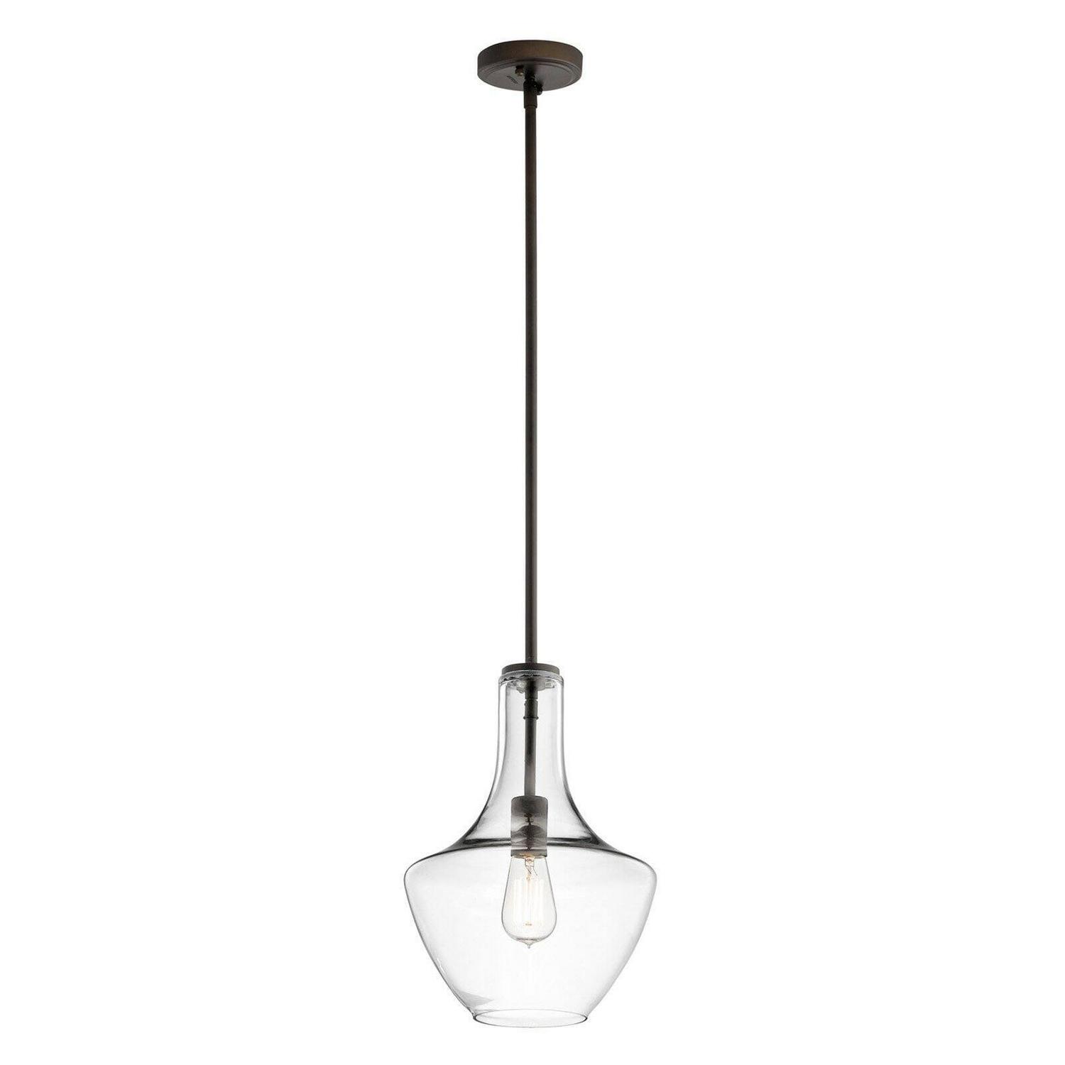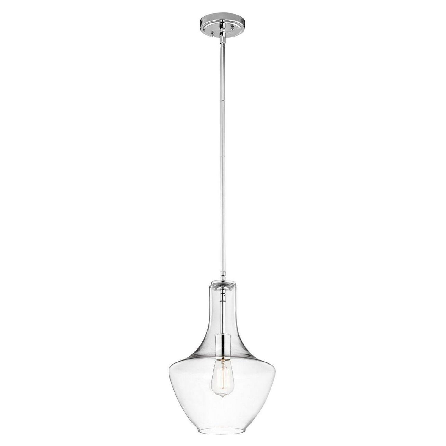 The artistic shaped glass shade on this Kichler Everly 42141 Pendant Light plays host to your choice of finish color. This pendant light would be perfect with an exposed filament bulb. It requires one 100-watt incandescent bulb (not included).