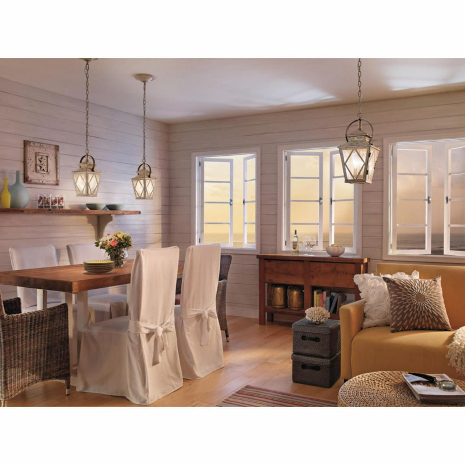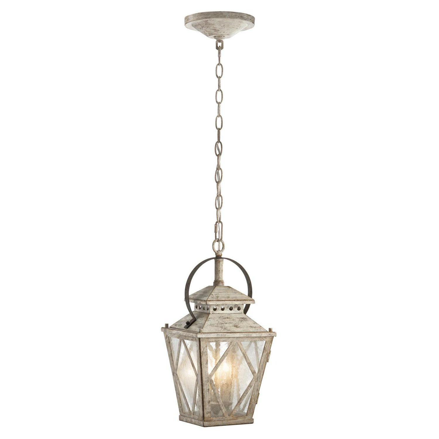 The shabby chic lantern design of this Kichler Hayman Bay 43258DAW Pendant Light includes a distressed antique white finish and diamond lattice over premium glass panels. This pendant light requires two 60-watt incandescent bulbs (not included).