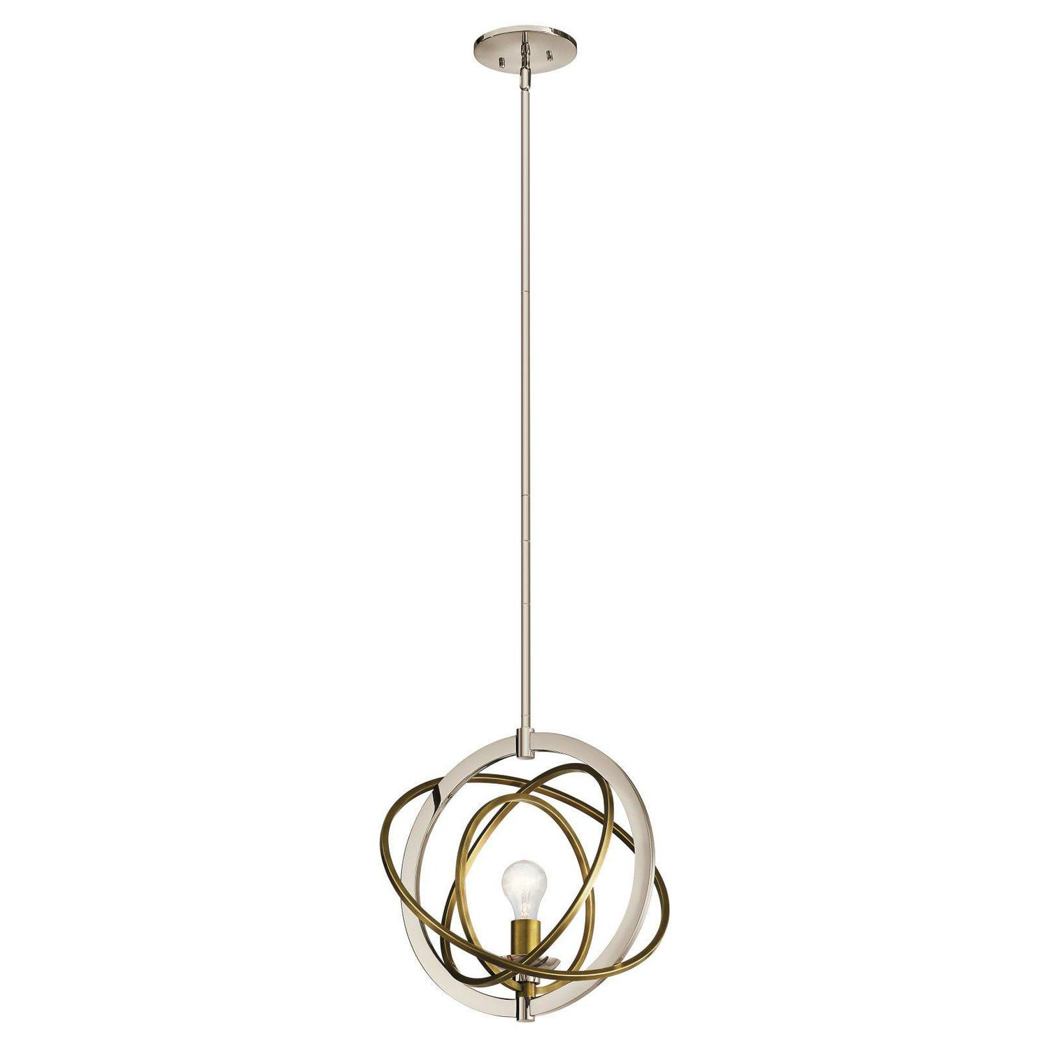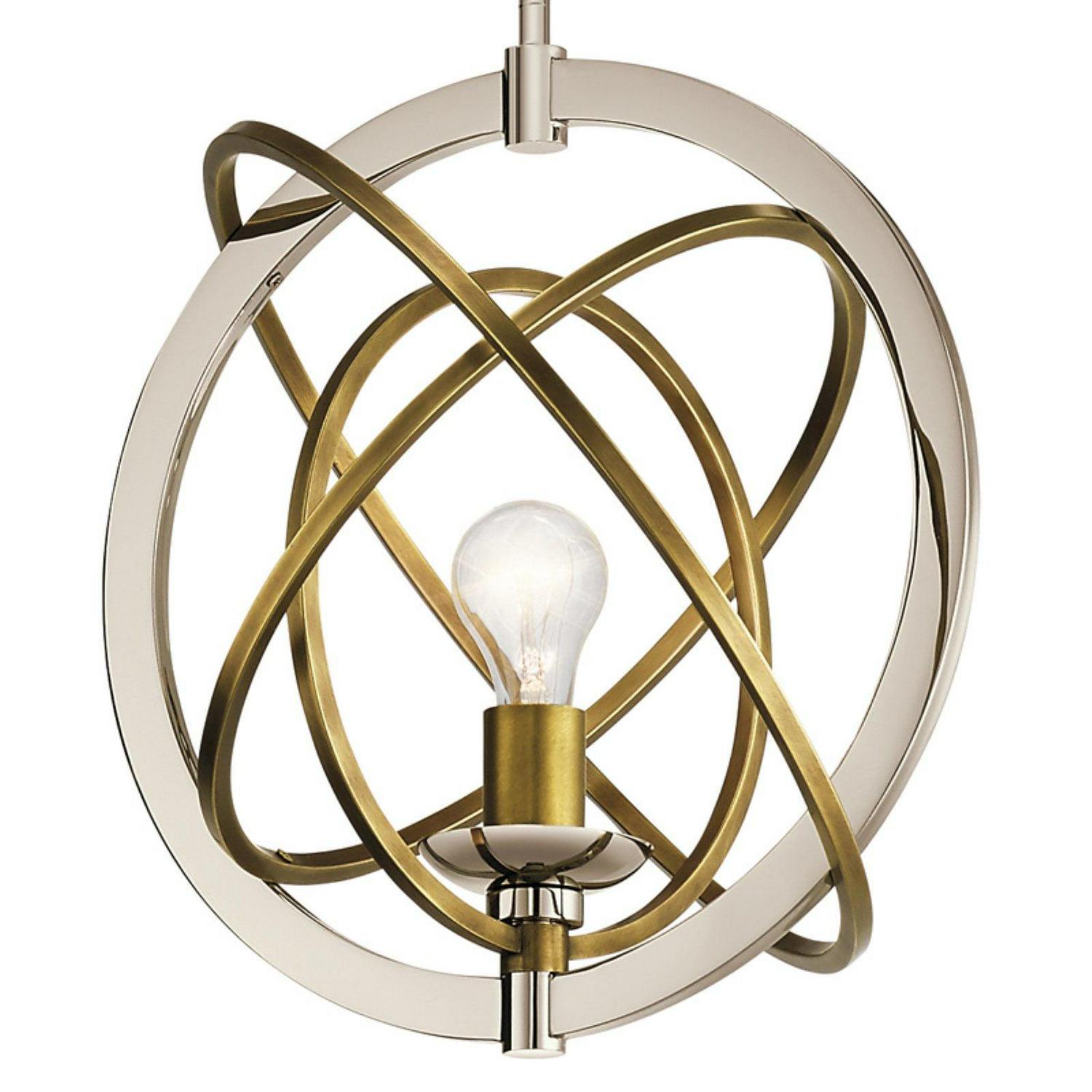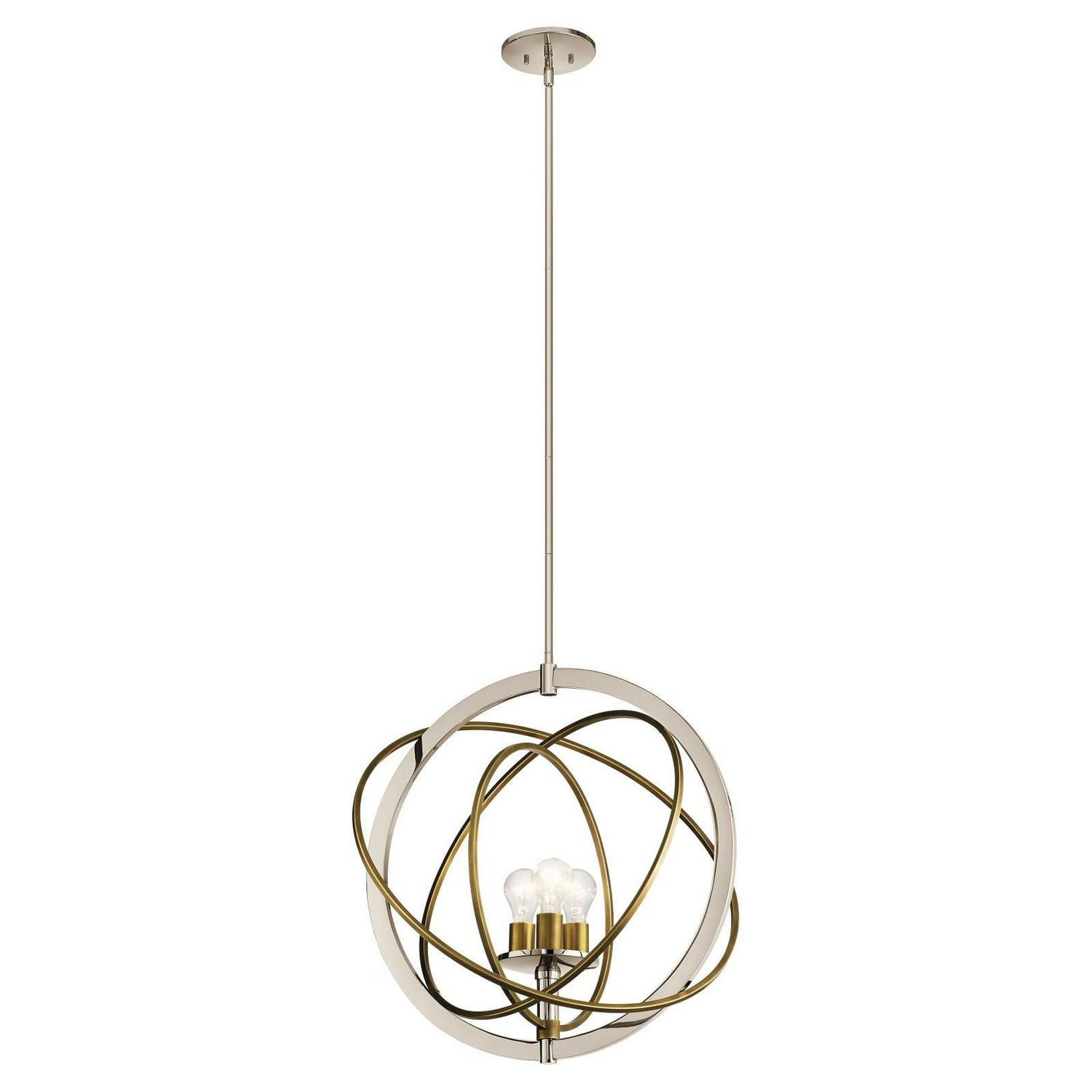 Give your new living room or hall design an enticing overhead accent with the Kichler Ibis 4420 Pendant Light. This pendant light is made from sturdy steel with a ring shade and angled, geometric gyroscopic rings. A polished nickel and brass finish tops the frame. The socket array is designed to host 75W A19 bulbs for a warm, penetrating glow. Bulbs are not included. Select among available size options.