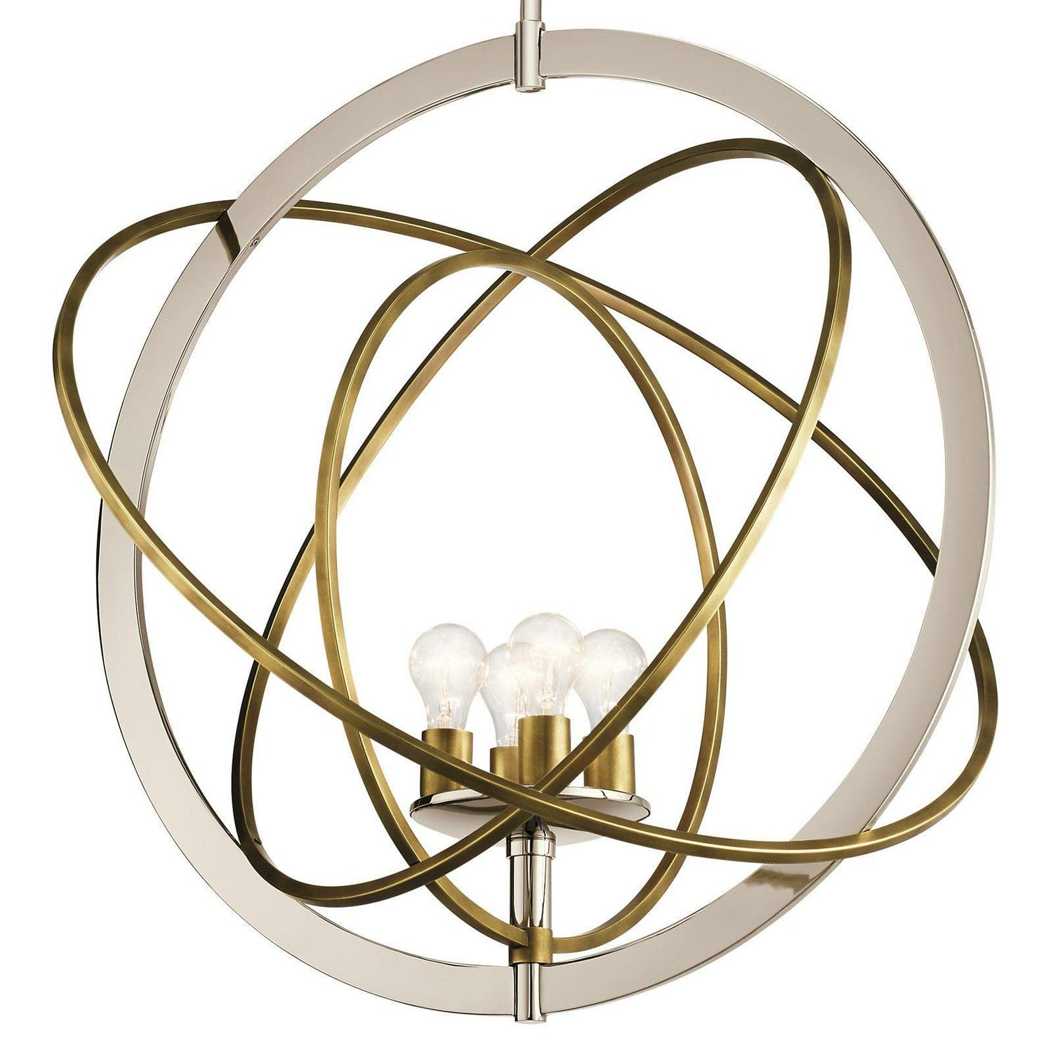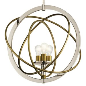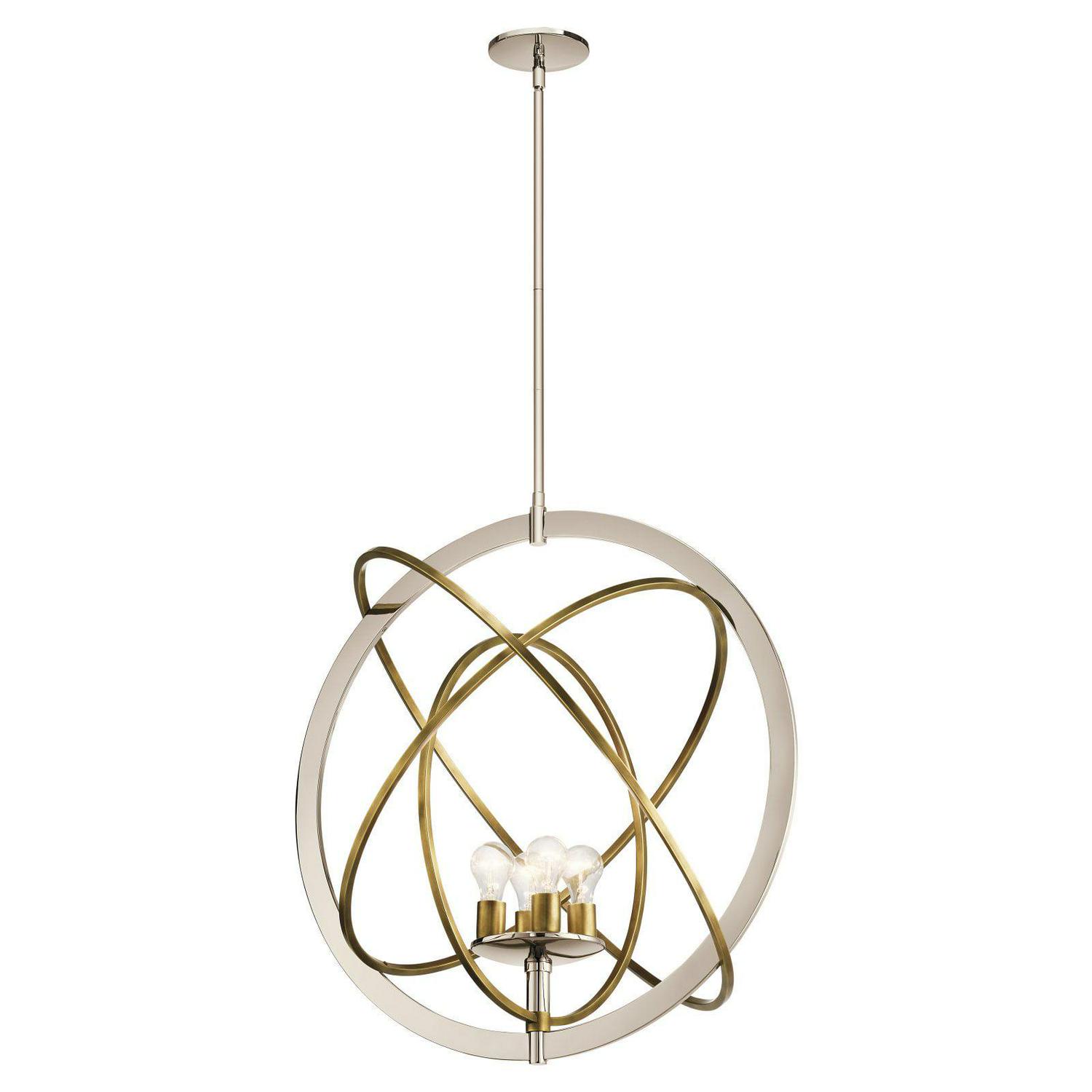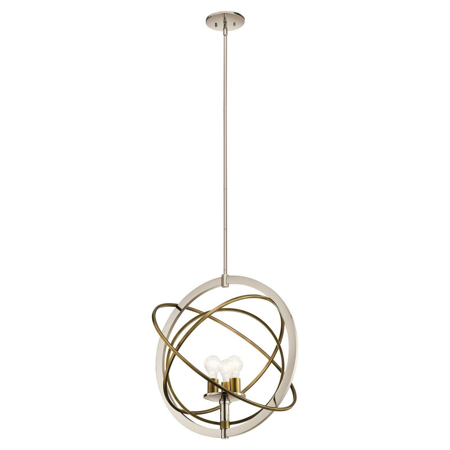 Give your new living room or hall design an enticing overhead accent with the Kichler Ibis 4420 Pendant Light. This pendant light is made from sturdy steel with a ring shade and angled, geometric gyroscopic rings. A polished nickel and brass finish tops the frame. The socket array is designed to host 75W A19 bulbs for a warm, penetrating glow. Bulbs are not included. Select among available size options.