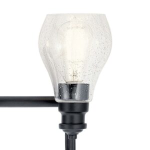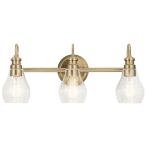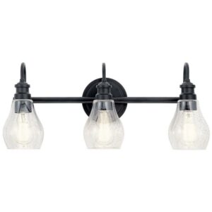 This 3-light bathroom vanity light from Kichler is a part of the Greenbrier collection and comes in a black finish. It measures 24″ wide x 10″ high. Uses three standard bulbs up to 100W watts each. This light would look best in the bathroom. Damp Rated. Can be used in humid environments like bathrooms or covered outdoor areas.