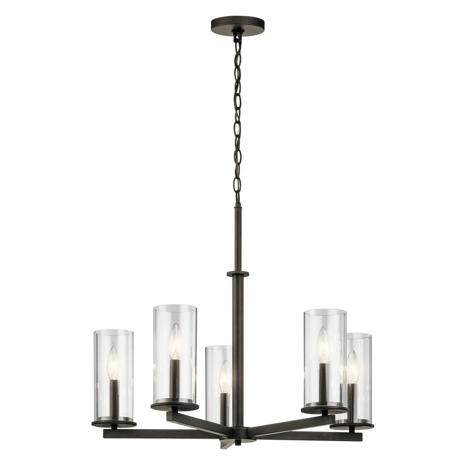 Kichler Lighting-43999OZ-Collection: Crosby, Material: Steel, Finish Color: Olde Bronze, Width: 26.25″, Height: 22.25″, Chain Length: 72″, Lamping Type: Incandescent, Number Of Bulbs: 5, Wattage: 60 Watts, Dimmable: No, Moisture Rating: Dry Rated, Desc: Streamlined and simple, This Crosby 5 light chandelier in Black delivers clean lines for a contemporary style. The clear glass shades enhance this minimalistic design. Chain Length: 72.00. ,-Crosby – 5 light Meidum Chandelier – with Contemporary inspirations – 22.25 inches tall by 26.25 inches wide-Olde Bronze Finish -Traditional Installation