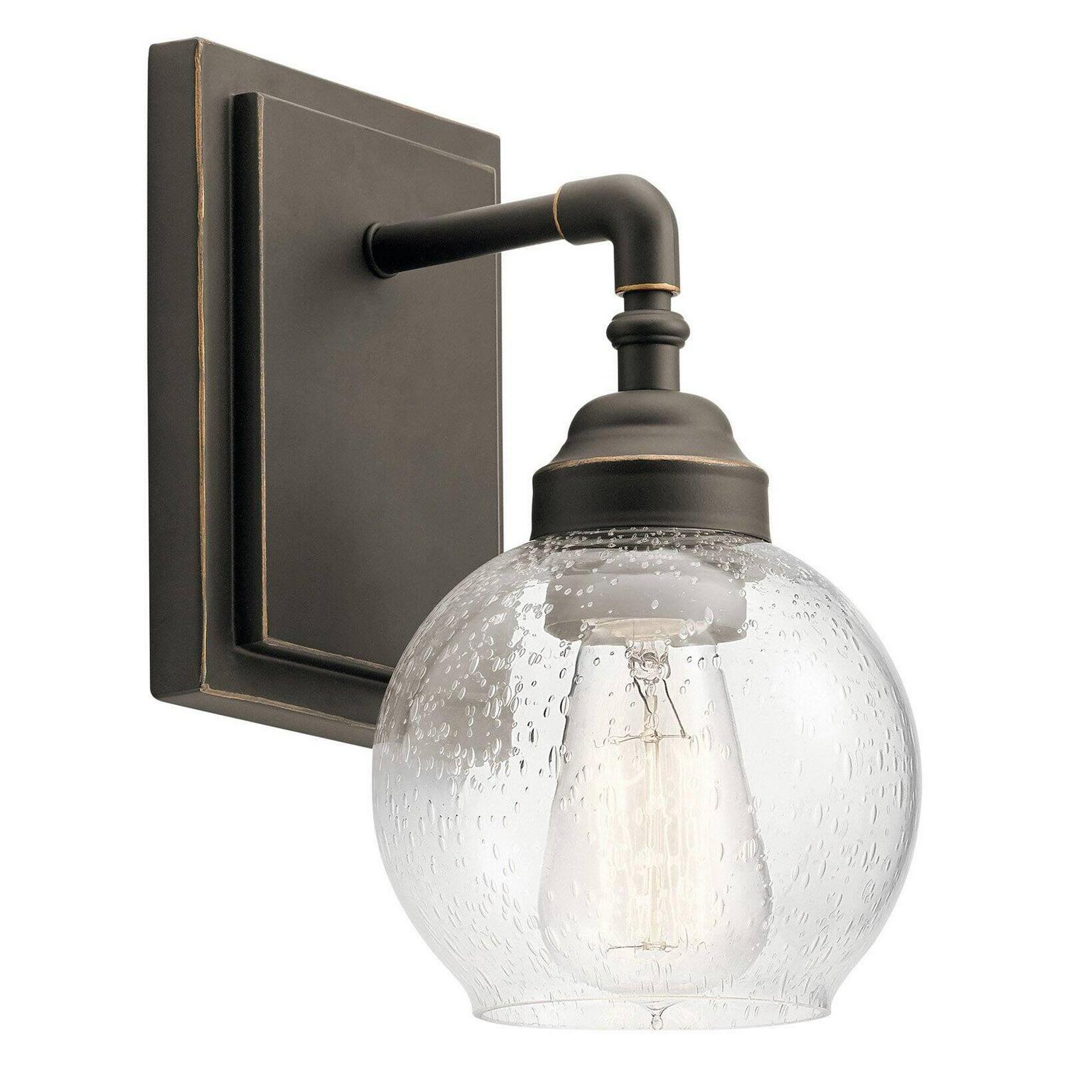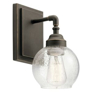 Kichler Lighting-45590OZ-Collection: Niles, Material: Steel, Finish Color: Olde Bronze, Width: 5.5″, Height: 10″, Depth: 7.25″, Height From Outlet Box: 3.25″, Backplate Width: 5″, Backplate Length: 6.75″, Lamping Type: Incandescent, Number Of Bulbs: 1, Wattage: 100 Watts, Dimmable: No, Moisture Rating: Damp Rated, Desc: This Niles’ Antique Pewter 1 light wall sconce’s globe style is reminiscent of fixtures found in historic metropolitan buildings, icons of the industrial era. Niles modernizes the look with clean lines for a look that works in any home. Mounting Direction: Up or Down / Back Plate Height: 6.75 / Back Plate Width: 5.00. ,-Niles – Transitional 1 Light Wall Sconce – with Vintage Industrial inspirations – 10 inches tall by 5.5 inches wide-Olde Bronze Finish