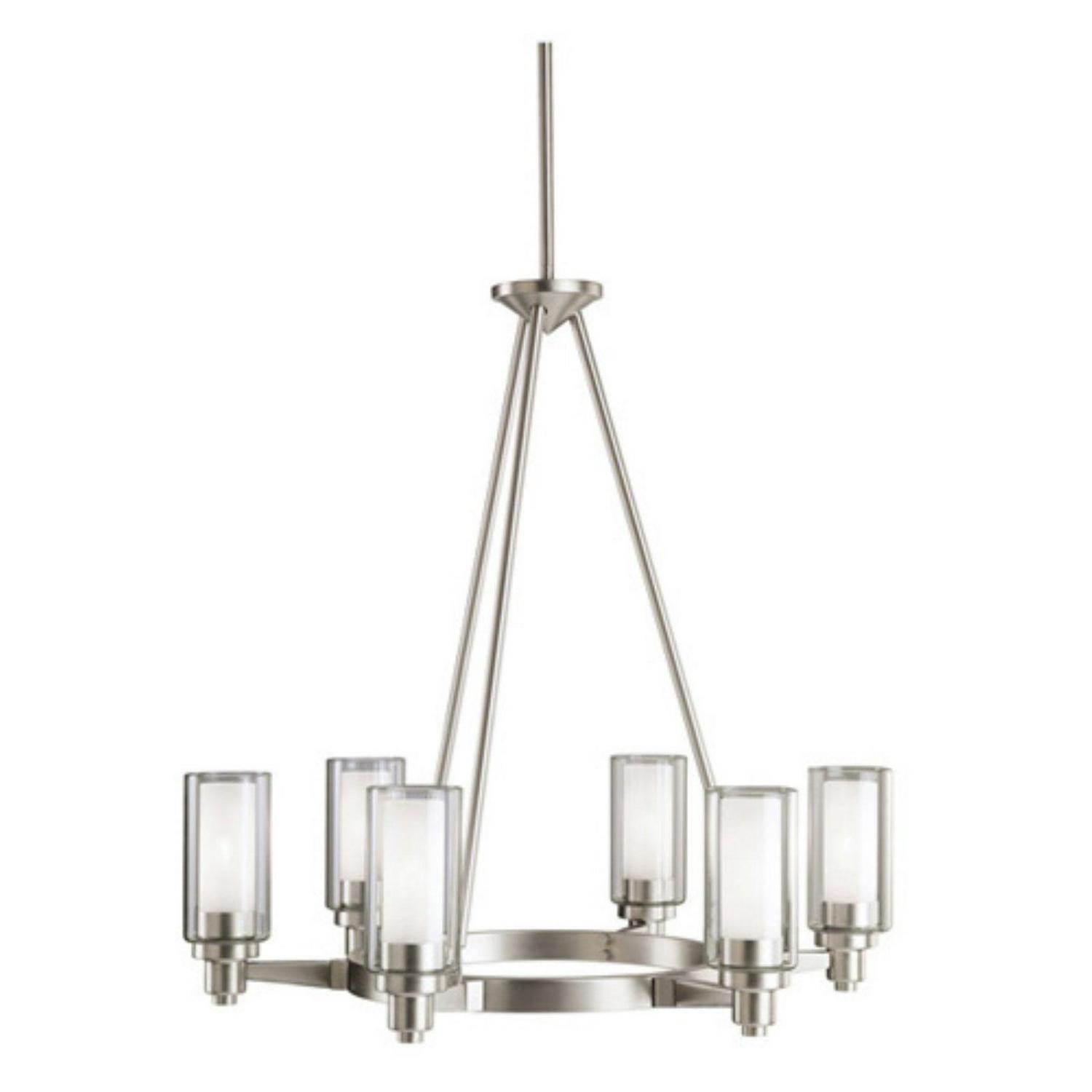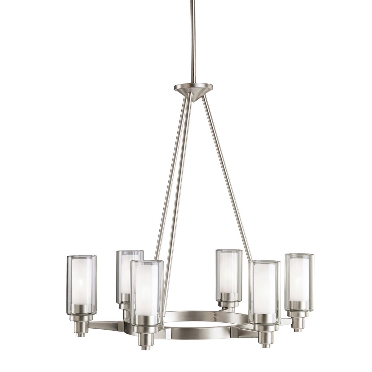 A circular theme is evident everywhere you look on the Kichler Circolo 2344 Chandelier – 26 in.. It has a circular metal frame, available in your choice of finish, with six lights arranged in a circle around it. Each light has a clear, cylindrical diffuser with an etched center to give added dimension and interest to this beautiful, minimalist chandelier design. This fixture comes with extra lead wire for installation.