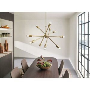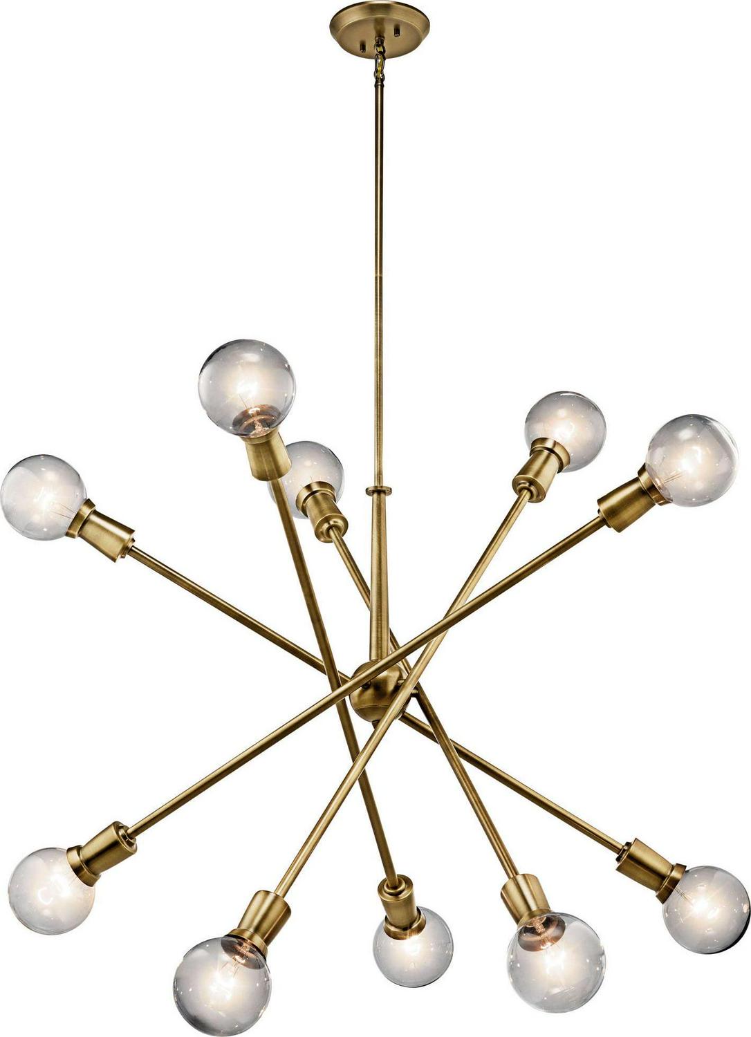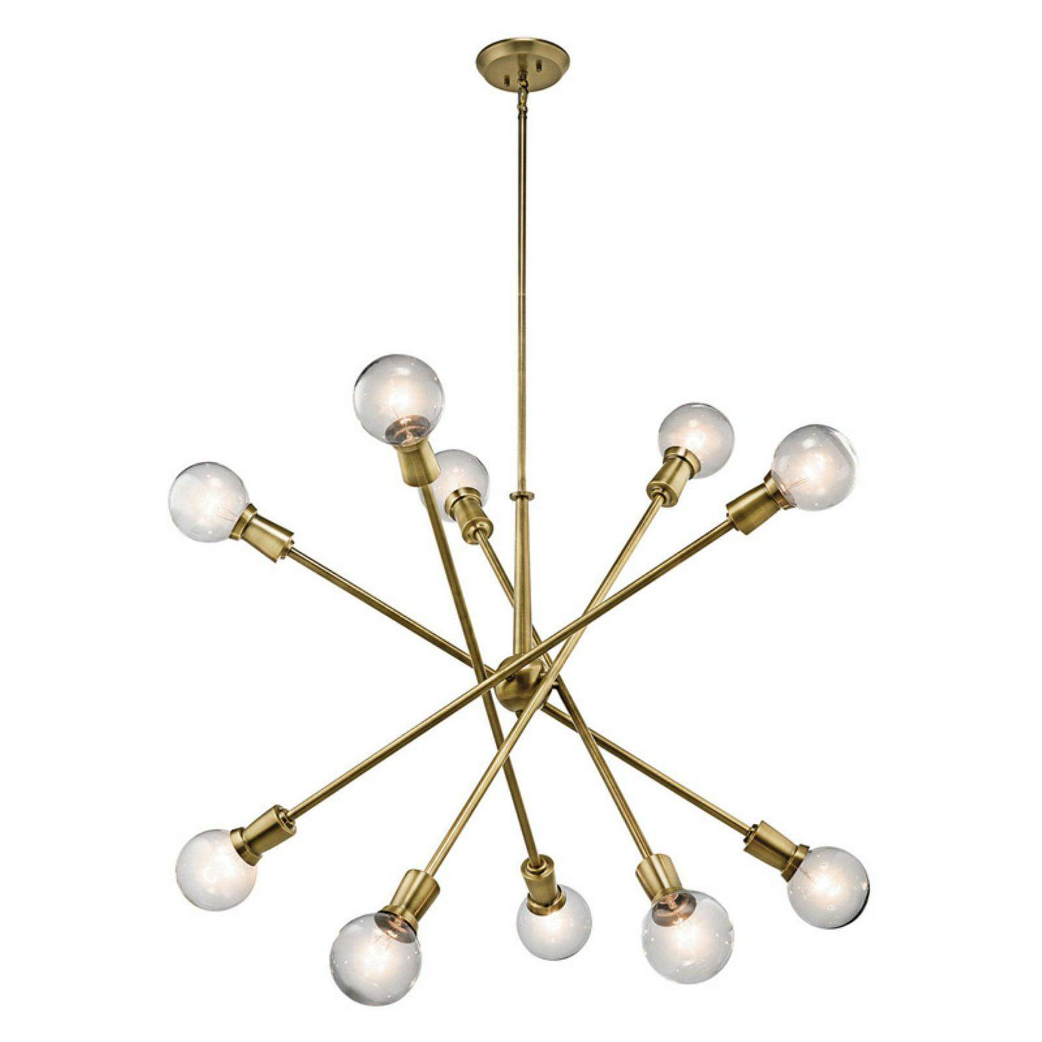 Kichler Lighting-43119NBR-Collection: Armstrong, Material: Steel, Finish Color: Natural Brass, Width: 47″, Height: 53.5″, Chain Length: 36″, Lamping Type: Incandescent, Number Of Bulbs: 10, Wattage: 100 Watts, Dimmable: No, Moisture Rating: Dry Rated, Desc: This Mid-Century 10 light chandelier in Black from the Armstrong collection features a in.sputnikin. design with adjustable arms allowing you to customize the light for just the right look. Sloped Ceiling Adaptable: Yes / Chain Length: 36.00. ,-Armstrong – 10 Light Large Chandelier – with Contemporary inspirations – 53.5 inches tall by 47 inches wide-Natural Brass Finish -Traditional Installation