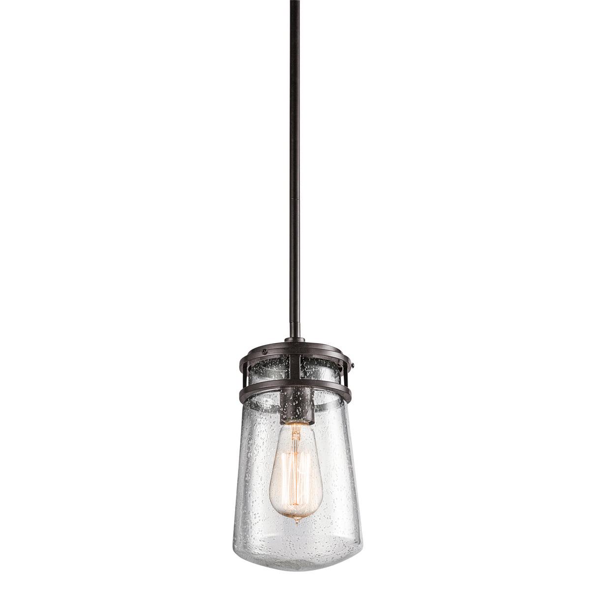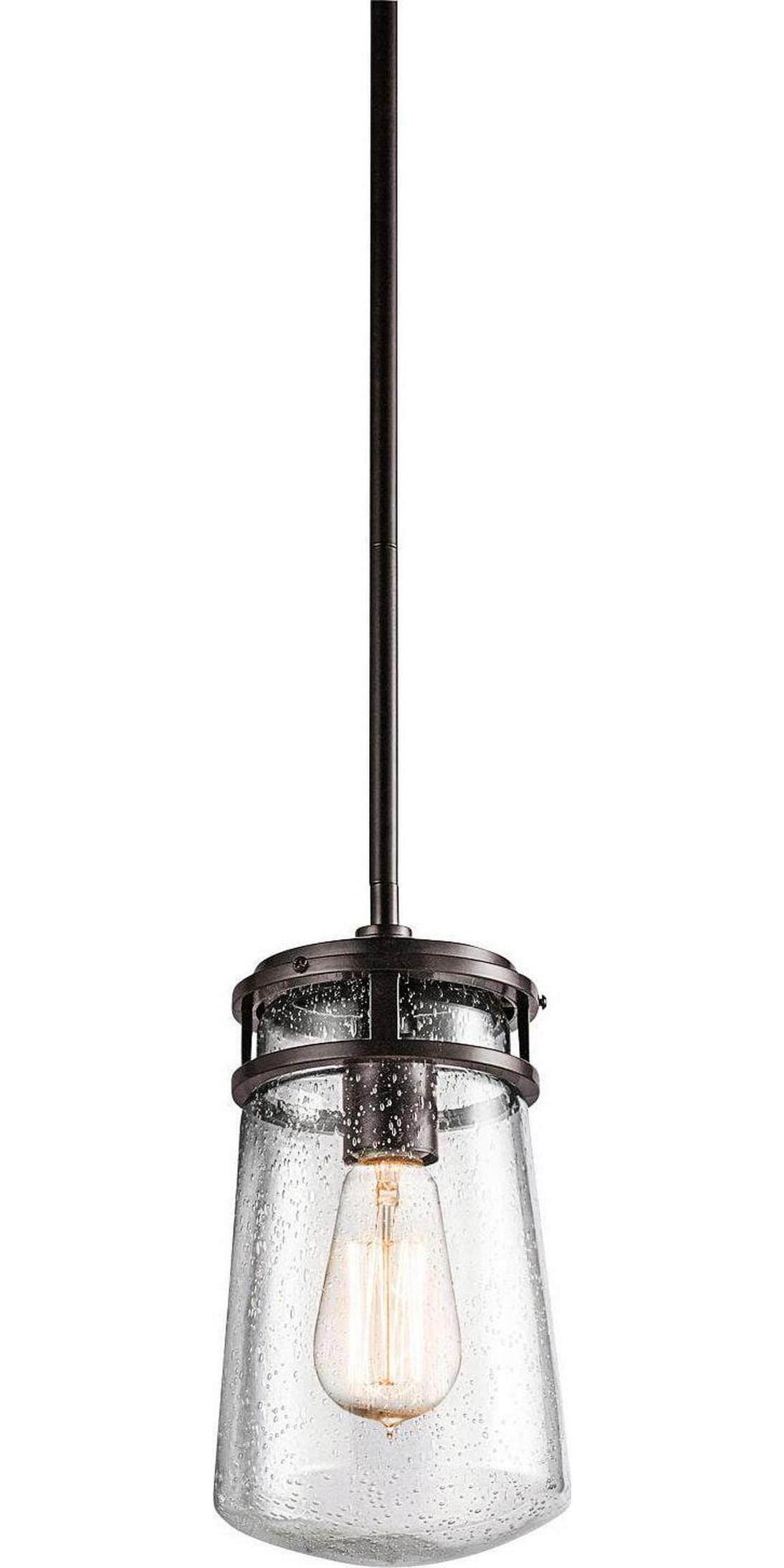 Kichler Lighting-49447AZ-Collection: Lyndon, Material: Aluminum, Finish Color: Architectural Bronze, Width: 6″, Height: 11.75″, Chain Length: 36″, Lamping Type: Incandescent, Number Of Bulbs: 1, Wattage: 100 Watts, Dimmable: No, Moisture Rating: Damp Rated, Desc: The Lyndon(TM) 11.75in. 1 light pendant features a classic look with its Architectural Bronze(TM) finish and clear seeded glass. The Lyndon(TM) pendant works in several aesthetic environments, including transitional and nautical. Sloped Ceiling Adaptable: Yes / Chain Length: 36.00. ,-Lyndon – 1 light Outdoor Pendant – with Coastal inspirations – 11.75 inches tall by 6 inches wide-Architectural Bronze Finish
