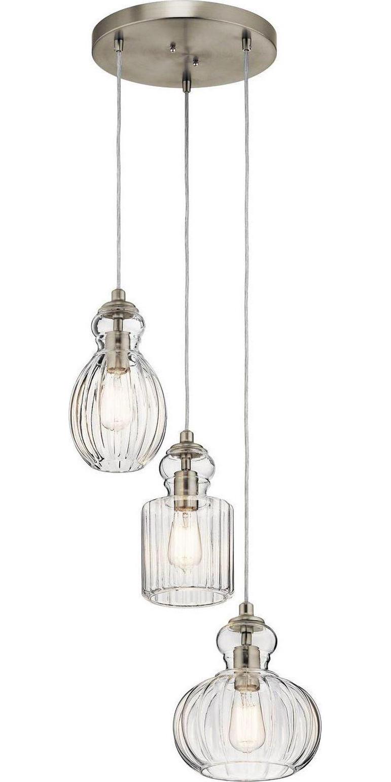 Kichler Lighting-43952NI-Collection: Riviera, Material: Steel, Finish Color: Brushed Nickel, Width: 18″, Height: 11″, Lamping Type: Incandescent, Number Of Bulbs: 3, Wattage: 75 Watts, Dimmable: No, Moisture Rating: Dry Rated, Desc: Inspired by antique, vintage perfume bottles, Riviera’s 3-light pendant in Brushed Nickel is the perfect touch of retro design. The fluted glass removes easily for cleaning.,-Riviera – 3 light Pendant – 18 inches wide-Brushed Nickel Finish