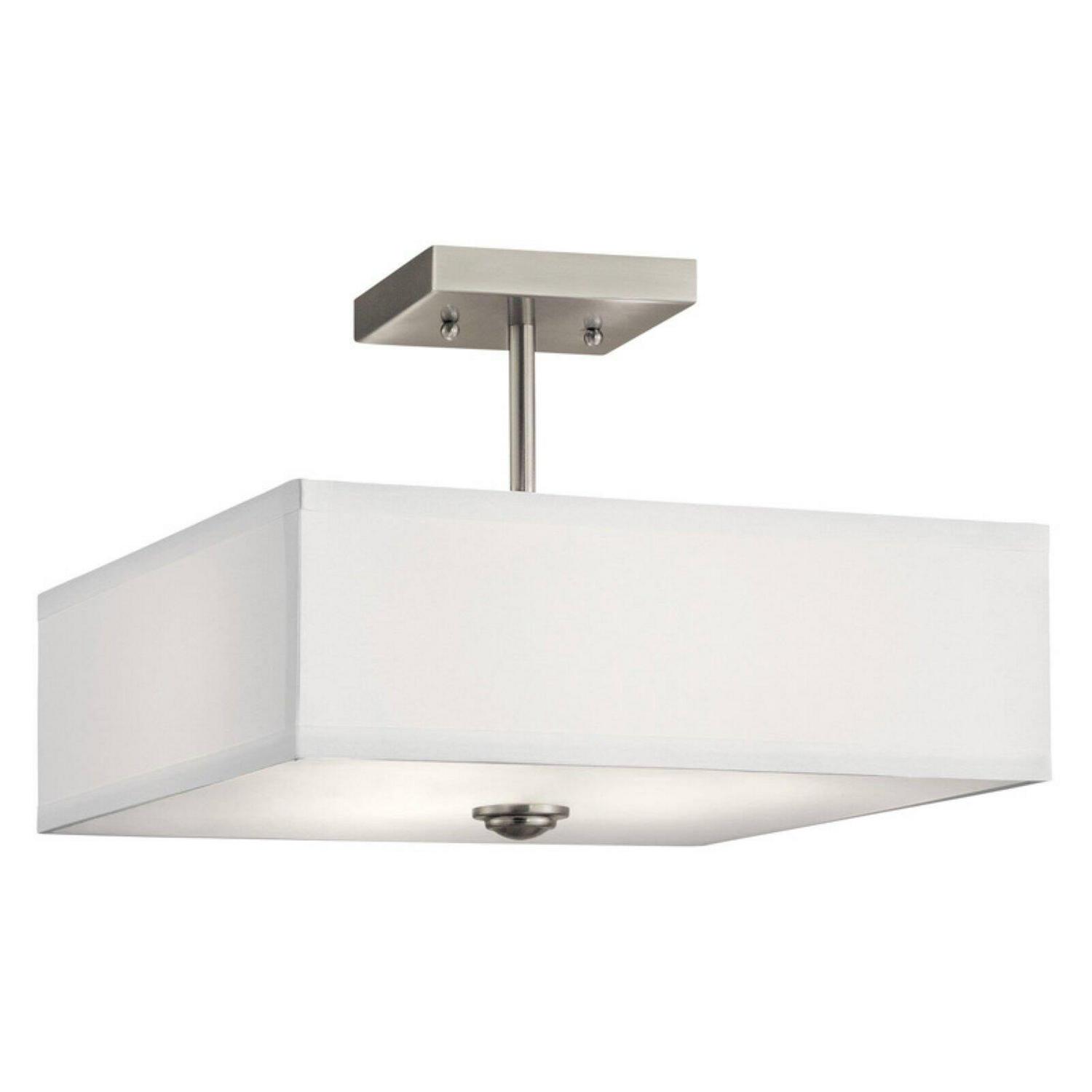 Collection: Shailene, Material: Steel, Finish Color: Brushed Nickel, Width: 18″, Height: 11″, Lamping Type: Incandescent, Number Of Bulbs: 3, Wattage: 75 Watts, Dimmable: No, Moisture Rating: Dry Rated, Desc: The straight lines and up-sized Satin Etched glass of this Brushed Nickel 18in. 3-light semi flush ceiling light from the Shailene(TM) collection create the perfect casual look for the updated urban lifestyle., – – Shailene – 3 Light Semi-Flush Mount – 18 inches wide-Brushed Nickel Finish –