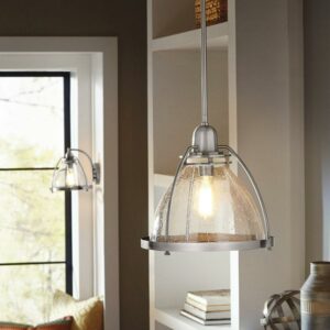 The minimalist aesthetic of this Kichler Silberne 43737 Pendant makes it a versatile light fixture that can work well in multiple styles. Its clear glass shade disperses light beautifully and the metal frame comes in your choice of available finish. Requires one 100-watt bulb (not included).