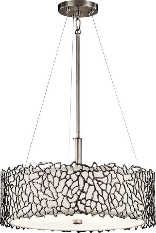 The coral-inspired Kichler Silver Coral 43346CLP Pendant Light boasts a lacy cutout design, classic pewter finish, and frosted diffuser. This pendant light requires three 100-watt incandescent bulbs (not included).