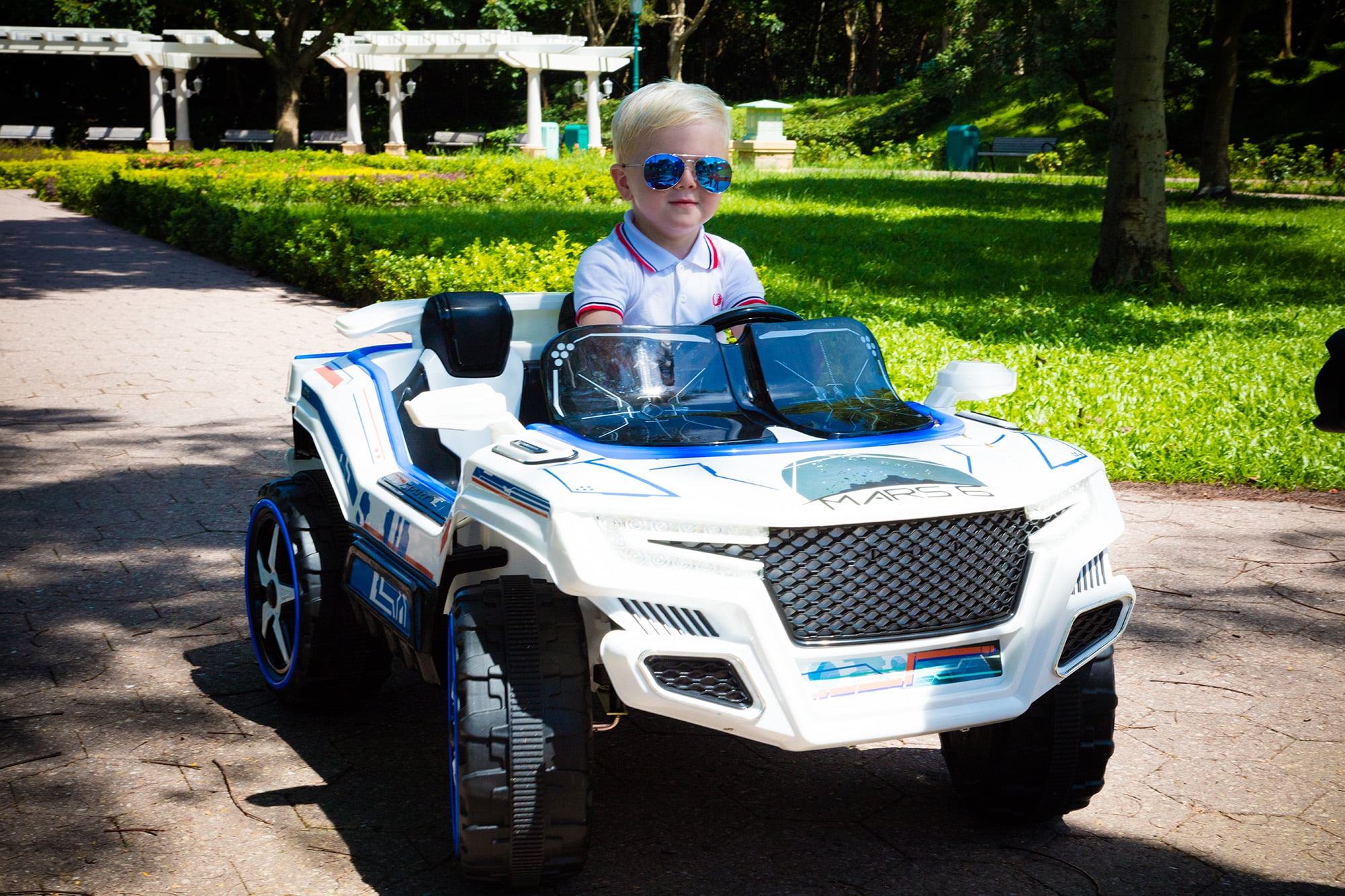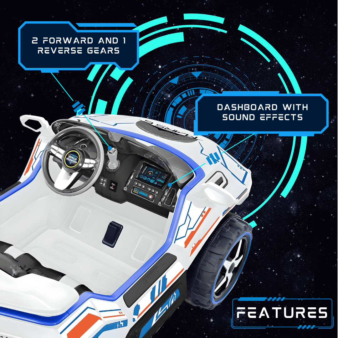 Your child will be ready for their next big venture in this Kid Motorz Dune Runner Space Adventure 12V Battery-Powered Ride-On. This rollplay ride on will bring your kid to space exploration once they enter. Our 2 seater (each seat width 10″) child ride on car comes with 12V motors and features two speeds, 2.5 & 5 mph and 2.5 mph in reverse, sound effects, daytime running LED light and foldable mirrors. Which give your child a 50-60 MINUTES space exploraion experience per charge. The electric car offers a rechargeable, lead-acid battery. He/She is sure to enjoy the action-packed fun to go for a ride on this Dune Runner Space Adventure. The 12-volt ride-on is intended for 2 riders weighing upto 130 pounds in total or less and is recommended for ages three and up.