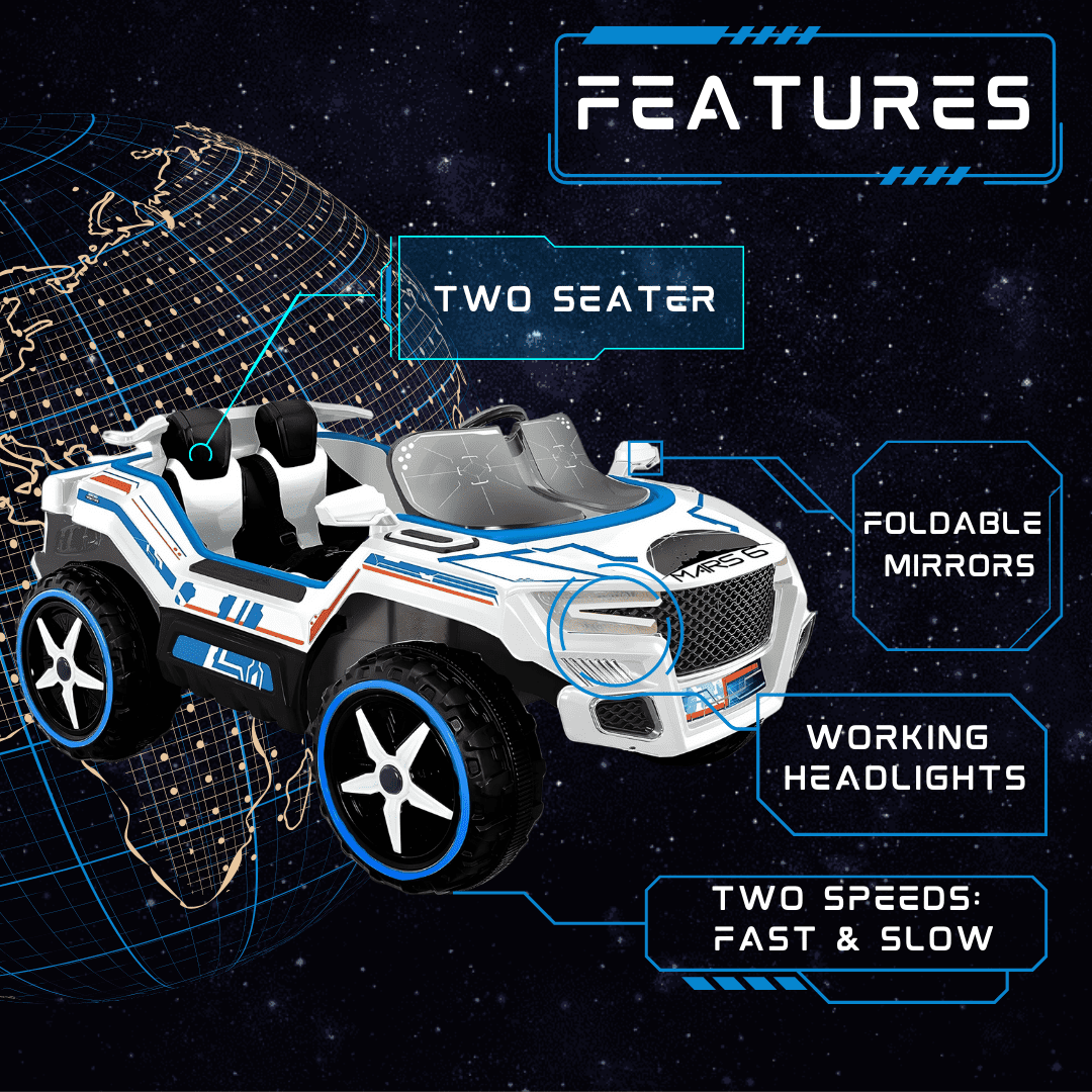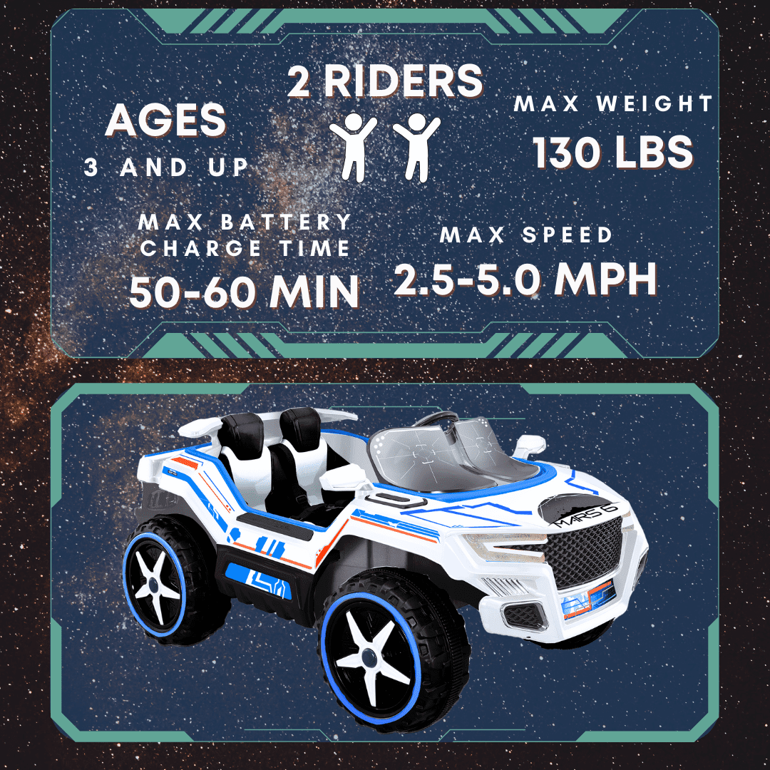 Kid Motorz 12V Dune Runner Two-Seater Ride-On, Space Version: 2-seater (each seat width is 10″) Comes with 12V motors Features 2 speeds, 2.5 and 5 mph and 2.5 mph in reverse Sound effects, daytime running LED light and foldable mirrors Gives your child a 50-60 minute space exploration experience per charge Rechargeable, lead-acid battery