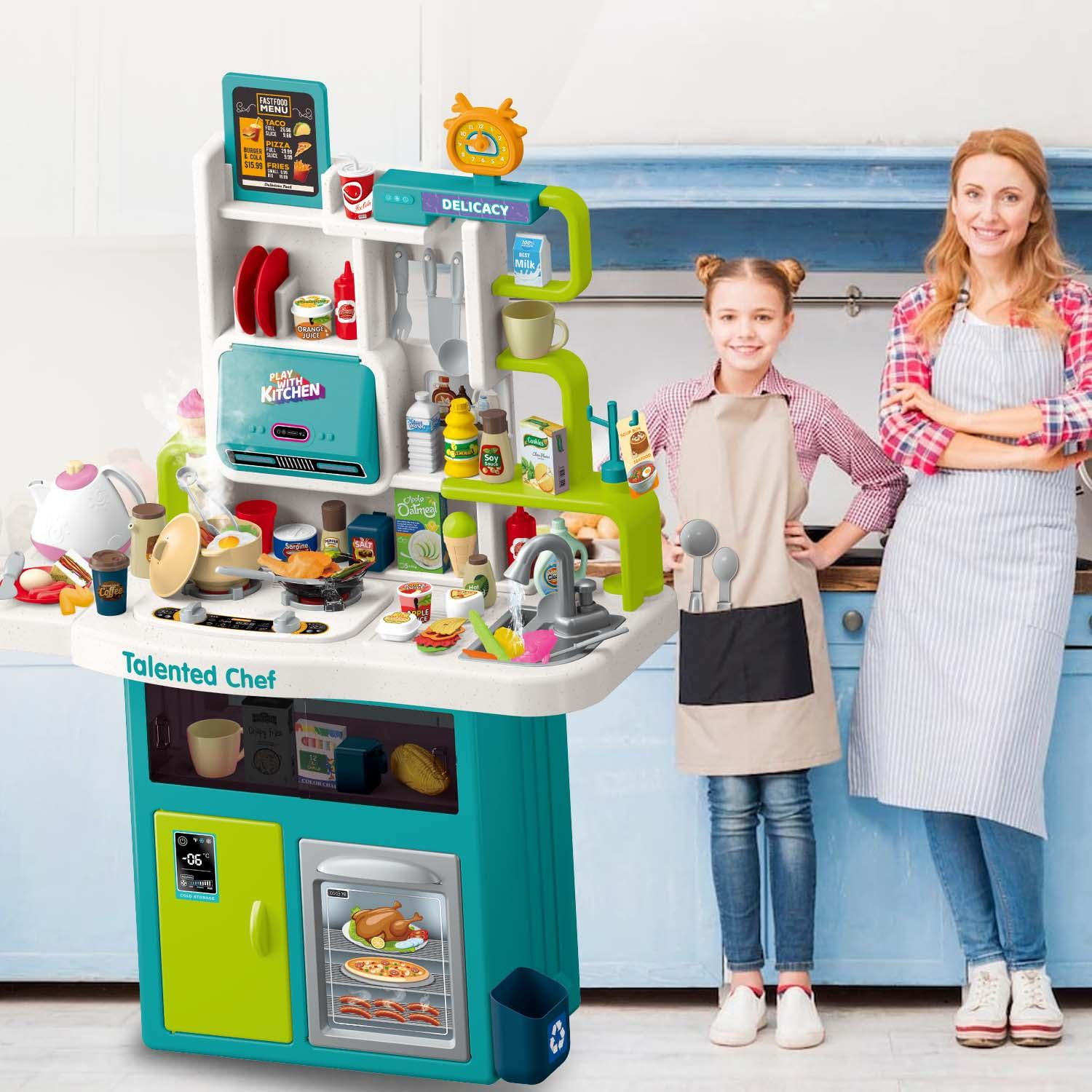 Toy Kitchen Set For Kids : A beautiful mini kids kitchen includes electronic play stove, play sink with running water, all kinds of play food and utensils and other kitchen accessories. Besides, there are several various storage space for store kitchen items, such as dessert shelves, refrigerator, an oven and so on. Electronic Stovetop with Steam & Sound & Light: Place a pot or pan on the stove and turn it on, the stove will light up and make a sound to mimic the real firing stove.Additionally, use the red bottle to add water into the hole of stove and spray will comes out while cooking, adding a lot more fun. Kitchen Sink with Water Circulation System: The play sink toy allows kids to wash play foods and do the dishes. Push the button behind the water tap and water will come out. With water circulation system, kids’ environmental consciousness can be raised in an early age. Kitchen Toys To Play Pretend Kitchen : With multi-functional kids kitchen set, kids can have an interesting role-play game, being a great chef. Parents can be their guests and play a wonderful family game together. What’s more, kids’ creativity and hands-on skill will also be increased during the game. Realistic Kitchen Set Toys of High Quality : The play kitchen with sound and lights is made of safe, child-friendly and durable material.Height 35 inches,whole figure is also well designed, glaring with vitality and childlike delight,which will absolutely bring great fun to your little guys.