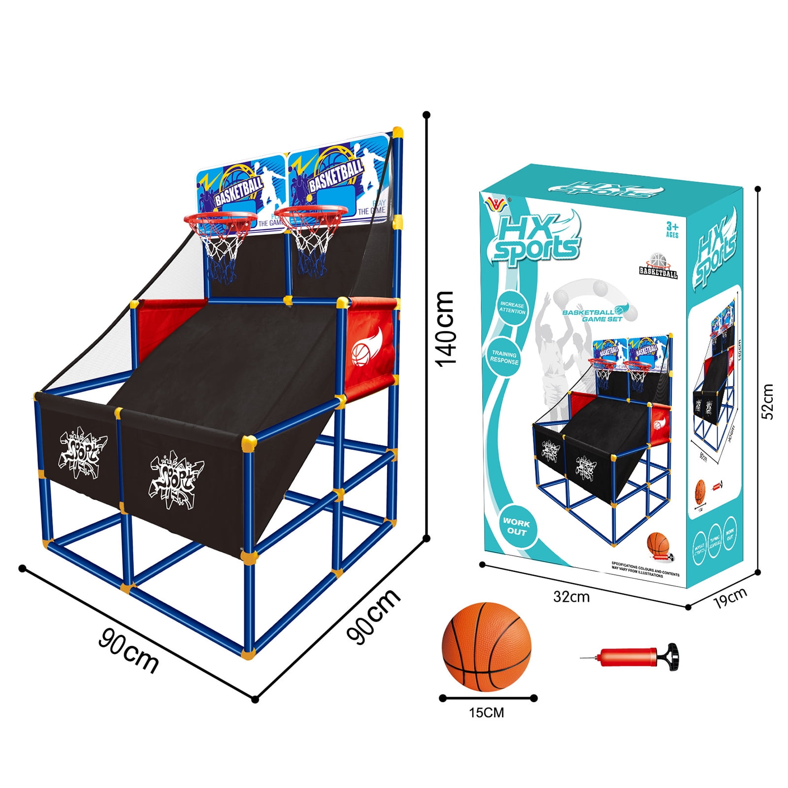 Sturdy and Safe Design: The arcade game is built with thickened PVC tubes and features rounded corners, enhancing both stability and safety for children. Durable Play Components: Equipped with impact-resistant backboards, solid basket rims, and durable nets designed to withstand thousands of shots, ensuring long-lasting fun and playability. Convenient Storage and Setup: Includes a storage compartment beneath the unit to help keep play areas neat and tidy, coupled with a tear-resistant ball return ramp. The design allows for quick and easy assembly. Comprehensive Set: Comes with two basketball hoops, two basketballs, and an inflation pump, allowing multiple players to engage in games simultaneously, which is great for developing competitive and cooperative play skills. Indoor and Outdoor Play: Perfectly suitable for both indoor and outdoor use (weather permitting), providing flexible play options for various environments.