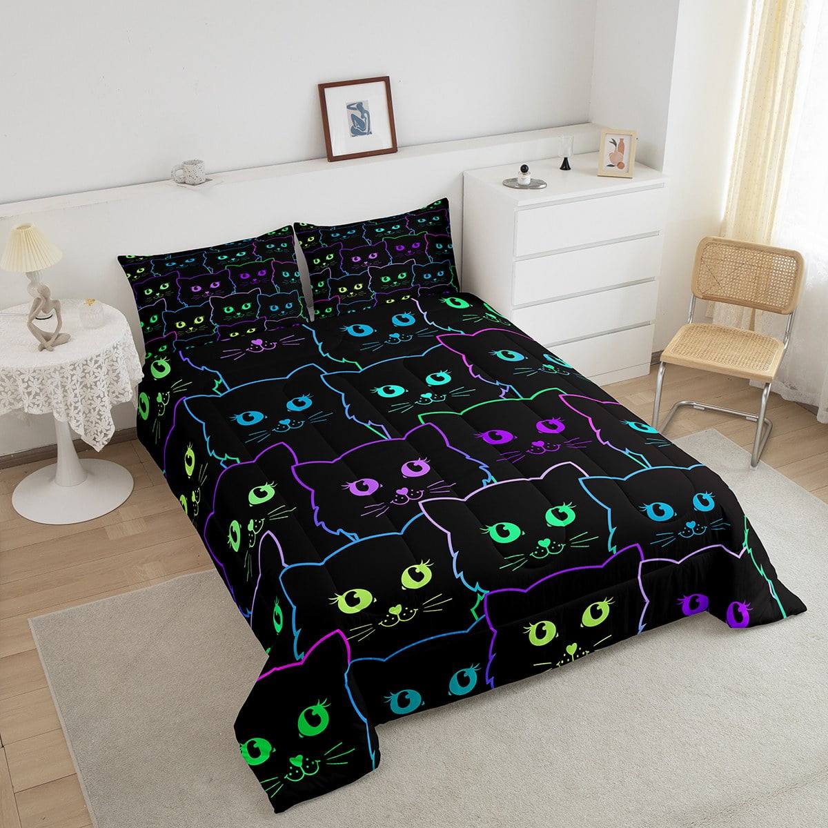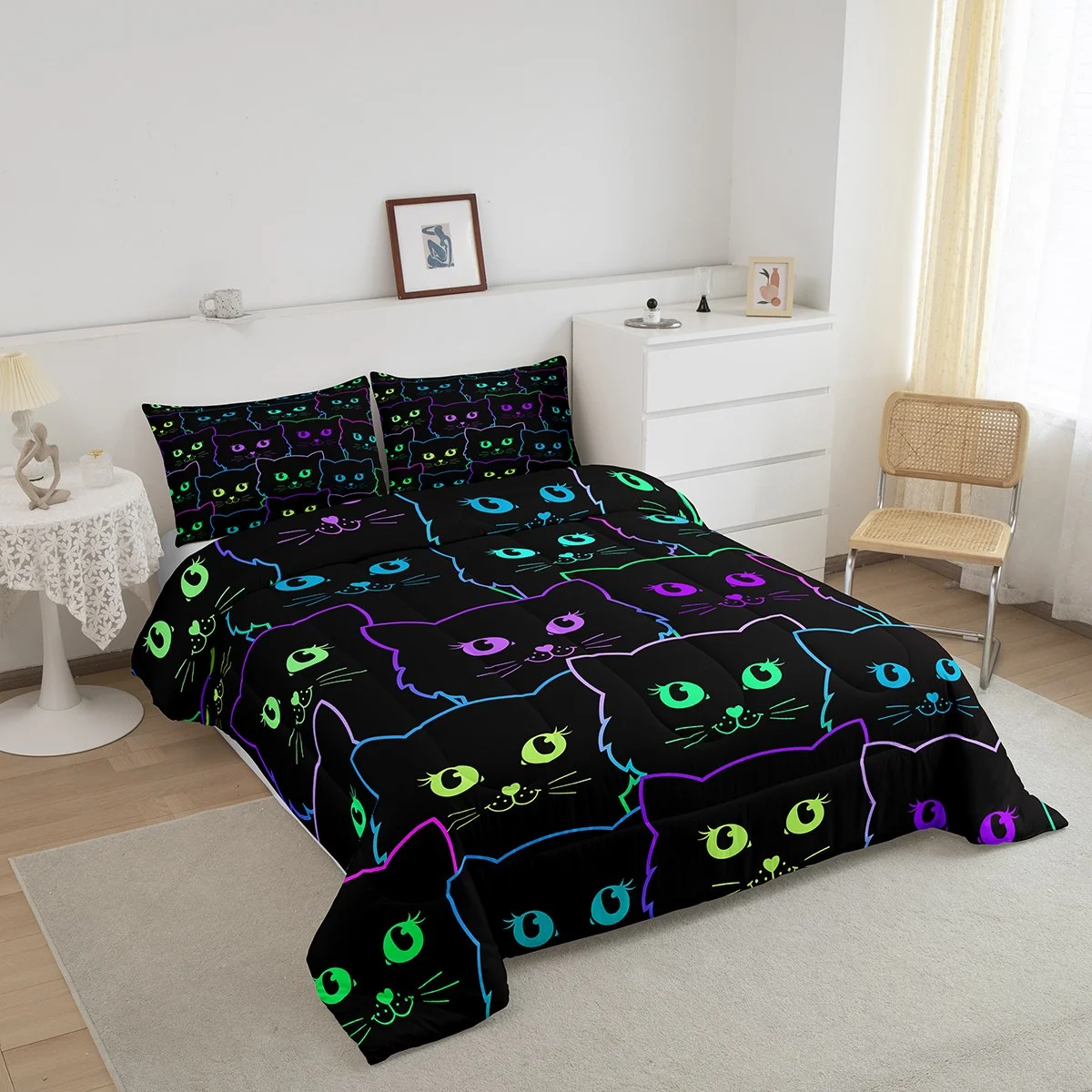 Bedding Sets Full Size Cats Comforter Set Cartoon Pet Animal Quilted Duvet Set Black Neon Kawaii Kitten Bed Comforter Set Teens Gradient Line Cat Gifts Duvet Insert 3Pcs