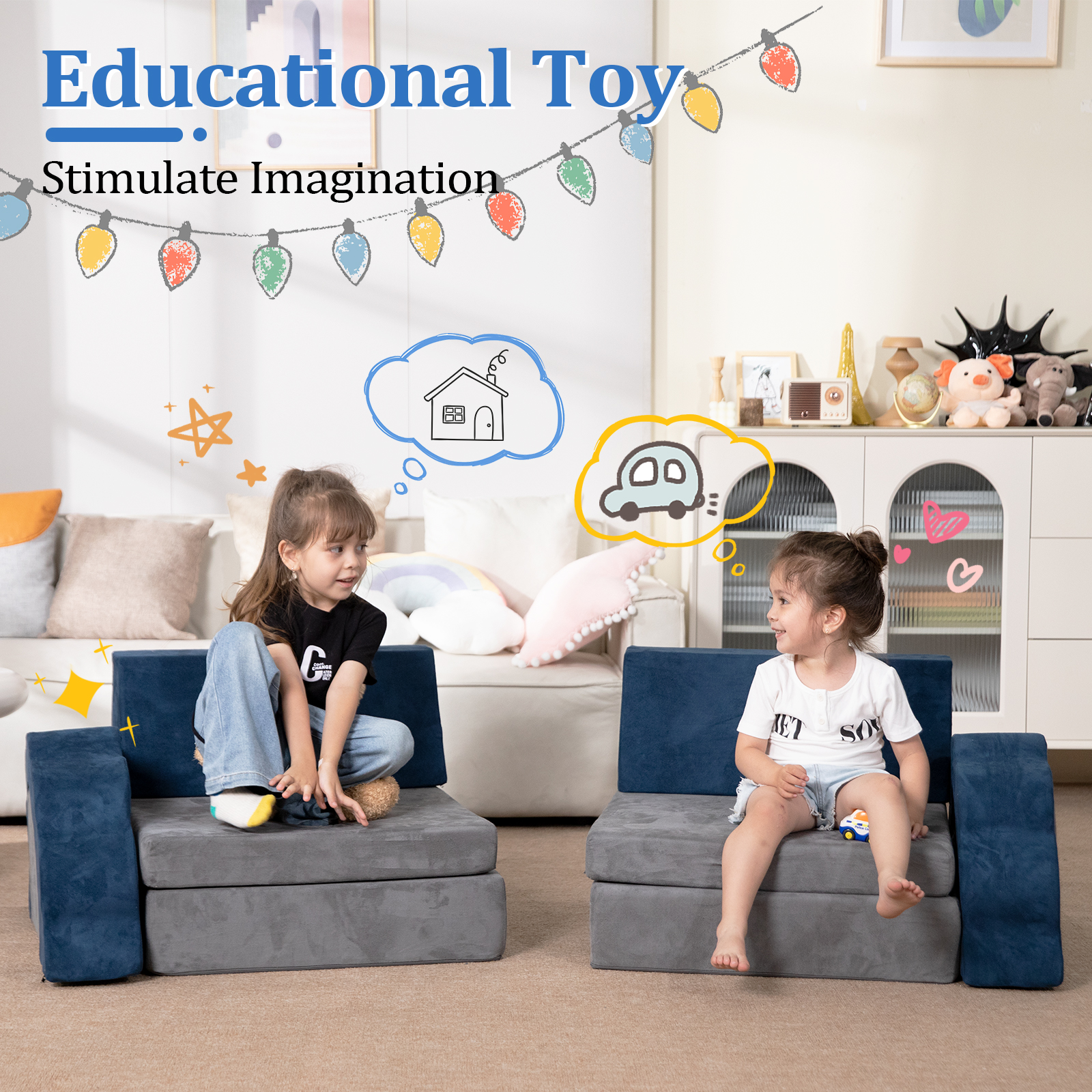 10PCS Multifunctional Kids Couch: This kids couch features 10 pieces, including 4 foldable seats, 2 back cushions and 4 flower-shaped cushions. These 10PCS foam play couch can not only be two leisure chairs, but also be a playhouse, tunnel, castle, car, ball pit or anything that children can imagine. Suitable for kids to play, climb, etc. Imaginative Furniture for Family: This toddler couch is a decorative modular sofa for bedroom, playroom, nursery, kids room and so on. The whole family can spend good time together and be entertained with our kids play couch. This modular play couch is a perfect playroom addition for playing and inspiring. It can stimulate children’s imagination, creativity and social skills, make children more active and optimistic. Easy to Clean/Setup: This kids couch sofa is made of high density foam. And the soft slipcover has zippers that makes it easy to remove and machine wash. Couch compressed in a box for easy shipping. When the package is opened, this foam play couch will be deformed and thin due to compression packaging. Don’t worry, once unboxed the couch playset, please kindly open all the zippers immediately, it may take at least 24 hours to restore to its original thickness and shape. Quality Assurance: This toddler couch is comfortable and durable. High elastic and sturdy foam can withstand adventurous play activities. The sofa’s foam core stands up to years of play, providing a soft, low-impact surface for kids to jump, climb and fall on, with no harmful hard edges or sharp corners for them to bump into! It is resistant to shrinking, fading and shedding. If your baby is learning to walk or climb, this kids foam couch will give you peace of mind. A Practical and Wonderful Gift: Every child will love this 10PCS modular kids couch! Kids can create different forms, shapes or hideouts for endless adventures they want to experience, and they can be stacked as and stored easily after play. Parents will get more chance to accompany kids to enjoy their little world! Perfect for birthday gifts, Christmas gifts and baby shower gifts.