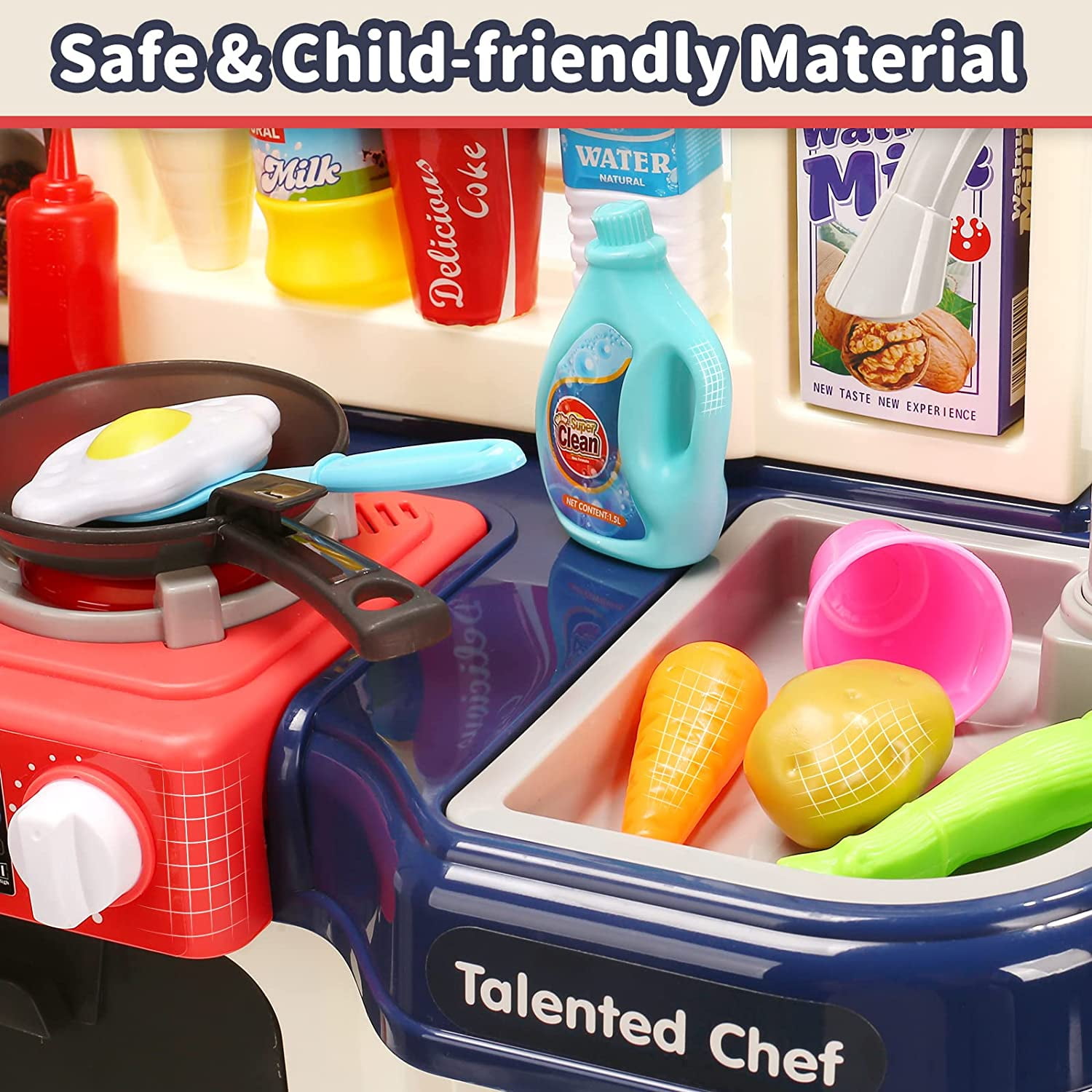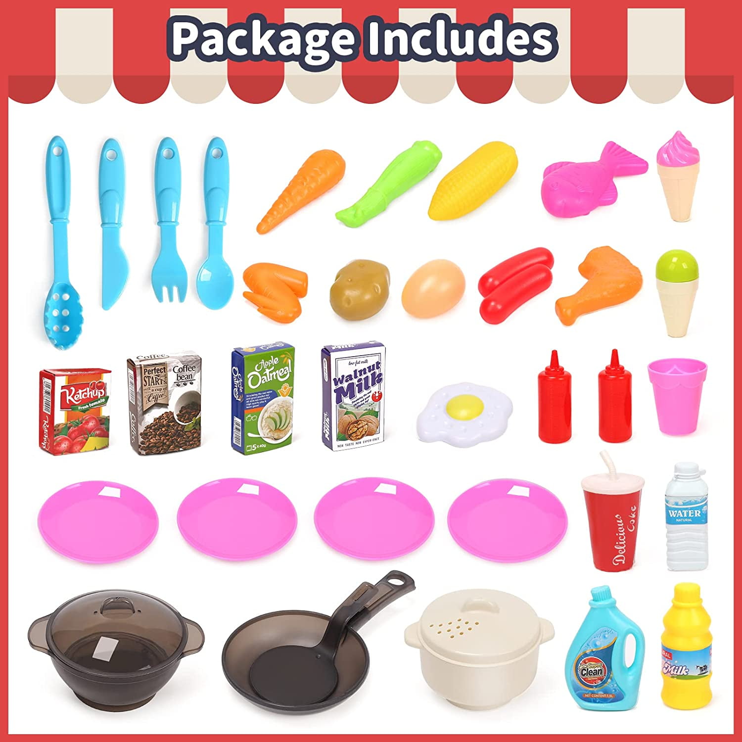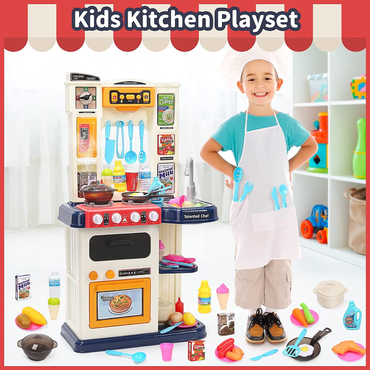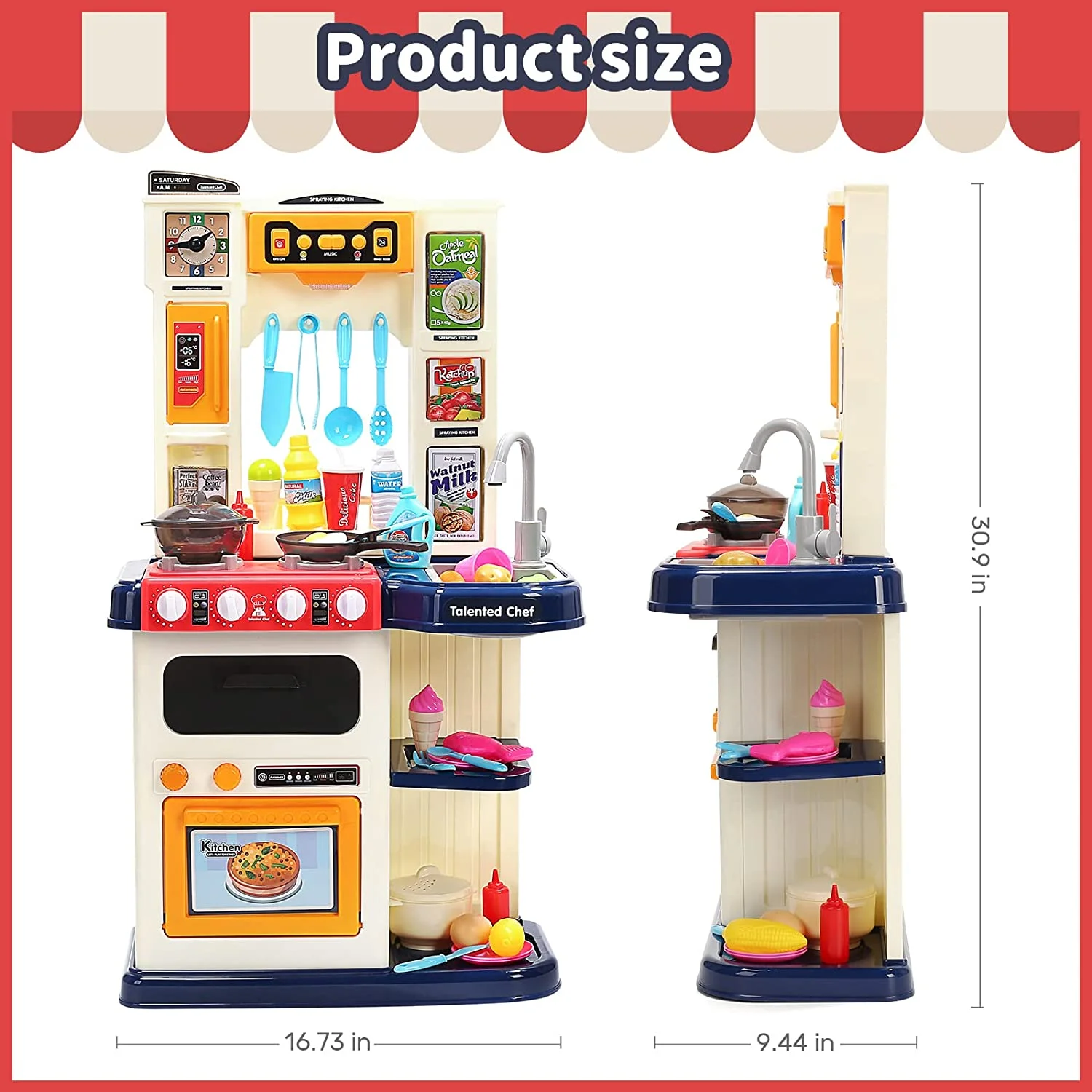 [Toy Kitchen Set for Kids] With incredibly lifelike equipment and accessories, such as an electronic burner with steam, a play sink with running water, play food, several types of kitchen accessories, and different cooking tools, this kitchen playset provides an authentic cooking experience for your kids. For hours of pretend play enjoyment, kids can pretend to cook as though they are using actual appliances. [Kitchen Sink with Water Circulation System] Fun steam function is included on the pretend stove burner. There will be white vapour when your child cooks. A water circulation system is used by the water sink toy to conserve water. Kids can clean up after themselves and wash pretend food. A musical toy is also placed in the kitchen’s range hood toy. It can provide music, lights, and a sound. Role play is made more enjoyable by these simulation features. [Fun Kids Kitchen Toy for Educational Entertainment] Children may learn while having fun with this pretend kitchen set. Improve their practical, imaginative, linguistic, and social abilities while learning about cooking through fun role-playing games. Playing with the sink to increase environmental awareness. Children can tidy up and organize themselves after playing with the kitchen toys thanks to their storage space, which helps them form a habit of keeping things organized. [Easy to Assemble] Installation instructions are provided in the manual for this kitchen playset. Additionally, this page contains installation tutorial videos for your reference, so you won’t have to worry about any installation issues. [Ideal Gift Option for Age 3+] The Play kitchen food makes a great addition to any play area and makes a wonderful present for birthdays, Halloween, Thanksgiving, and New Year’s, as well as for role-playing games and Christmas celebrations.