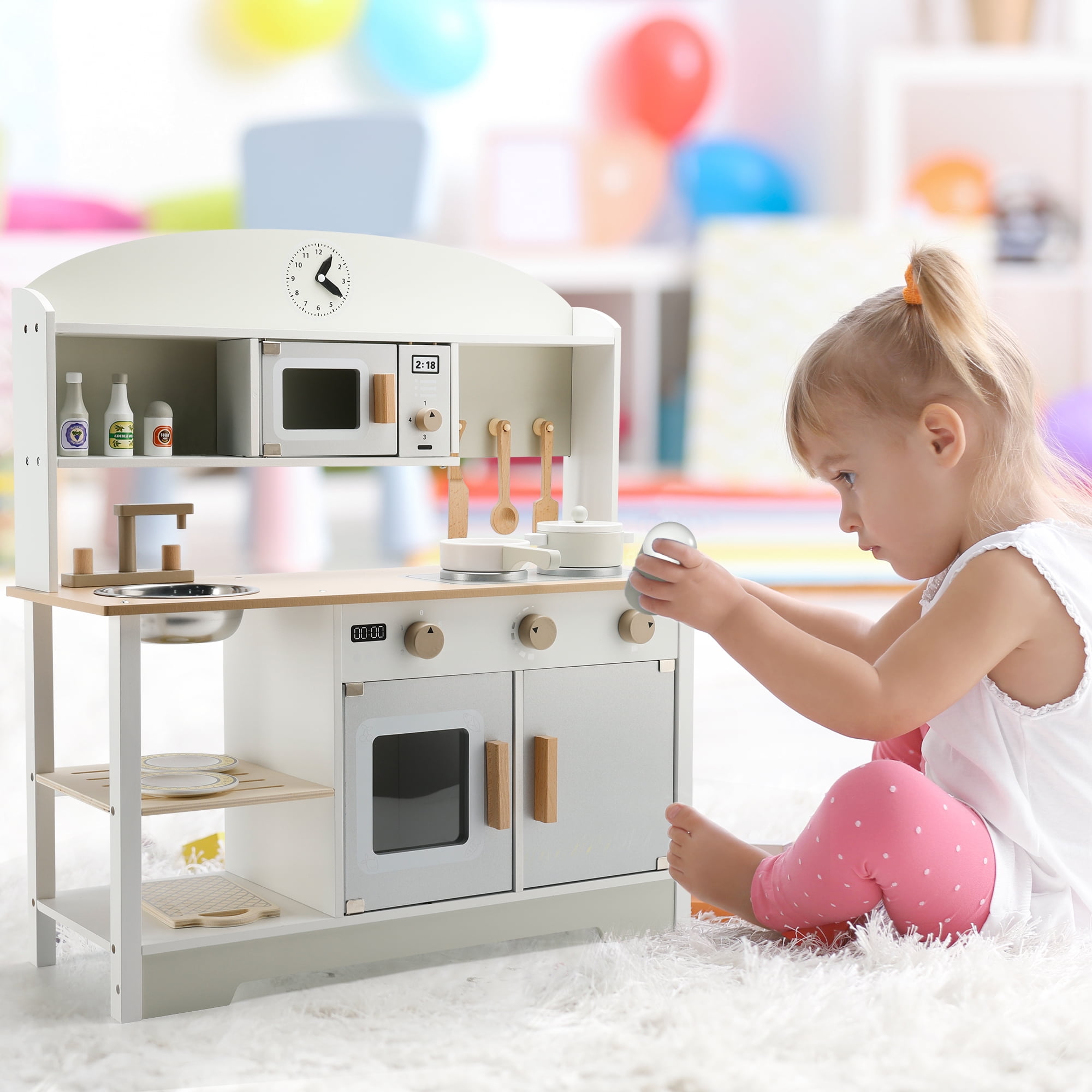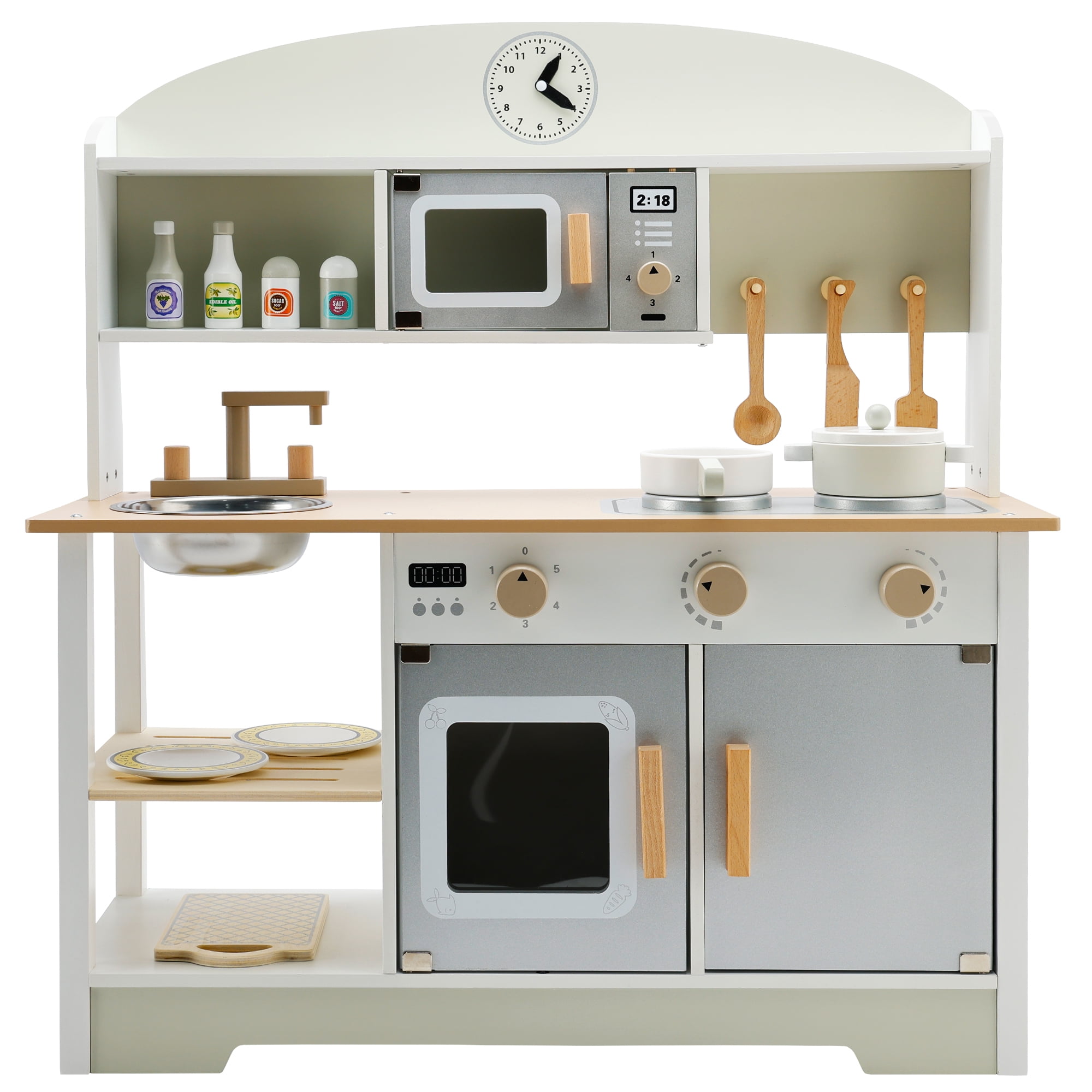 Kids Play Kitchen Set Toy, Wooden Pretend Chef Cooking Play Set with Microwave, Pan, Sink, Cookware Accessories Kitchen Set for Toddlers, Boys, Girls, Gift for Ages 2+