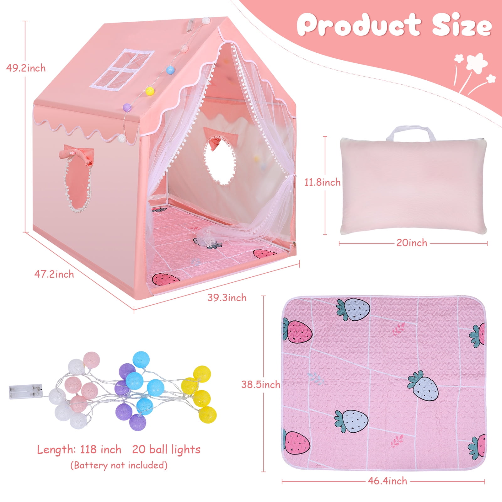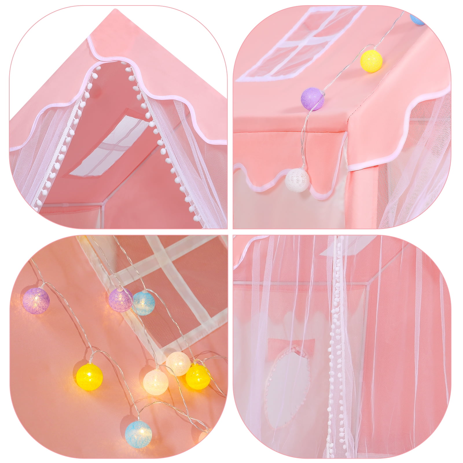 WOOW DEPOT beautiful fairy princess tent creates a kingdom in any corner inside or outside. WOOW DEPOT lightweight but large castle comes with cute mat, colorful ball staring lights, and a white carrying bag for more convenient storage and transport. Just follow the installation video, you and your kids can easily create a paradise anywhere anytime. An impressive present for your little one at birthday or Christmas for endless fun and memories! Notes: 1. Please allow 0.5-1in differences due to manual measurement. 2. The color may be a little different from that of a real item due to the different display and different light. 3. Batteries are not included.