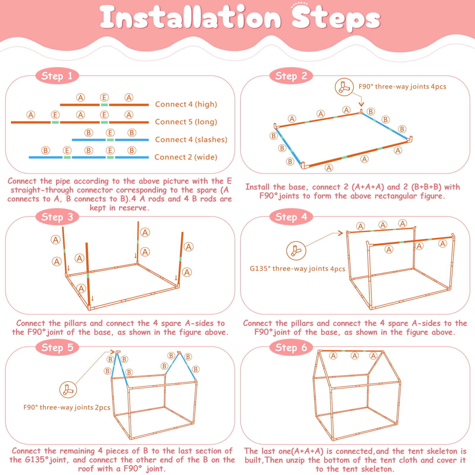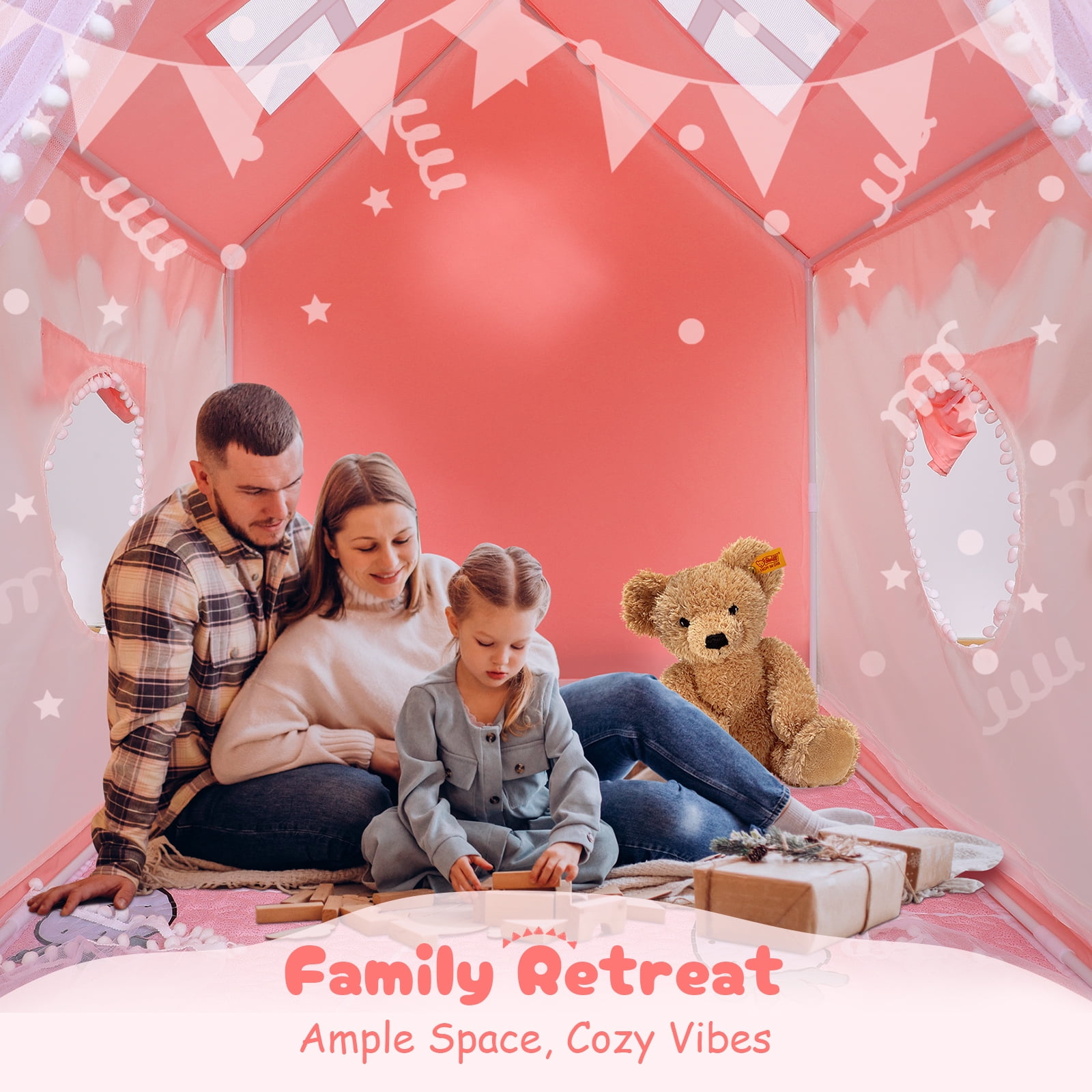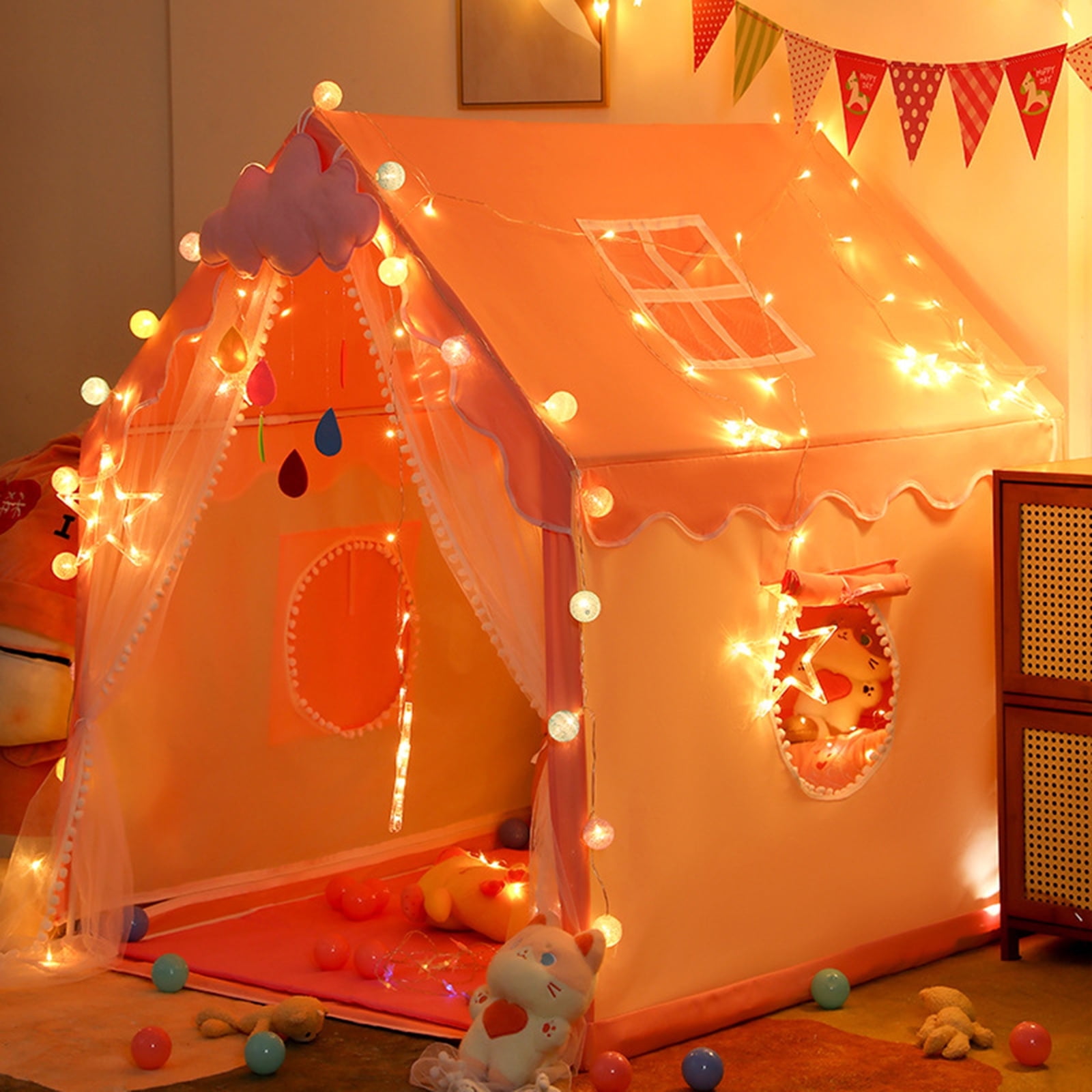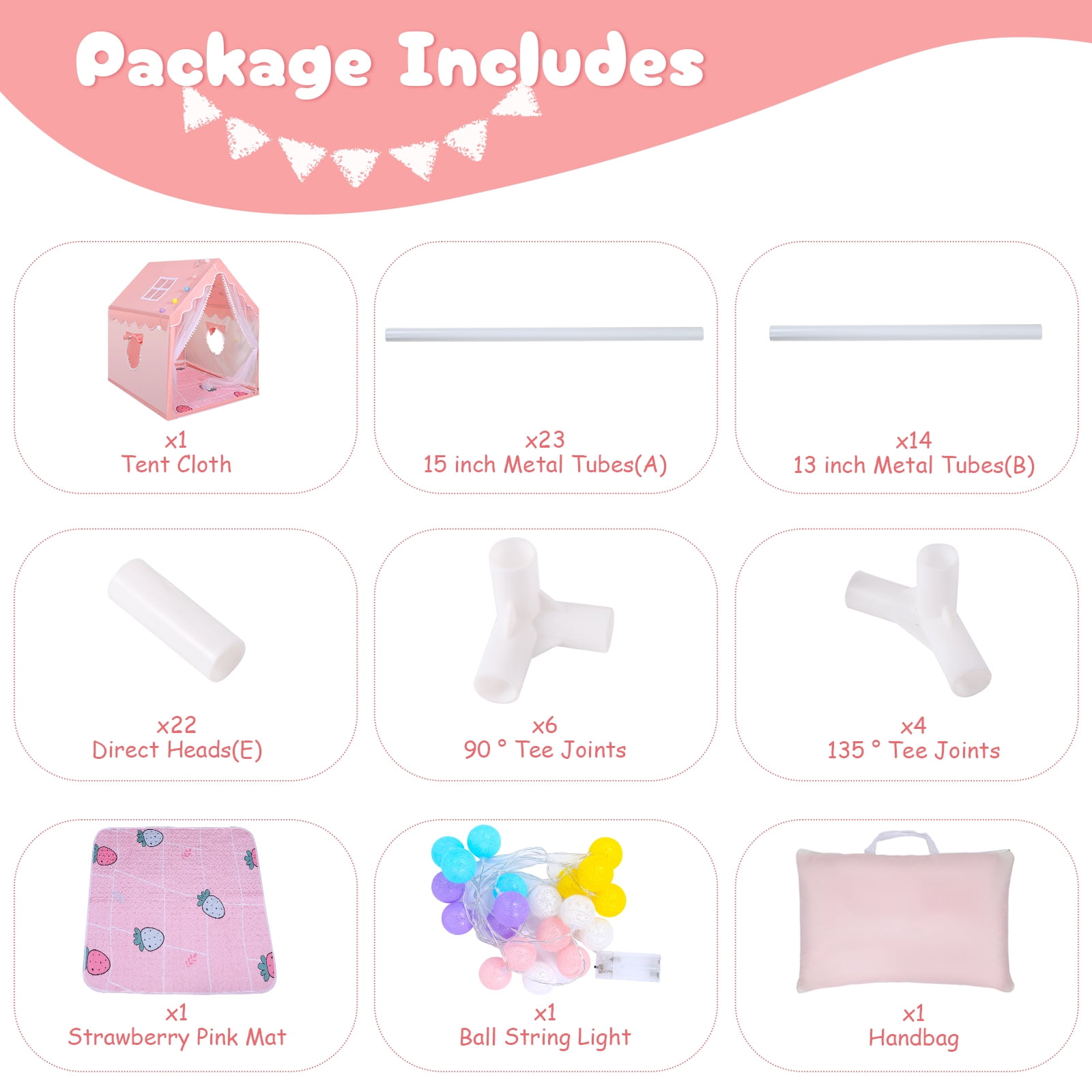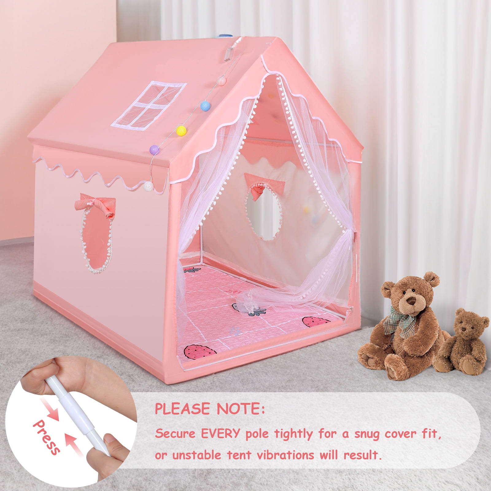 Features: Large Size & Durable: WOOW DEPOT play tent made with metal frames and premium polyester fabric, similar to trench coat fabric, more stable and durable. Size of 40×47.3x50in, this playhouse provides a large space for kids to play and can accommodate 2-3 children at the same time, even adults can enter! Fast to Assemble: This girls playhouse is easy to set up without any tools! Just follow the installation and video, you and your kids can easily create a paradise anywhere anytime. In addition, this cottage tent can be easily moved to the living room, back garden, park lawn etc. Adorable Appearance: Experience the magic of this one-of-a-kind house tent design, featuring charming style, breathable windows, and durable door curtains. Add in the colorful lights and soft floor mat, and kids will find themself transported to a world of festive joy and peaceful relaxation. Creating Personal Play Spaces: Whether for imaginative play or quiet retreats, this unique house is the perfect addition to any home, providing a cozy and secret hideaway that will delight both kids and adults alike. Get ready for endless fun and memories together! Specifications: Type: Kids Play Tent Material: Polyester Fabric + Metal + PP Tent Color: Pink Tent Dimension: 40″ (L) x 47.3 (W) x 50″ (H) Length of String Lights: 9.9FT /3M Light Shape: Ball Light Color: Colorful Quantity of Lights: 20 Power Supply: 2x AAA batteries (not included) Features: Durable, lightweight, large space, easy to install and disassemble, with rug, string lights, windows, and storage bag. Package Includes: 1x Play Tent 1x Ball String Lights 1x Floor Mat