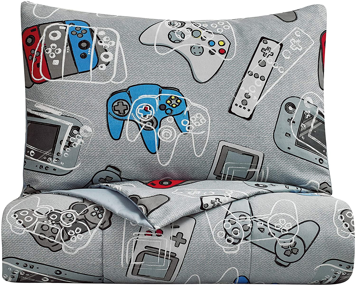 Kids Rule 5 Piece Gamer Glow in The Dark Bedding Set, Game Controllers Print, Blue, Grey – Twin