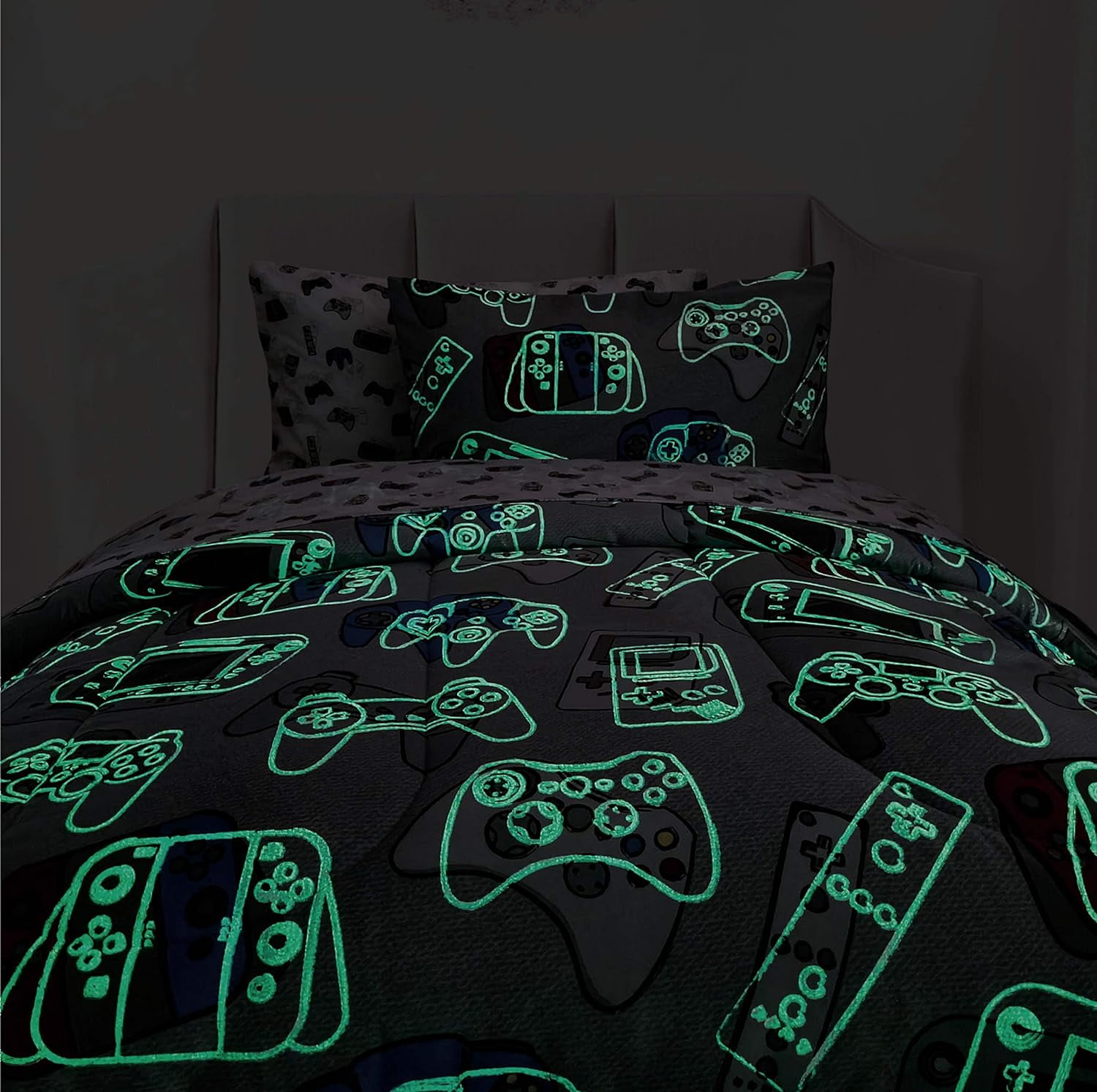 Create a fun and cool look for your little gamer with Kids Rule Gamer Glow in the Dark Comforter Set. The bedding set features a colorful and current glow-in-the-dark game controller print and a cozy,soft feel for a comfortable night’s sleep. Warm without the weight, the set includes a Gamer comforter and matching pillowcases (1 Standard Pillowcase for Twin Bed Size, 2 Standard Pillowcases for Full Bed Size) for a great Glow in the Dark gamer-themed kid’s bedroom. Made of 100% micro-denier polyester fiber for long-lasting softness and durability. Comfortable for use in all seasons. Easy care, machine wash and dry, with fade & stain resistance. The perfect gift for any boy who is passionate about video games!