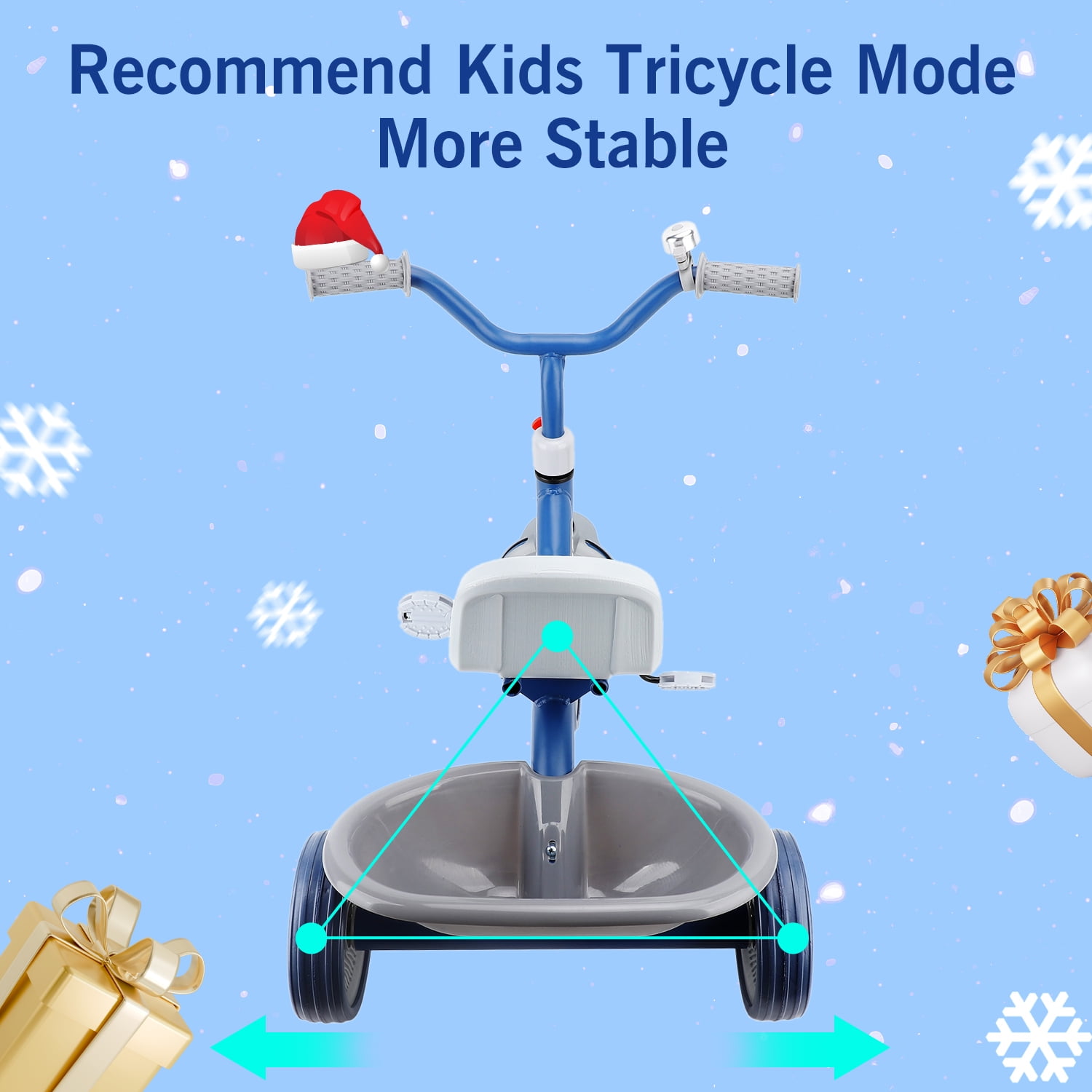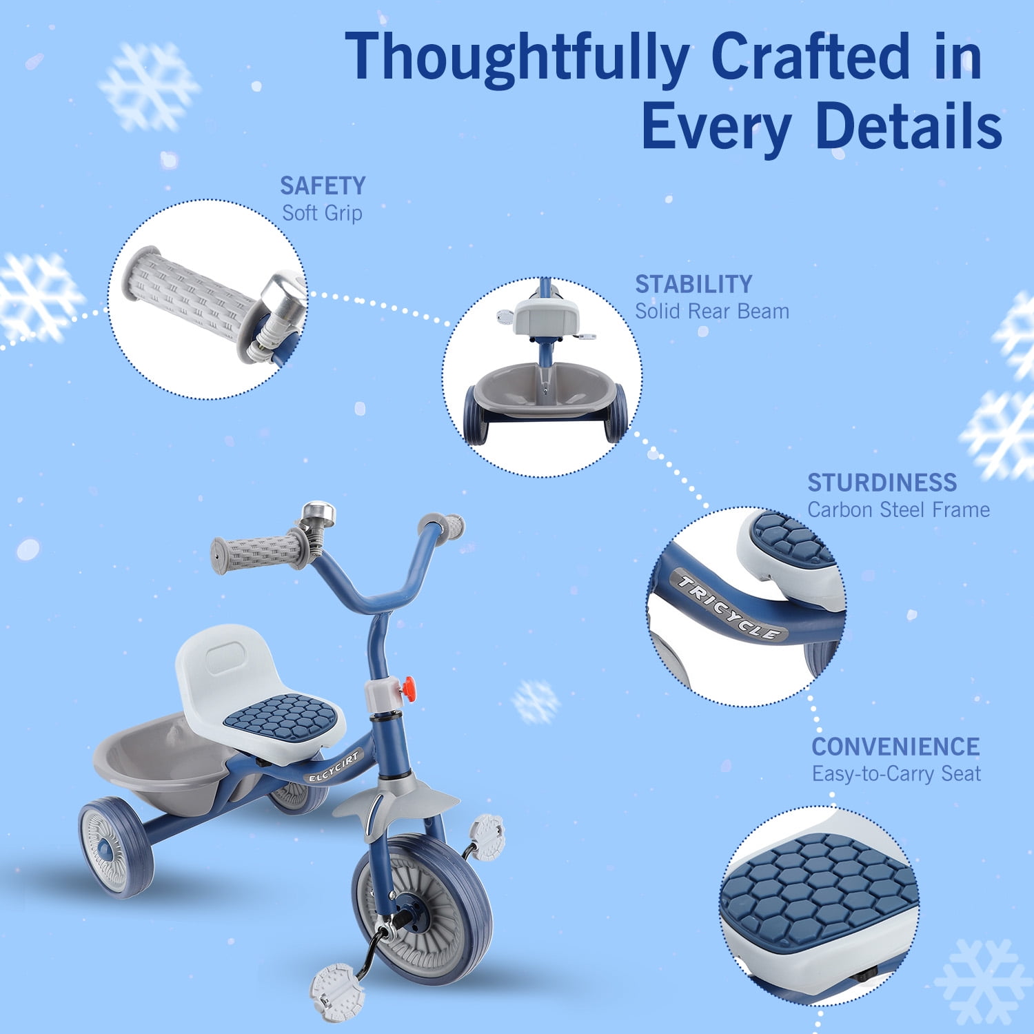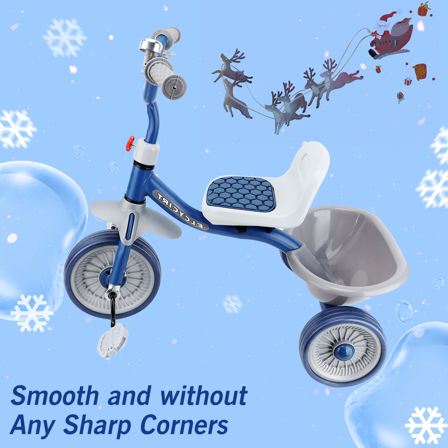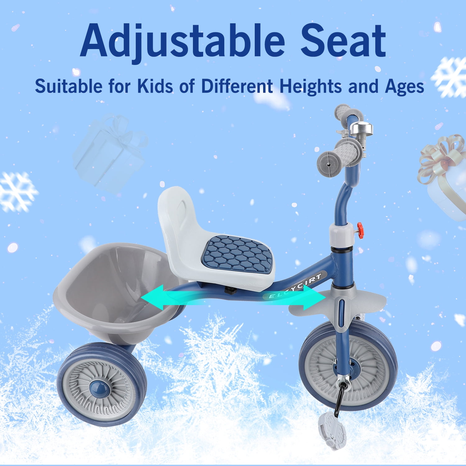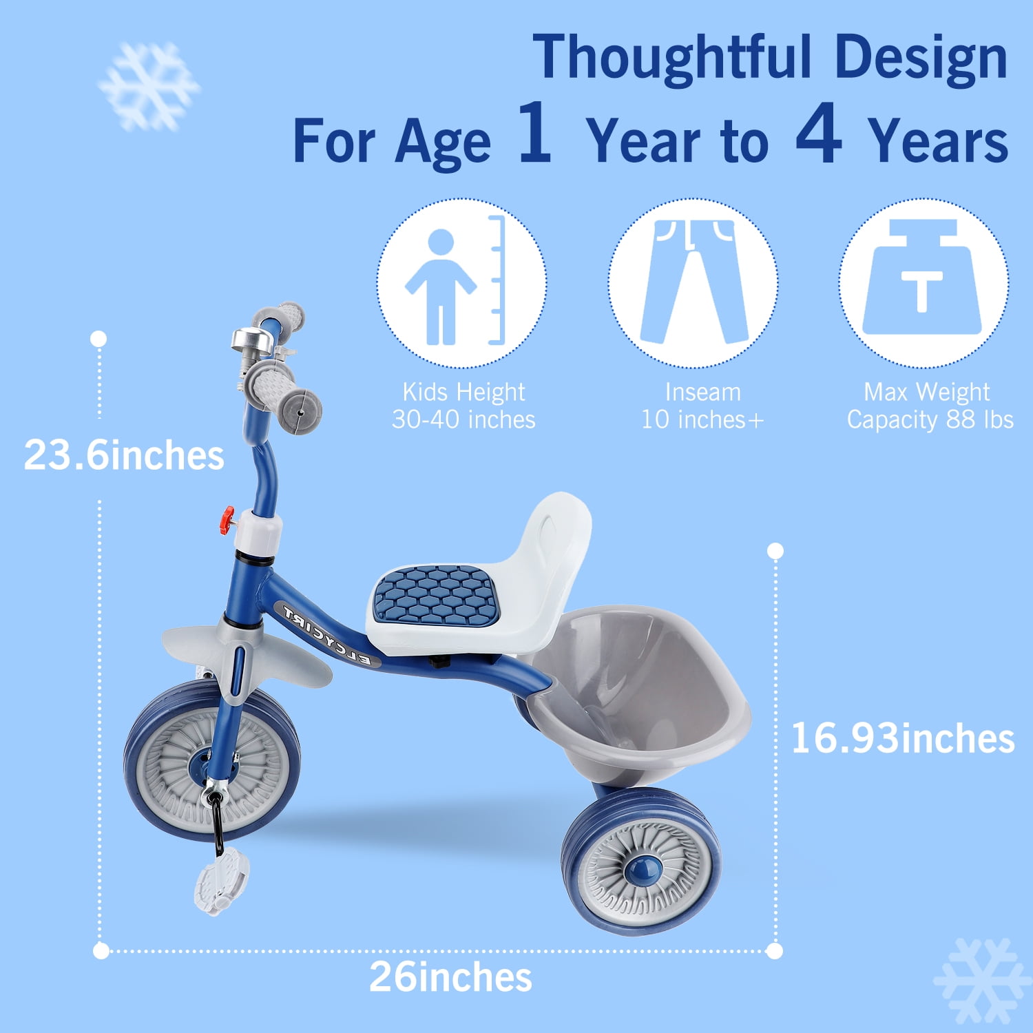 The kids trike with storage basket for toddlers ages 1-4 years old is an unique and versatile unisex tricycle that can bring a lots of fun while helping beginners practice balance and motor skills. The toddler tricycle with pedals make it possible for your little one will be able to ride at his or her own pace. And as your child grows, the adjustable seat will allow your baby to enjoy the toddler tricycle for years of fun. In addition, the portable design enhances convenience, and you can even take it on trips because it’s lightweight enough. I’m sure your little one will never want to leave their favorite toy again. Versatile Toddler Tricycle, Grows with Your Kids Best Bike for Beginners: The toddler tricycle works on toddlers’ balance and motor skills while bringing boys and girls a fun riding experience. Ideal Gift for Kids: The kids tricycle has been carefully designed, making it the perfect birthday/Christmas gift for boys and girls ages 1-4. Seat Adjustable: The adjustable seat with soft padding grows with your child, simply adjust the seat to match the rider’s growth. Adjustable Handlebar: The non-slip handlebar can be adjusted to different angles at any time depending on your child’s riding position. Safe and Stable Ride Prevent Rollover: Stable triangular structure design with steering angle restriction on both sides to ensure safety. Smooth Ride: The shock-absorbing mechanism in the front wheel and built-in bearings ensure a safe and smooth riding experience. Enclosed Wheels: The wheels have an enclosed design that prevents your baby’s feet from being caught by the wheels during riding. Durable Design: Made of carbon steel and plastic, it can accompany your child for a long time. Easy to Install: Easy to assemble in minutes by simply referring to the included manual. Specification: Item Type: Kids Tricycle Material: High carbon steel, plastic, EVA Wheels: EVA Foam wheels Size: Approx. (26 x 23.6 x 17.7) in Maximum Load: Approx. 88 lbs Applicable Age: 1-4 years old Package List: 1 x Basket 2 x Rear Wheels 1 x Body Parts 1 x Saddle 1 x Manual 1 x Front Wheel 1 x Handlebar 1 x Tricycle Body 1 x Bell 1 x Assembly Tool 4 x Small Parts NOTE 1. All measurements are taken manually and may be subject to slight inaccuracies. 2. If you encounter any problems regarding the product, please feel free to contact us.