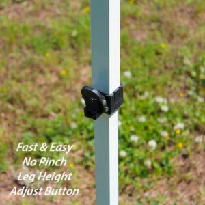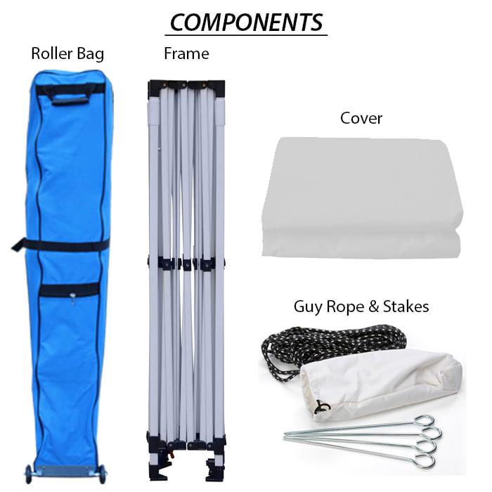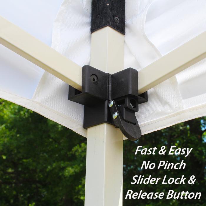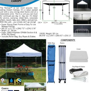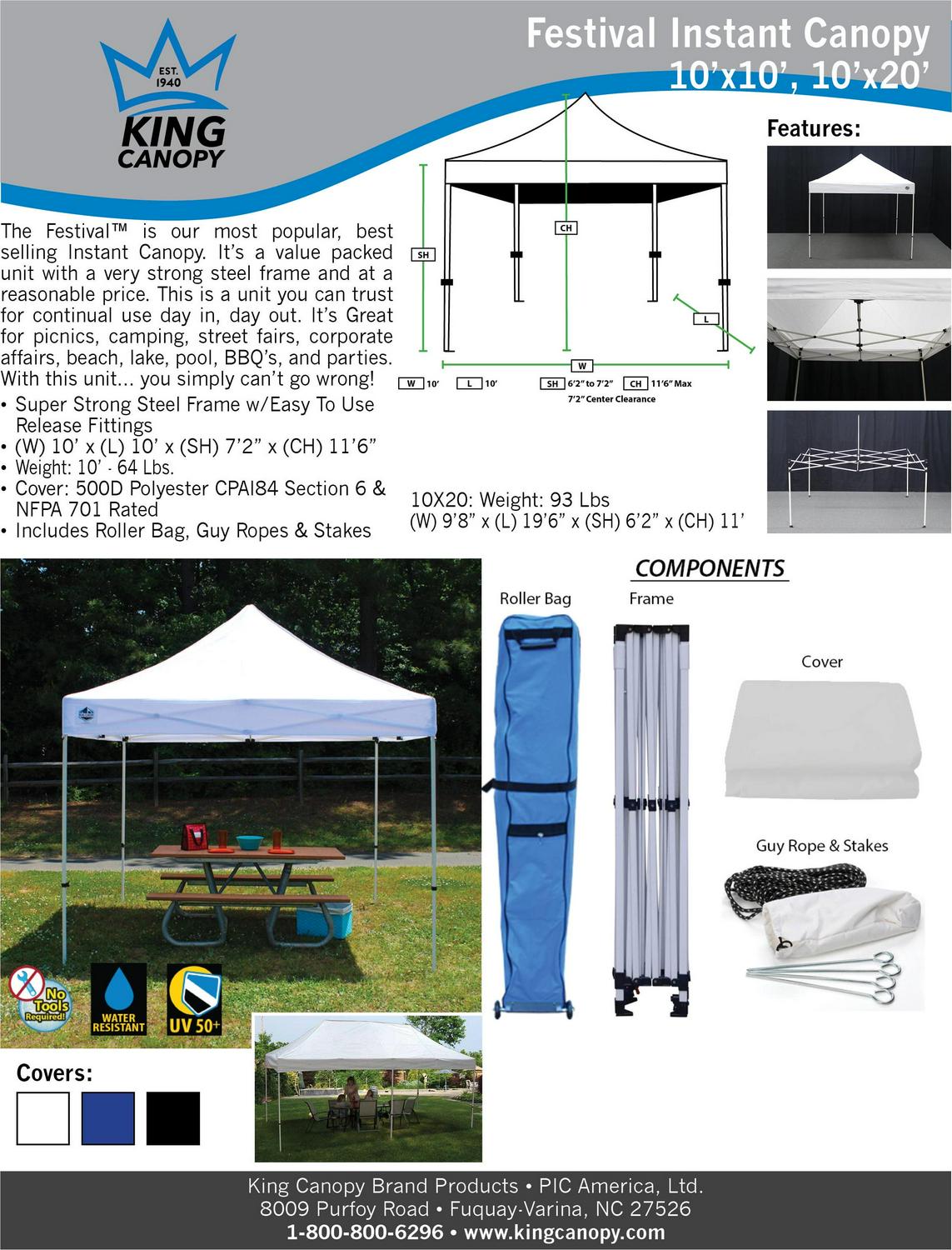 King Canopy Festival Instant Pop-Up Canopy is a durable and dependable pop-up instant canopy. The 9ft 8in x 9ft 8in All Steel Commercial Grade frame is perfect for any outdoor vendor or trade show. Great source of shade during tailgates or any sporting event. This frame features a heavy duty center truss design to provide more roof strength, and a upgraded locking system to prevent pinched fingers. The cover is 500d Polyester and conveniently compacts and stores in a heavy duty 600d Polyester Roller Bag. Includes Roller Bag, Ground Stakes, and Guy Rope. Sidewall Kits for full enclosure sold separately.