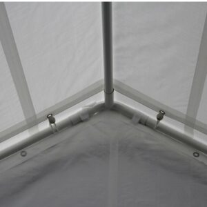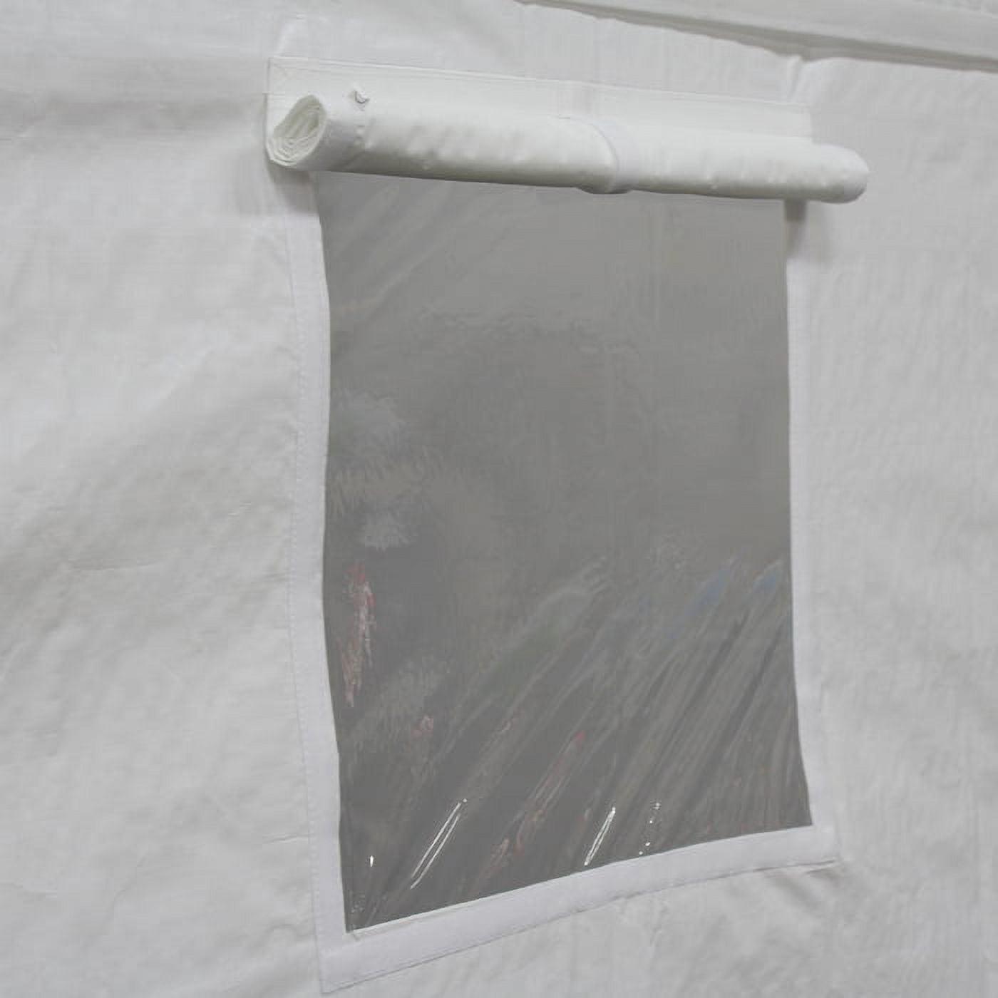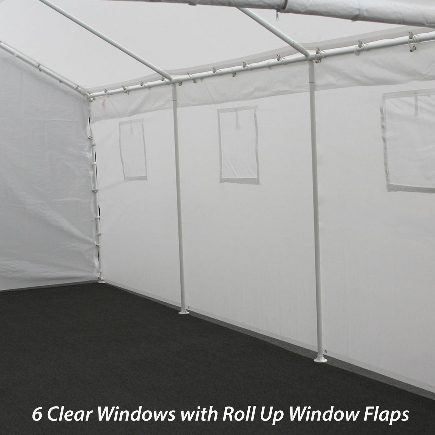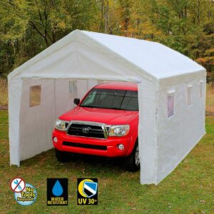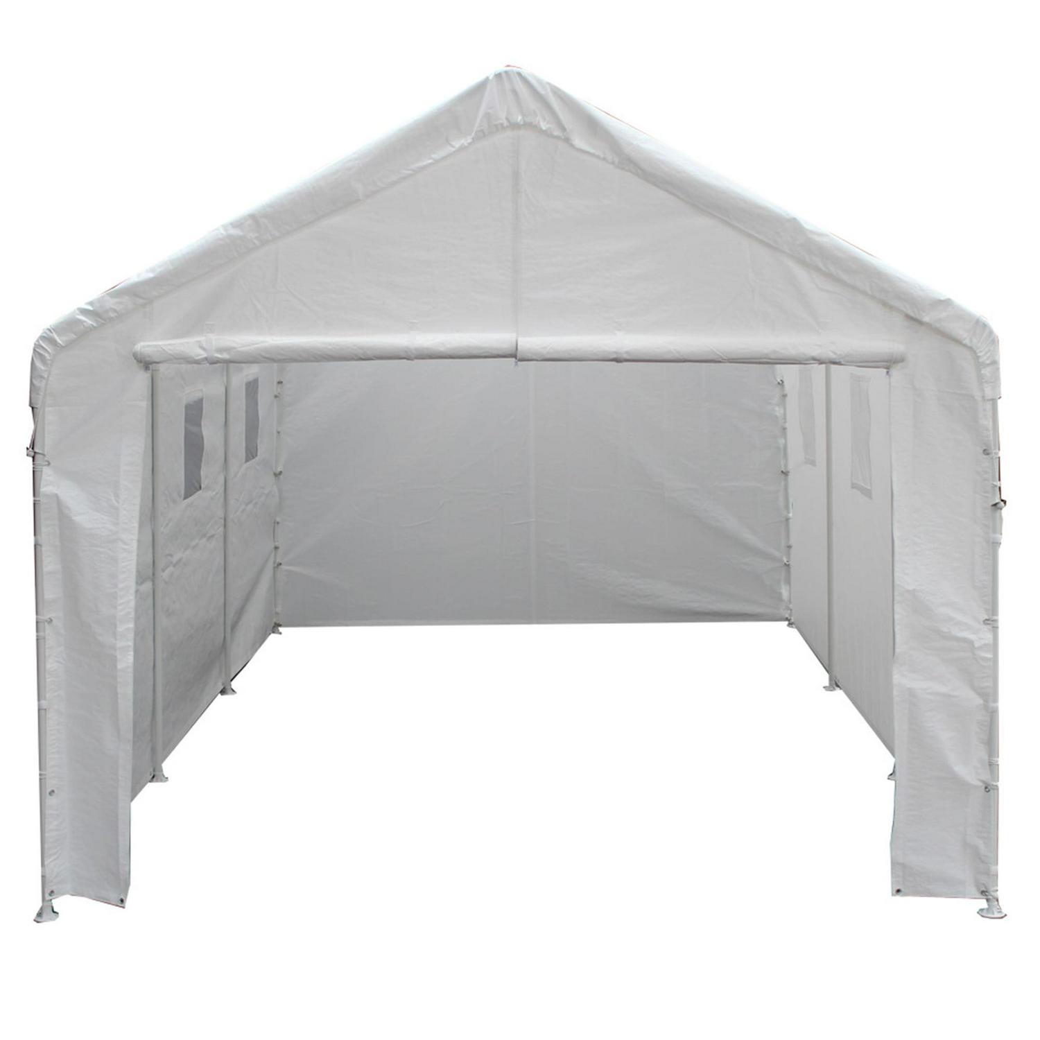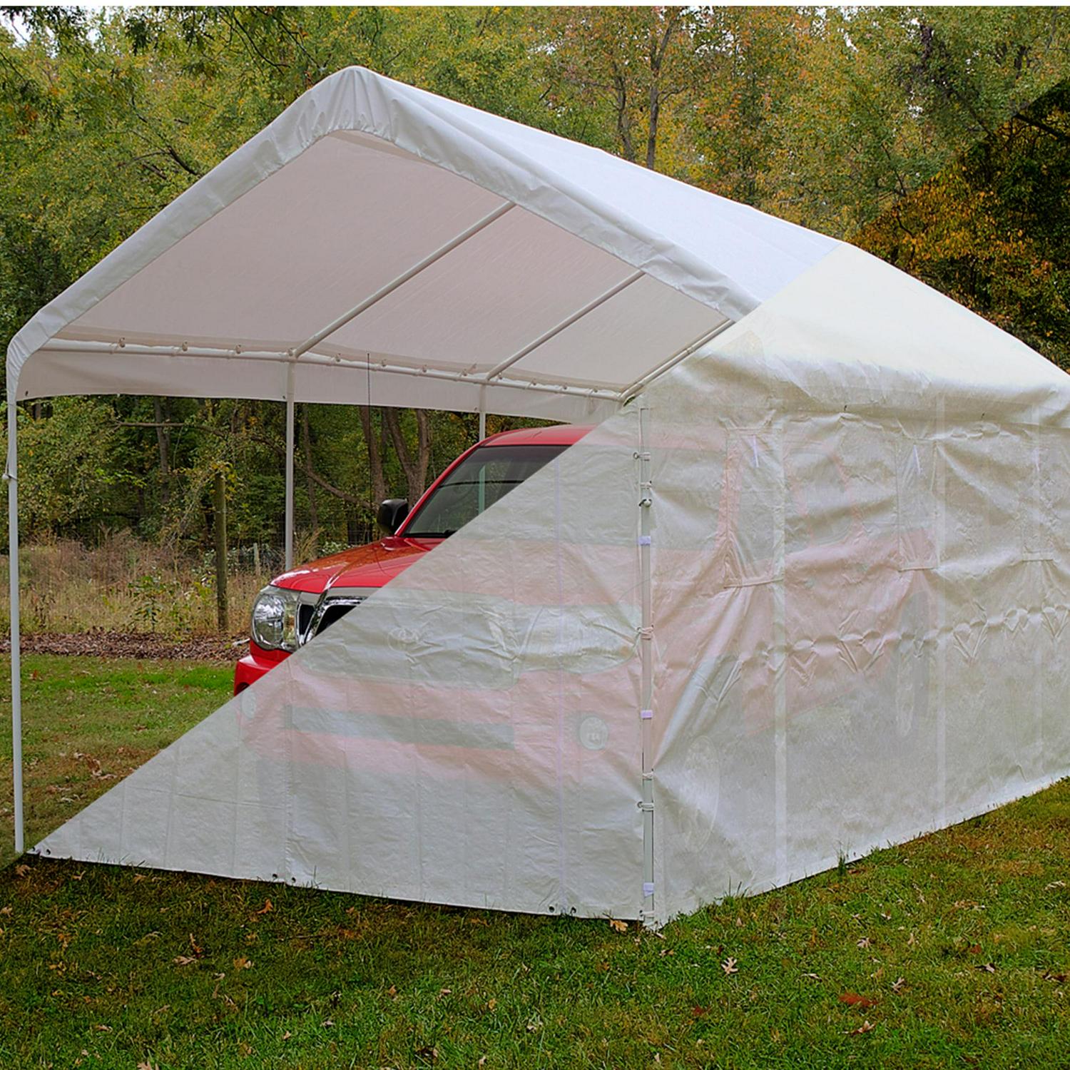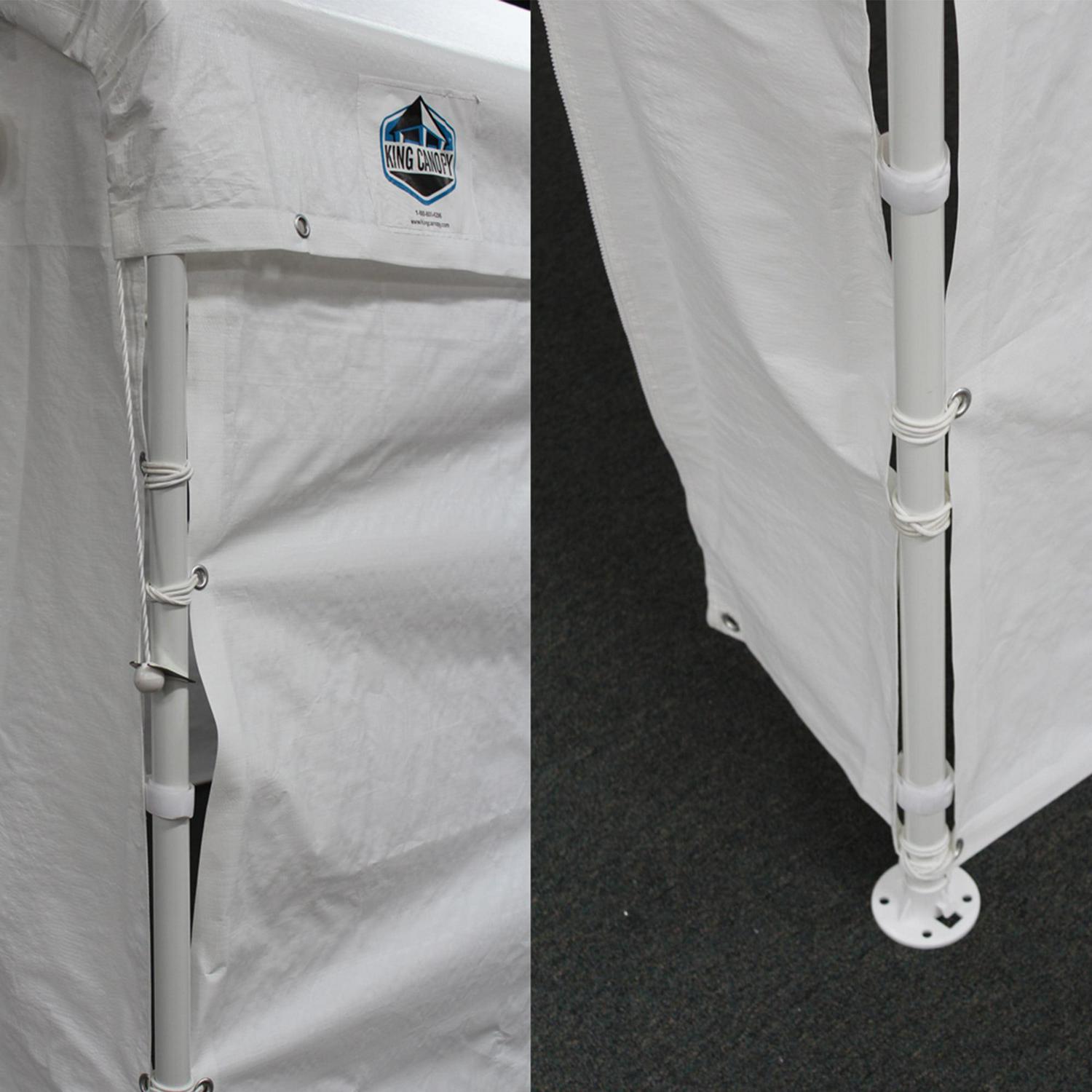 King Canopy Universal 10ft 8in x 20ft Canopy. This economical 8 leg enclosed Canopy offers quick, portable shade and protection from inclement weather. Great to pack up and take camping, hunting, or hosting a gathering. The Universal Canopy features a 1 3/8 inch Powder Coated Steel Frame, and 180 gsm Patented Drawstring Cover and enclosure kit in white . Easy Assembly. No Tools Required.