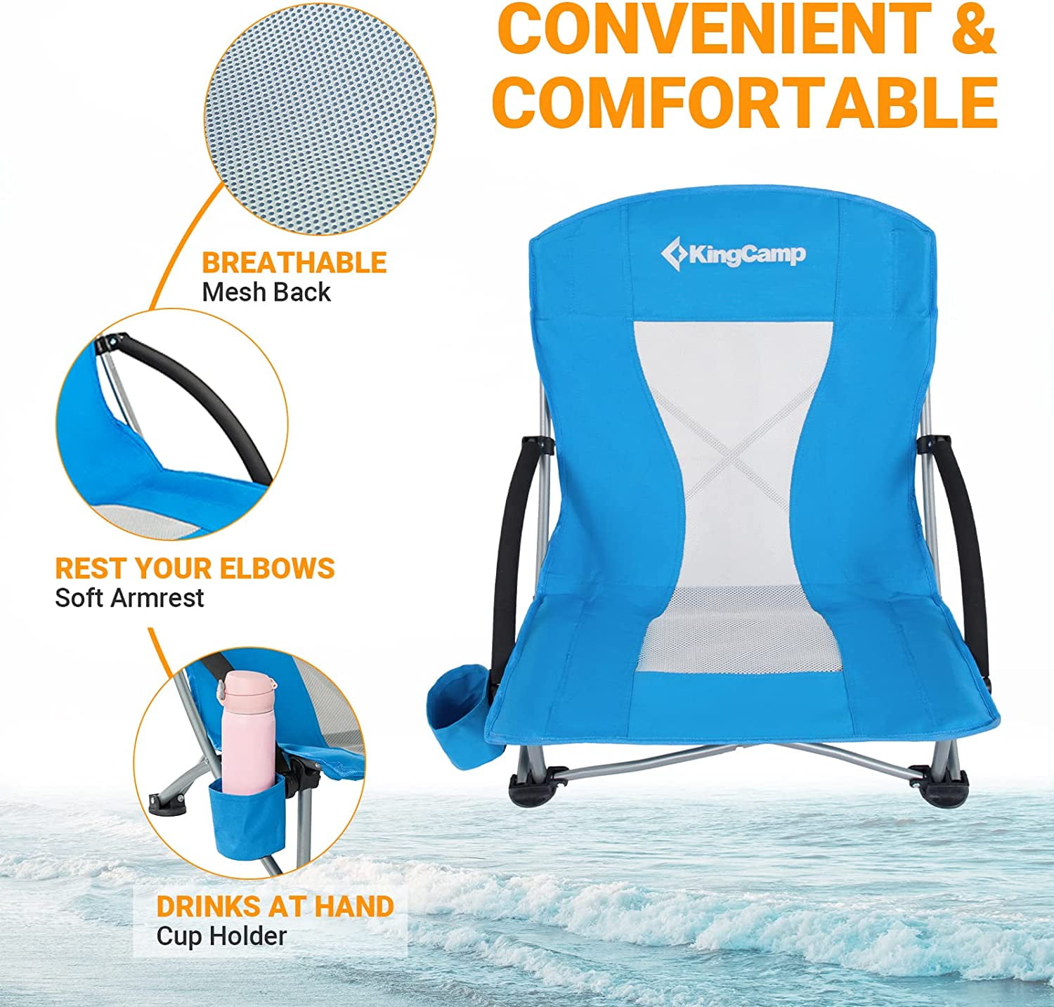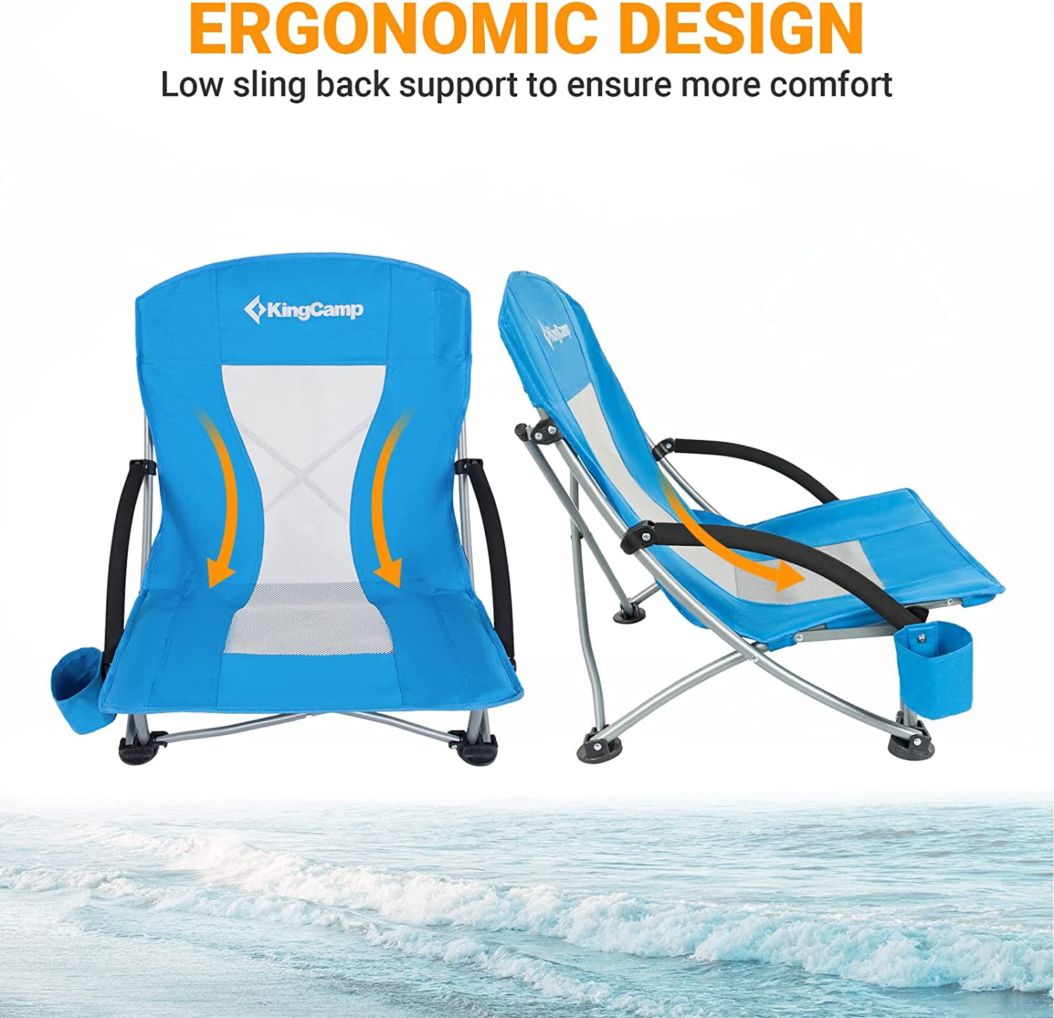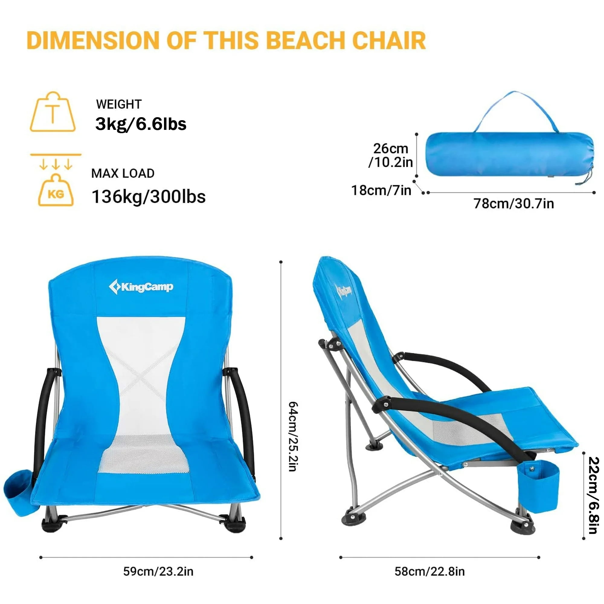 DURABLE AND WEIGHT CAPACITY: SUPPORTS UP TO 300 LBS for Adults. Heavy duty steel frame and 600D Oxford fabric makes the beach chair durable. It is suitable for both slim guys and big guys. WIDE AND LOW SEAT: Seat width 23.2 inches, KingCamp Beach Chair is wider than others (less 23 inches); You will feel more comfortable from low seat chair, fully stretch your legs, as comfortable as lying your bed. UNIQUE AND FUNCTIONAL: Features a cup holder on the right side of the beach chair so you can enjoy an entire day of relaxation EASY TO USE: No assembly, open and close in seconds, KingCamp Folding Beach Chair is convenient for you. LIGHTWEIGHT AND CONVENIENT STORAGE: Weighs only 6.6 lbs; Packed size 30.7 × 7.9 × 5.1 inches, included a carry bag, easy to carry and store. UNIQUE AND FUNCTIONAL: The folding beach chair has a cup holder which is used to put your water bottle, snacks, etc. Our lightweight low beach chair is perfect to be used in the sand; you can also bring it for picnic, camping, patio parties, fishing, and more! CUSTOMER GUARANTEE:This chair comes with 12-monthes warranty, and a 100% satisfaction guarantee. If you have any questions, please contact us directly.