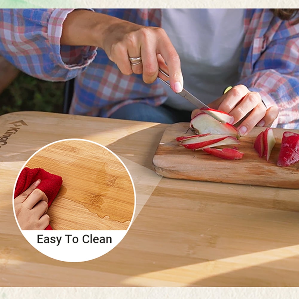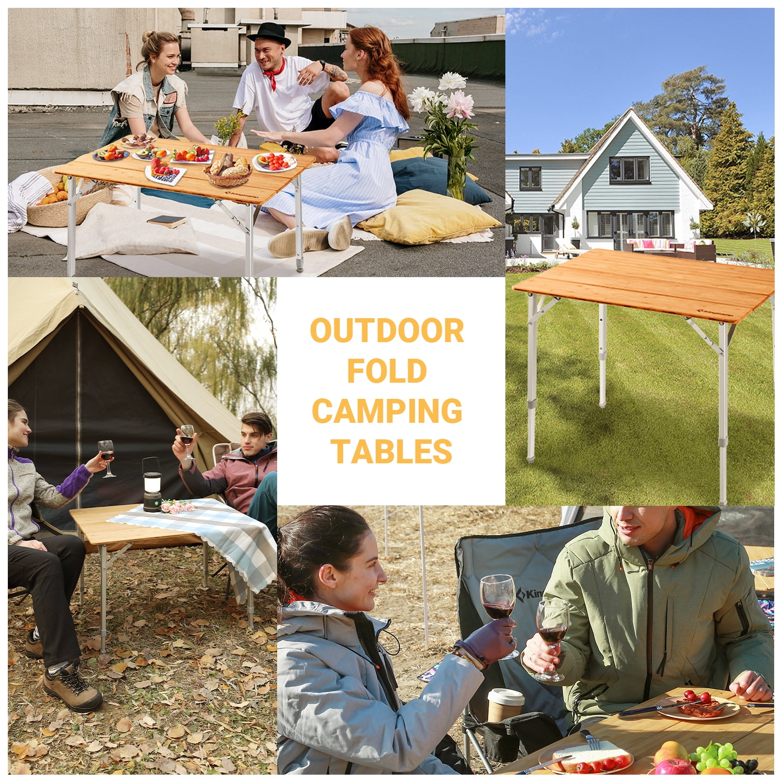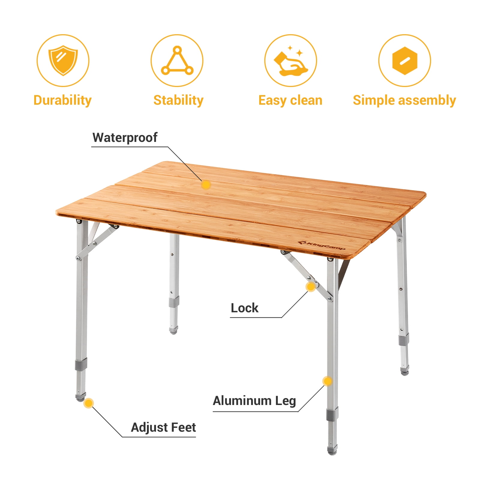 KingCamp Bamboo Folding Table Bamboo-From Nature&Return to Nature! KingCamp bamboo folding outdoor table uses special pure bamboo board instead general MDF board, touched smoothly and looks gorgeous.Environmentally and durable, with waterproof coating and scratch resistance, anti-aging UV treatment and long service life. Especially suitable for people pursuing for high-quality life. Product Description 1.Adjustable Height: The leg can be adjusted into three heights (17.1″,20.5″, 25.6″), which can suit for the chairs of different height. The folding bamboo table measures 25.6″x 19.7″ suitable for 4 people. 2.Easy to Assemble and Fold: The table can be folded to 4-fold, which is very space saving and portable. 3.Bamboo Desktop & Aluminum Frame: With aluminum tubes design, the table is very stable and lightweight, supporting up to 80 kg / 176.3 lbs. The desktop is made of pure natural bamboo which has been UV treated to resist deform under the sun; the desktop is water resistant. 4.Portable & Lightweight: The table only weight 9.2 lbs and after folded the size of the table only 25.6″ x 5.5″ x 4.7″. It is portable and light enough to be carried like a suitcase on a trip. 5.Multi-Purpose: perfect to be used indoors as well as outdoors activities such as picnic, camping, beach, patio parties, fishing. 6.Much more stable: The square leg design add to much more stability and maximum load of this camping folding table. 7.Customer Service: The camping table with a 12-month warranty, If any part of the table is lost or damaged, please contact us promptly, our team will try our best to help you.