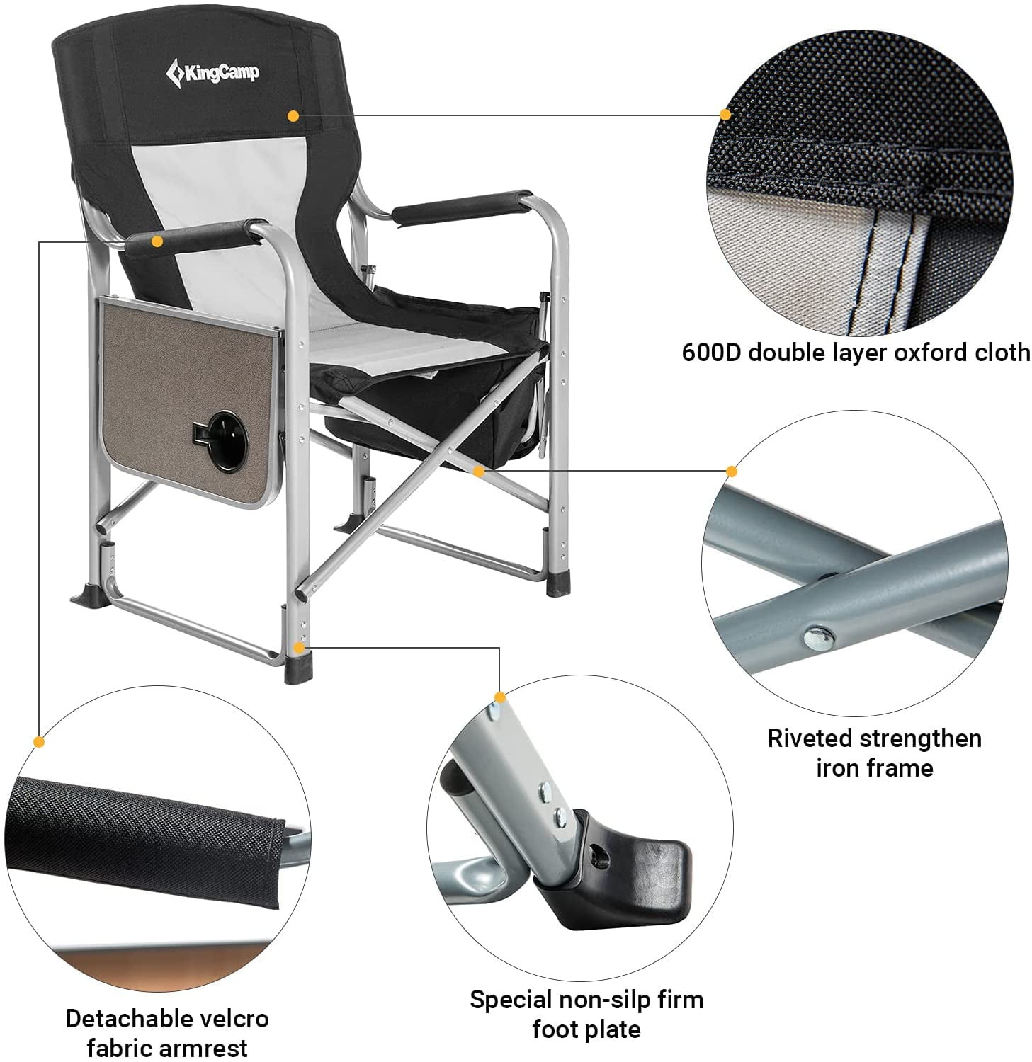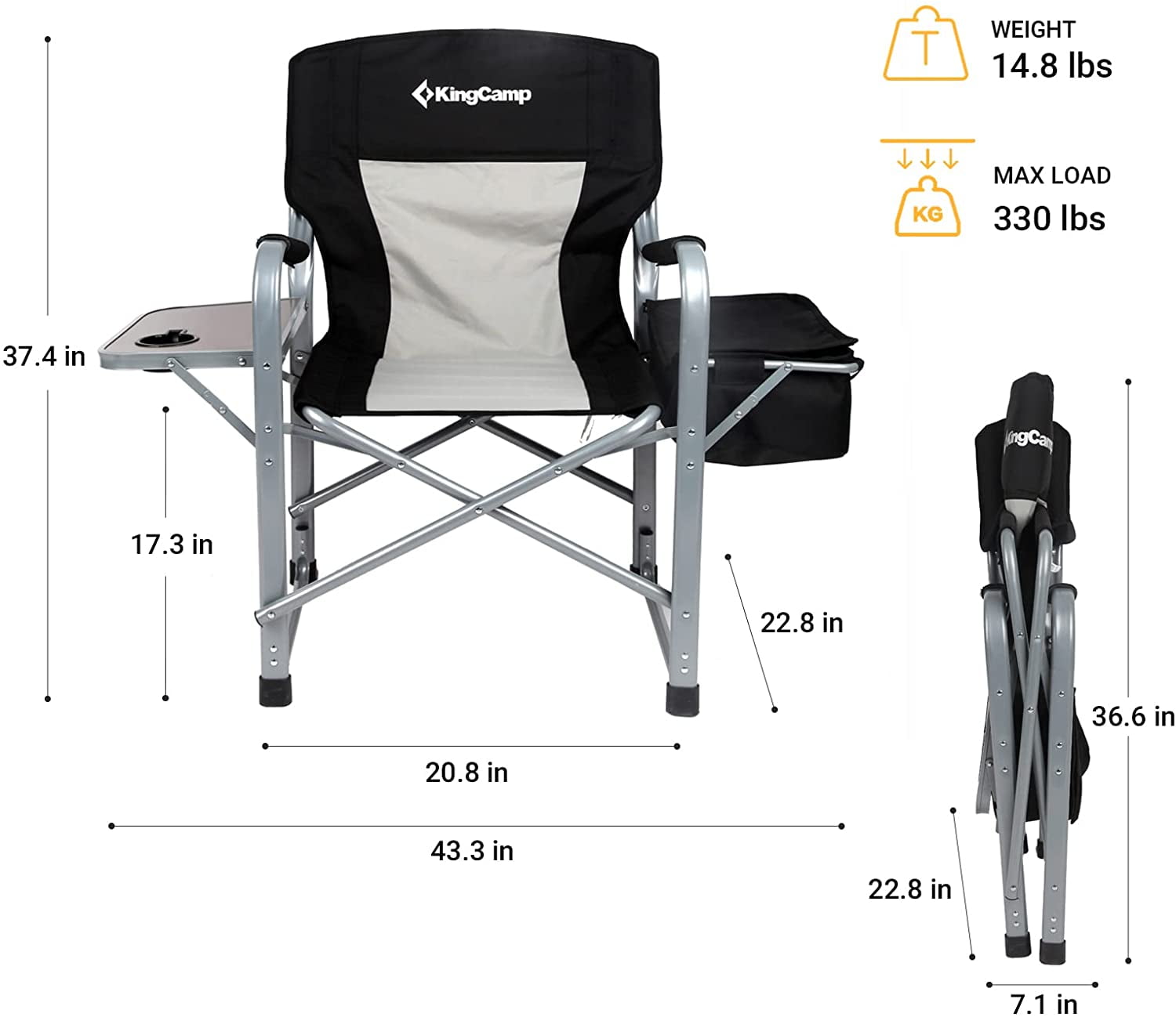 【Premium Material】KingCamp Heavy Duty Camping chair Folding Director Chair With rugged steel frame, extra large size, and wear-resistant high-density 600D oxford fabric, the camping chair can support up to 350 lbs for years of use, Adult. 【Side Table & Cooler Bag】 The side folding chair is on the right side which has a cup holder to keep your drink, the cooler bag (12 liters) is on your left side to keep food or beverage in a temperature. 【Comfortable & Portable】 Seat height 17. 3 inches, width 20. 8 inches, it is big enough for a big guy, the moisture-wicking fabric of this chair is soft and breathable. Weighs 14.8 lbs, it is portable to be carried to anywhere. 【Easy to Open and Fold】 Sets and folds in seconds, very easy to use and store; Packed Size 36. 6 × 22. 8 × 7. 1 inches, no tools needed. 【Quality Service】 We provide the best experience to all of our customers. Please feel free to let us know if you have any questions or concerns.