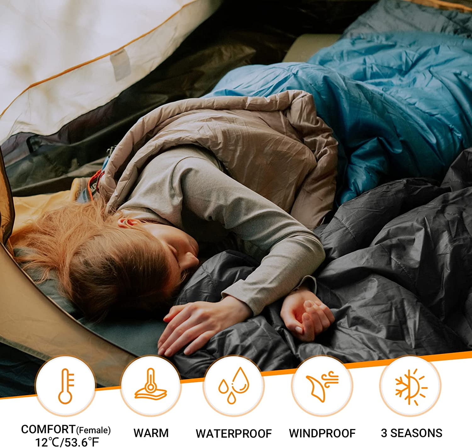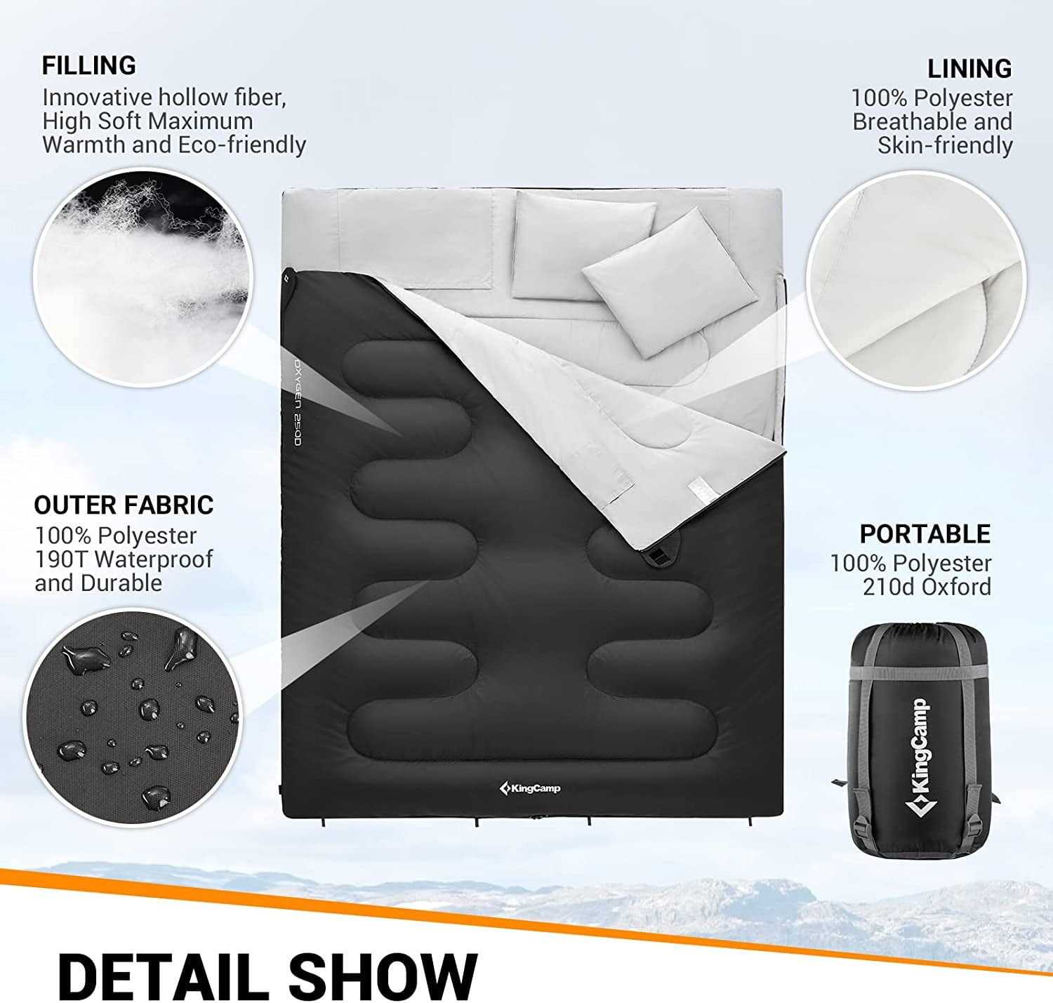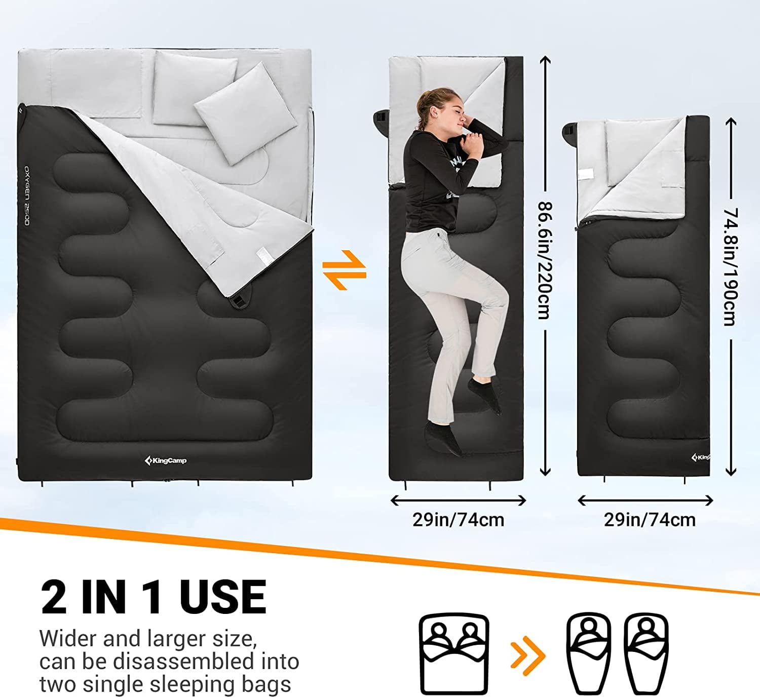 【QUEEN SLEEPING BAGS】KingCamp double sleeping bag is perfect for couples camping. This adult sleeping bag measures 59” W x 86.6” H, big enough for your toss and turn. KingCamp 2 person sleeping bag allows plenty of room for both legs and arms to stretch out; can be completely unzipped and used as a comforter or mat. Provides a queen size roomy experience, similar to sleeping in your own bed at home. 【WIDE APPLICATION SEASON】KingCamp cold weather two person sleeping bag can be used for spring summer fall 3 seasons. Our xl sleeping bag is designed for Comfort Temp 53.6℉. KingCamp sleeping bag for two is perfect for backpacking, camping, and hiking even using at home. 【SUPER WARM AND COMFORTABLE】KingCamp cold weather sleeping bags are designed to help you stay warm and comfortable in cold weather conditions. The 250g/㎡ innovative hollow fiber filling has been engineered to provide maximum warmth and softness. Premium 190T waterproof polyester fabric,ultra-soft, and rip-stop. 【CAN BE USED AS TWO INDIVIDUAL SLEEPING BAGS】Our 2 person sleeping bag can be separated into two individual sleeping bags if you need them. It offers roomy and warm space for couples or families. You can spend a warm and romantic time with your family in a large sleeping bag! One wide sleeping bag satisfies your different use purpose. 【PORTABLE&LIGHTWEIGHT】 This camping sleeping bag can be packed down into an ultra-compact bag in seconds. Package size 20″x12″, weight 6.5lbs. KingCamp large sleeping bag comes up with a travel-friendly carry bag, a compression sack with straps, which makes it quite convenient to store and carry along. Can easily be wiped clean or machine washed.