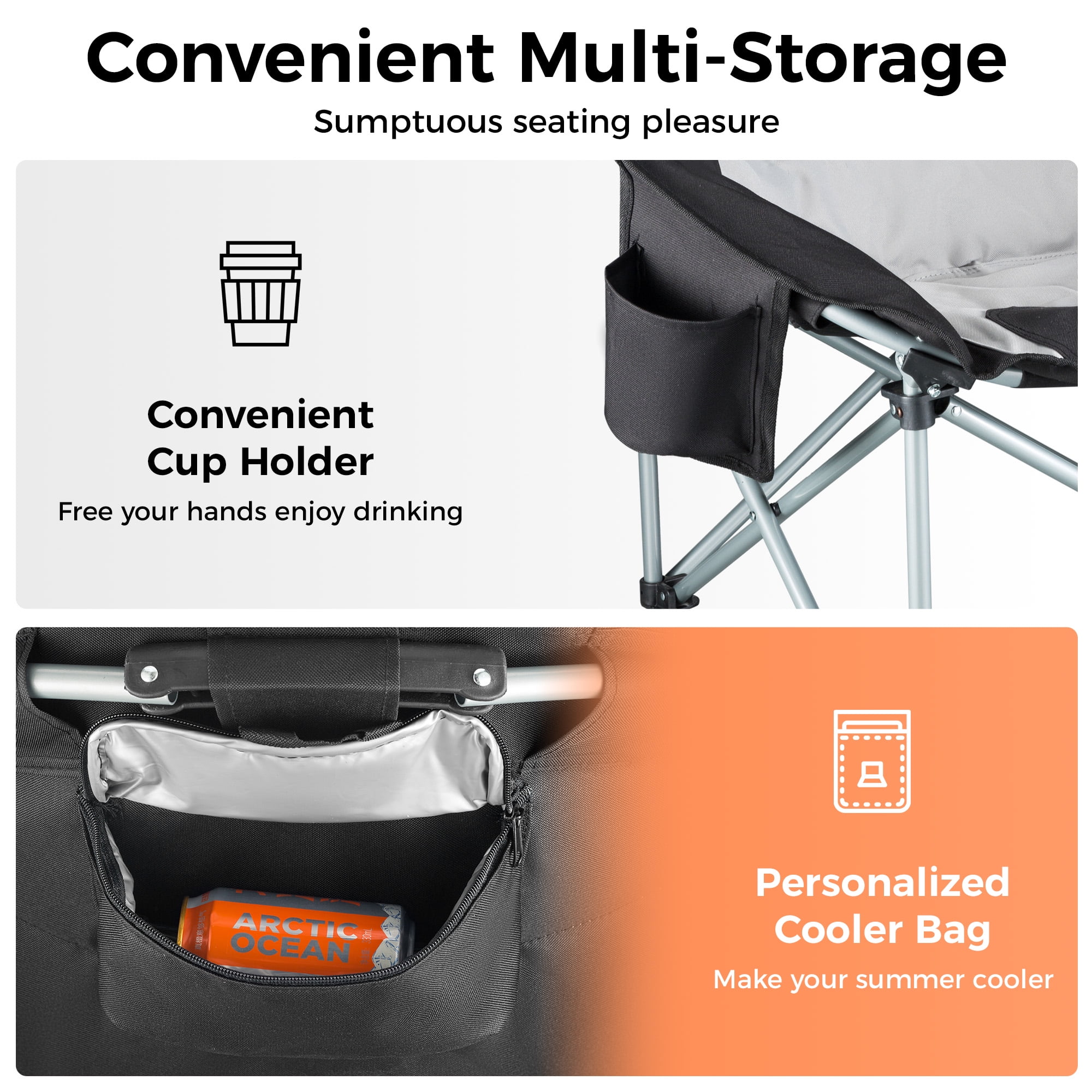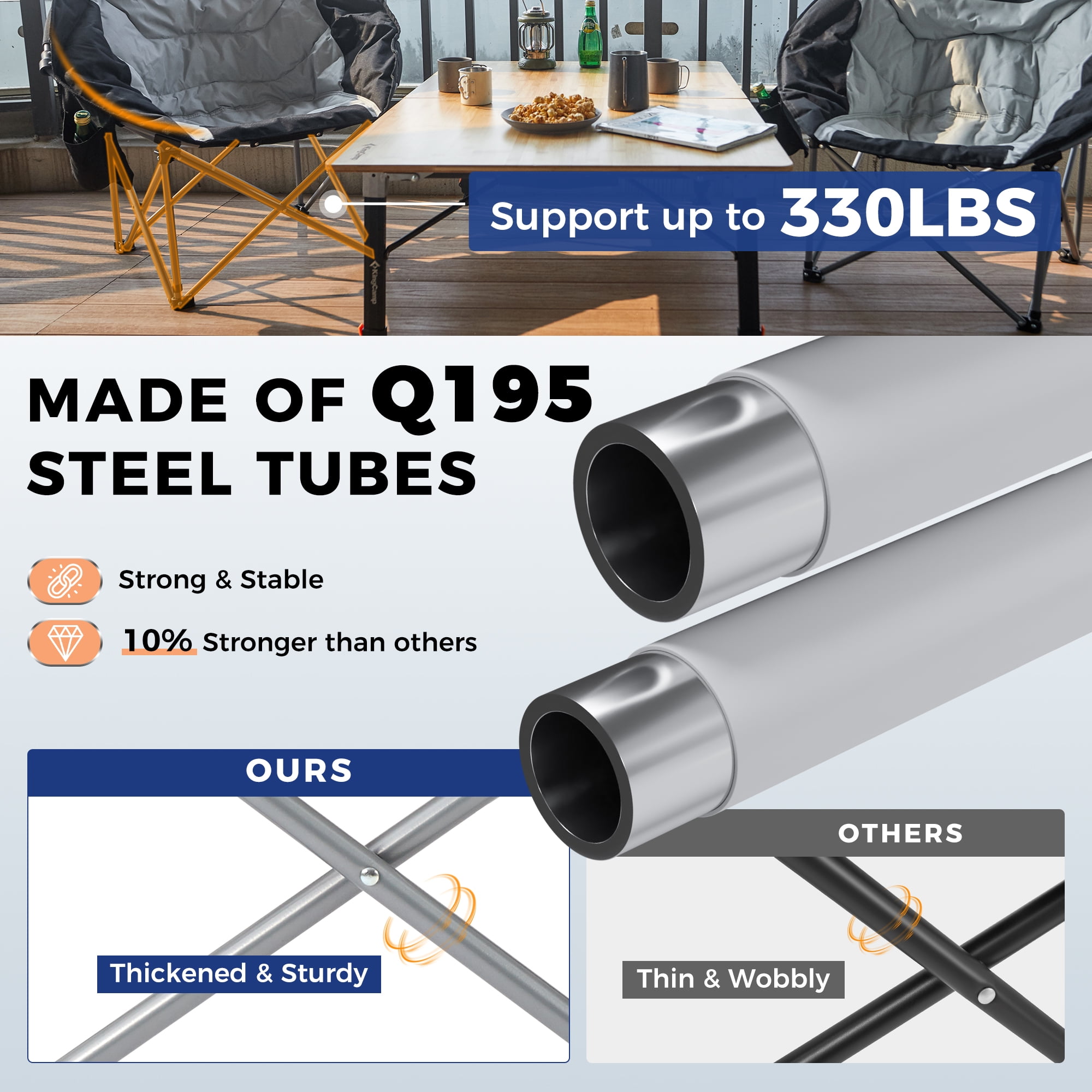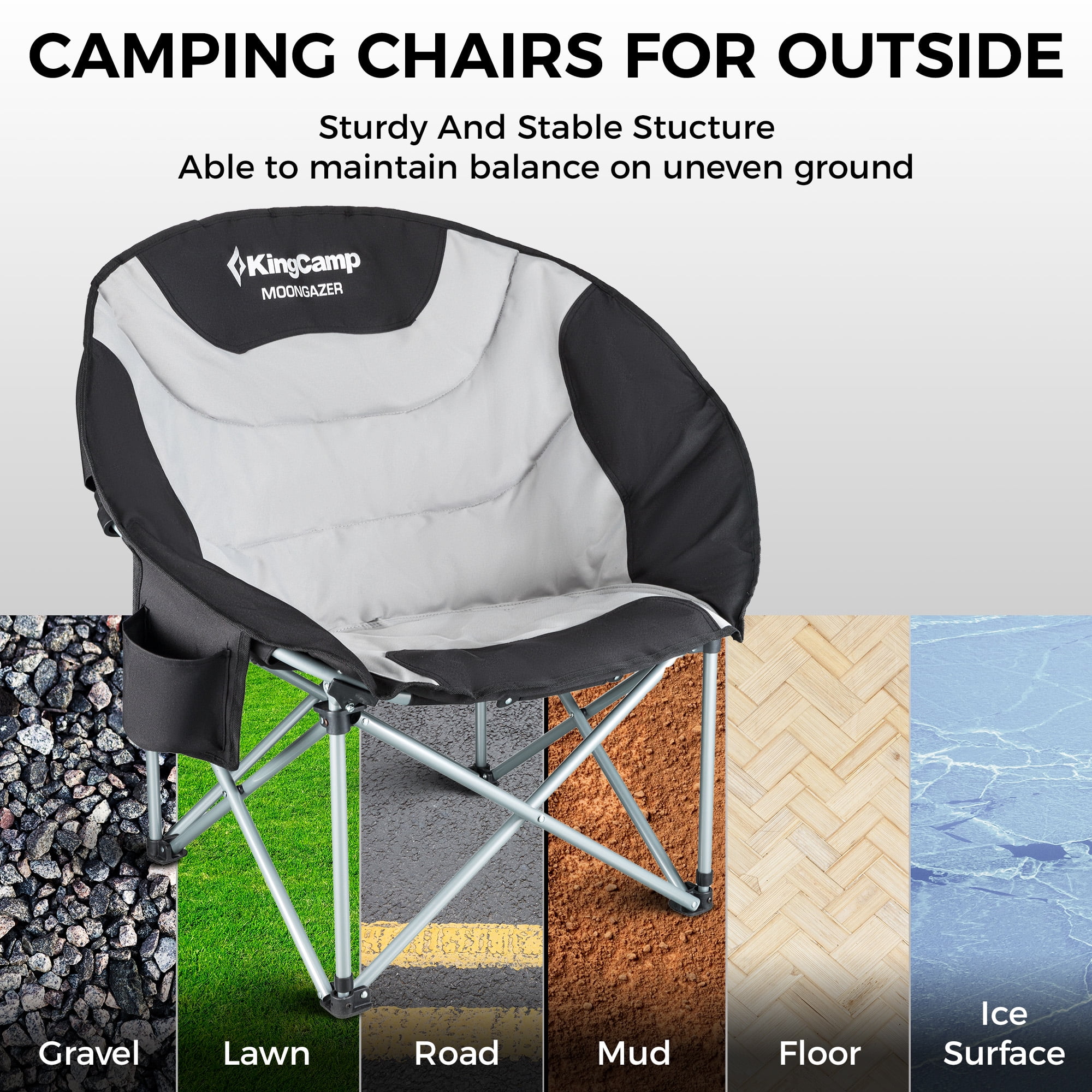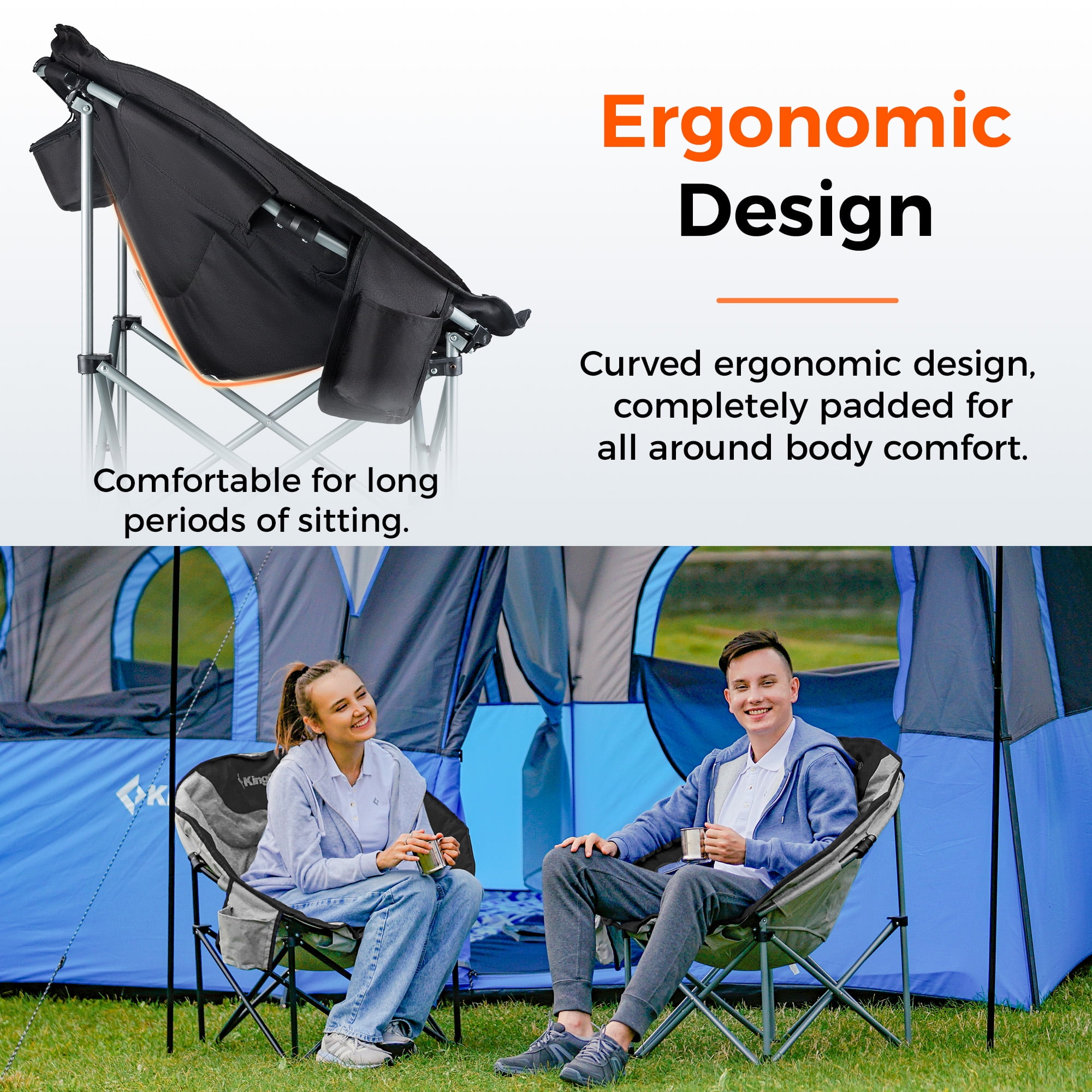 Sturdy Construction: The folding chair is made of a durable steel frame with the addition of a double vertical stiffened support tube stand and a triangular structure, greatly improving stability and durability, and the heavy outdoor chair can easily support up to 300 lbs for a adult. Comfortable Design: The outdoor chair features a moon-shaped seat designed ergonomically to provide ample seating area and full back support. The double-padded construction of the sofa chair offers additional comfort, allowing you to sit cross-legged or sideways, promoting relaxation while enjoying your camping experience. Portable Camping Chair: This moon chair open size:33.9 x 27.2 x 31.5 inches, folding size: 34.6 x 9 x 7.9 inches, weighing only 10.4 pounds. The one-piece design of our camping chair makes opening and closing easily, conveniently folds to a compact chair. The lightweight camping chair comes with a carry bag for transport and storage. Multipurpose Outdoor Chair: The KingCamp round camping chair is equipped with a cup holder and a cooler bag for storing drinks. Our camping chair is perfect for camping, fishing, sporting events, lawns, gardens, yards, outdoor activities, and leisure time. Customer Service: The camping chair with a 12-month warranty, If any part of the chair is lost or damaged, please contact us promptly, our team will try our best to help you.