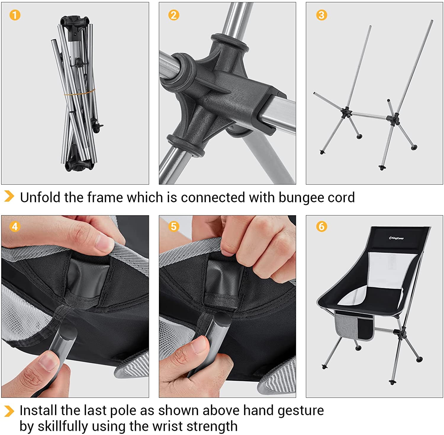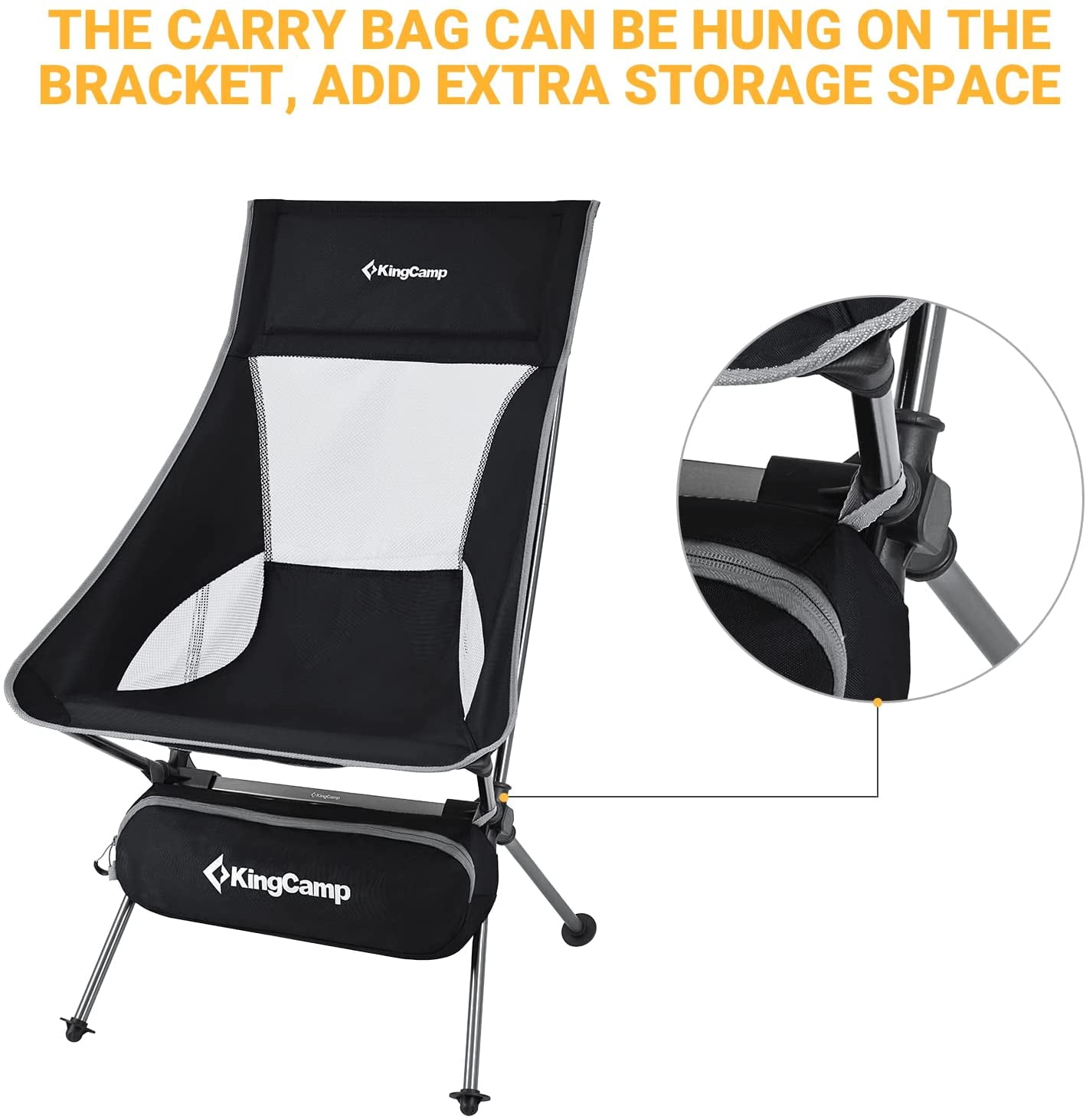 High Back for Added Comfort: High back design of our camping chair to provide more support to you back, neck and head, give you a smooth feeling and fully relax for long periods. This ergonomic designed proper tilt angle of backpacking chair allows you to comfortably lean back while maintaining a normal sitting position. Durable and Stable: KingCamp camping chair is made of 600D polyester seat fabric and strengthen corrosion-resistant 7075 aluminum alloy frame provides load capacity up to 330 pounds for adults. Wide corners at the back of seat fabric are greatly reinforced to ensure reliability. Big rubber feet grip suits both soft and hard ground, making you sit stably. Stable base keeps you secure in most terrains. Ultralight and Compact: The compact hiking chair weighs only 3.3 pounds and folds down to 20.5*6.7*5.1 inches, you can easily pick the folding chair up with one hand, you can put the portable chair in carry bag and take it anywhere. Easy Setup and Packup: Frame almost sets itself up with elastic cords going through the poles. Fabric seat sleeves just slip over each of 4 poles. 2-velcro straps make the fold up chair easy to fold up the frame, you can tie the poles on one side first and then the other side in order. You can do it in a minute with a little practice. Versatility: Perfect for car motorcycle camping, tailgating, biking, fishing, hunting, music festival, backyard party, sporting event, park, field, barbecue, short backpacking trip and anyone looking for travel light without being bulky. This ultralight camping chair is also a decent holiday gift for family and friends. Customer Service: The camping chair with a 12-month warranty, If any part of the fishing chair is lost or damaged, please contact us promptly, our team will try our best to help you.