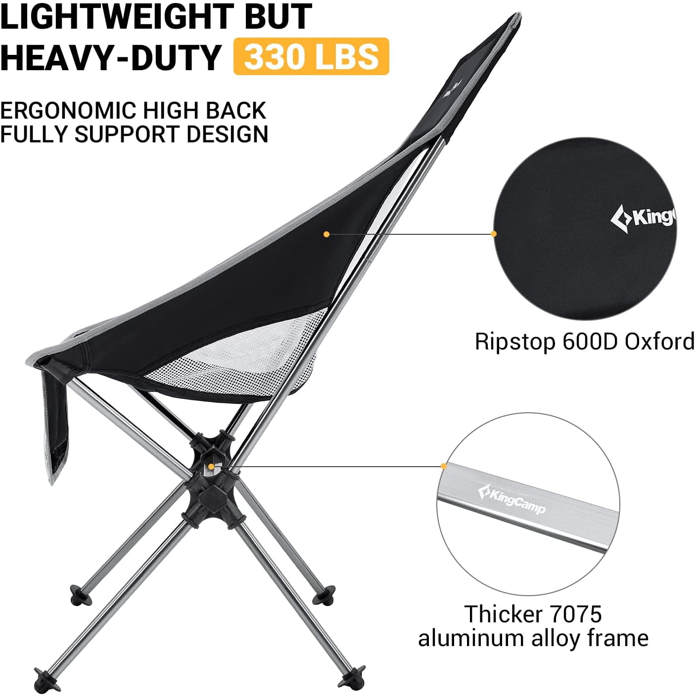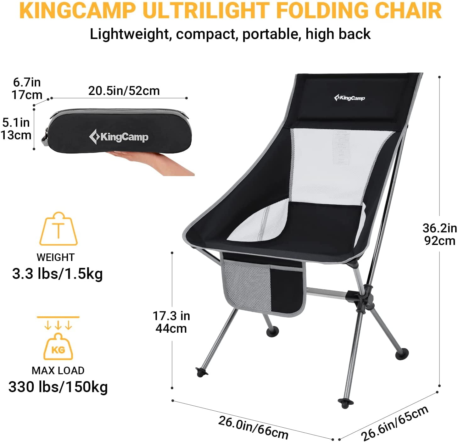 KingCamp Ultralight High Back Camping Chair – Compact Folding Design, 330 lbs Support, Perfect for Backpacking & Hiking (Black)
