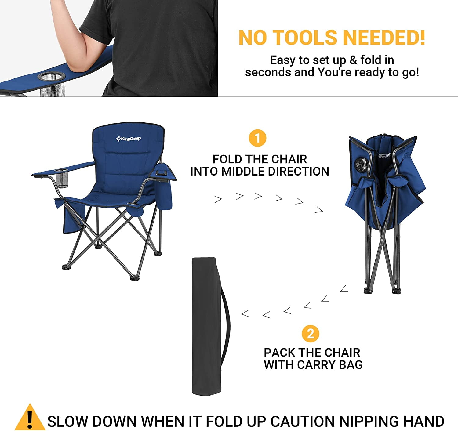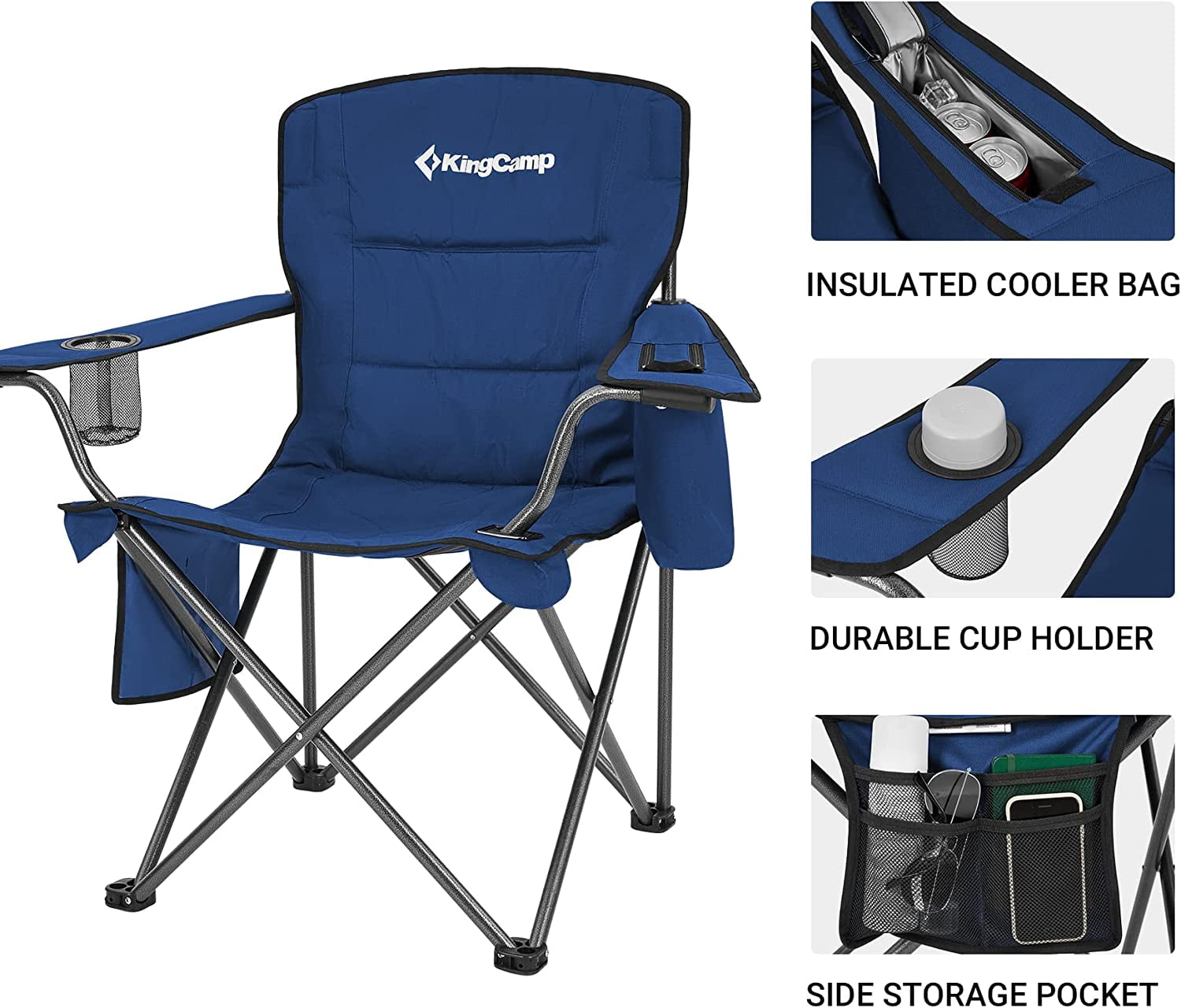 Comfortable: Adopt Padded seat and armrest, ergonomic full back design. KingCamp camping chairs assure you luxuries comfort. Sturdy: Heavy duty steel frame, much sturdy to support up to 300 lbs. 600D Oxford fabric tear resistance, guarantee a long-lasting use. Oversized: Set up size is 21.6″ L X 38.5″ W X 38.5″ H. The oversized camping chair is spacious enough for you to have a good relax all day. Hands free: Side cooler bag (fits 4 cans), mesh cup holder and side storage pocket for holding cell phone and notebook. The camping chair with cooler is designed to provide you a cool and pleasant trip in hot summer. Portable: Just set up and fold in seconds. Easy to carry and store with carry bag. Perfect for camping, hiking, garden, beach, patio parties, fishing ect.