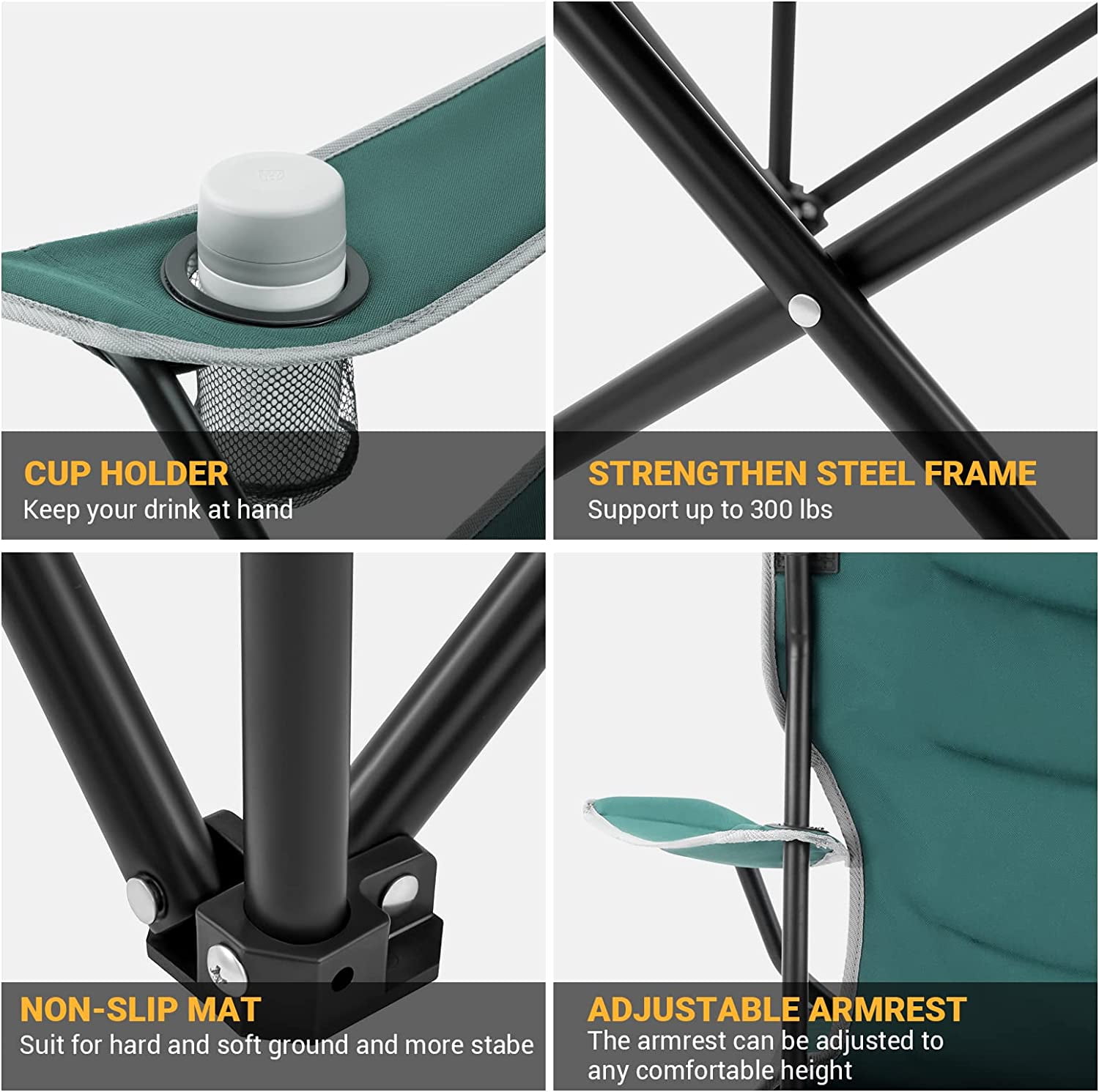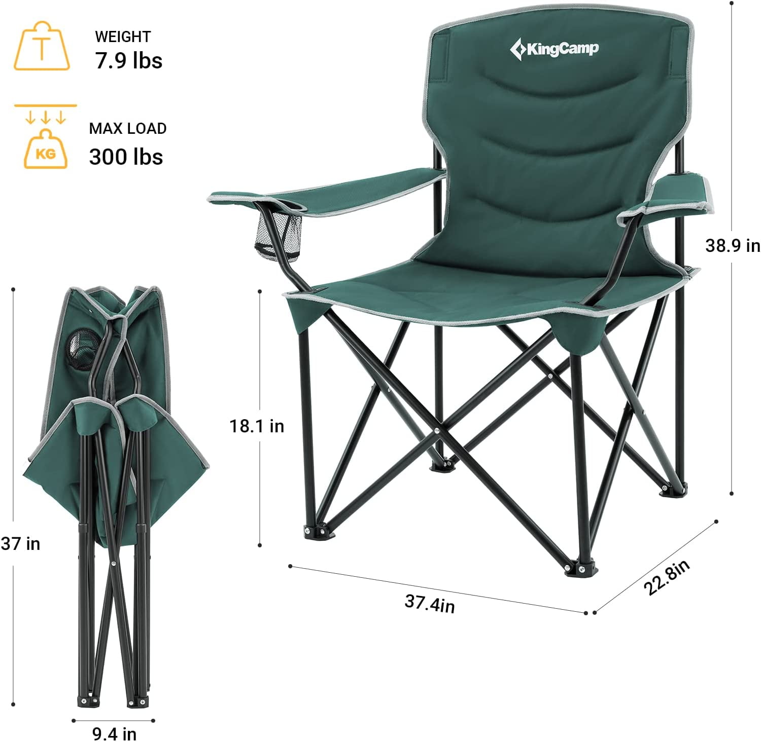 【OVERSIZED AND ERGONOMIC DESIGN】Indulge in spacious comfort with our oversized folding chair boasting a generous 34-inch seat width. Engineered with an ergonomic design, this camping essential offers ultimate relaxation. The padded backrest and seat elevate your comfort, and the widened armrests provide additional support for a truly luxurious seating experience. 【ROBUST AND ENDURING】Crafted for robust reliability, our folding chair showcases a sturdy steel frame reinforced by two longitudinal iron pipes, supporting up to 300lbs with unwavering stability. Navigate diverse terrains confidently with non-slip chair feet, while the 600D Oxford cloth with padding ensures enduring durability and tear resistance, making it a resilient choice for your outdoor adventures. 【USER-FRIENDLY AND PORTABLE】At just 7.9 lbs and a compact packed size of 37 × 9.4 × 8.6 inches, our camp chair is a lightweight marvel. Effortlessly set up and folded in seconds. The convenience continues with an included carry bag, making transportation and storage a breeze. Ideal for on-the-go enthusiasts, perfect for outdoor activities like fishing, camping, and traveling. 【CONVENIENT CUP HOLDER AND ARMREST】Discover convenience with our folding lawn chair, equipped with a cup holder and storage pouch on the right side for easy access to your drink and belongings. The portable chair’s widened armrests are adjustable, ensuring you can customize them for maximum comfort and exceptional support. 【CUSTOMER SERVICE】 At KingCamp, we provide you with the most affordable and reliable camping gear for all your outdoor needs. Should you have any questions or concerns, our dedicated customer service is ready to assist you directly. Your satisfaction is our top priority.