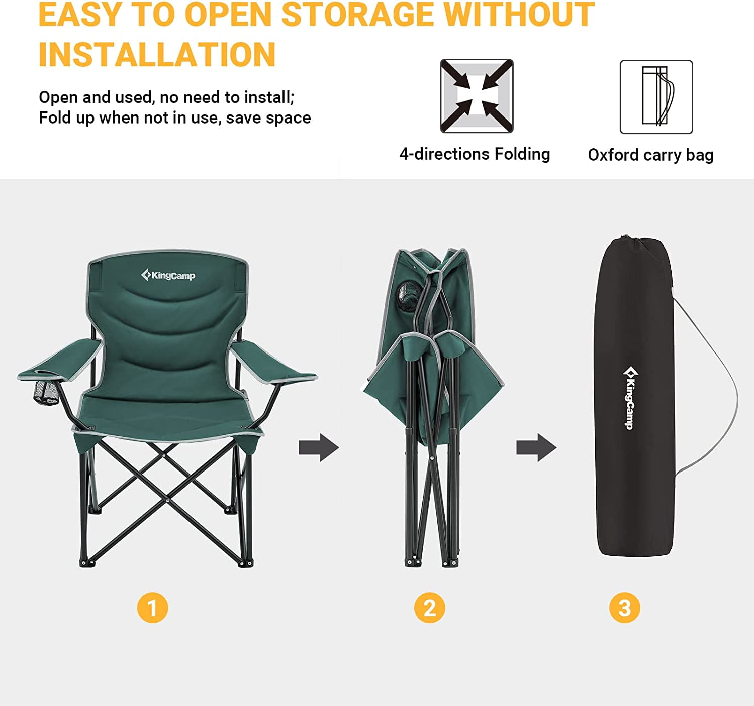 KINGCAMP FOLDING CAMPING CHAIR KingCamp oversized folding camping chair is easy folding and protable for storage and transportation. It can fit inside most car trunks. Built-in mesh cup holder keeps drinks within reach. And the adjustable armrest is widened, the height of the armrest can be adjusted according to personal preference. It is your best choice to take it out for outdoor activity. Great for camping, car traveling, fishing, climbing, sports meeting.