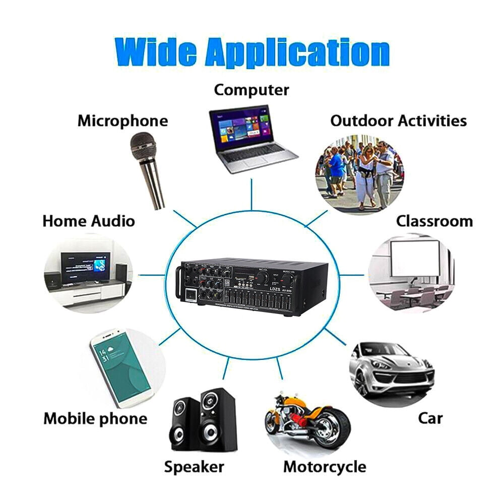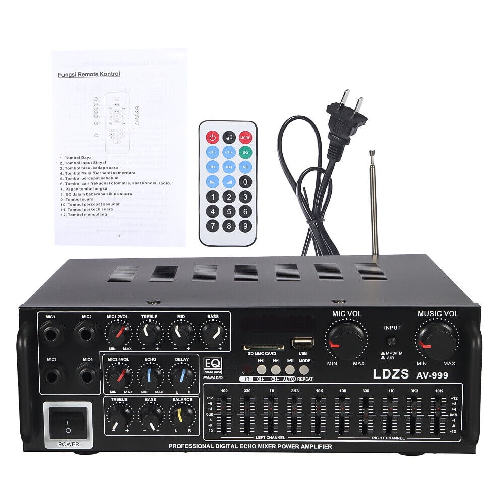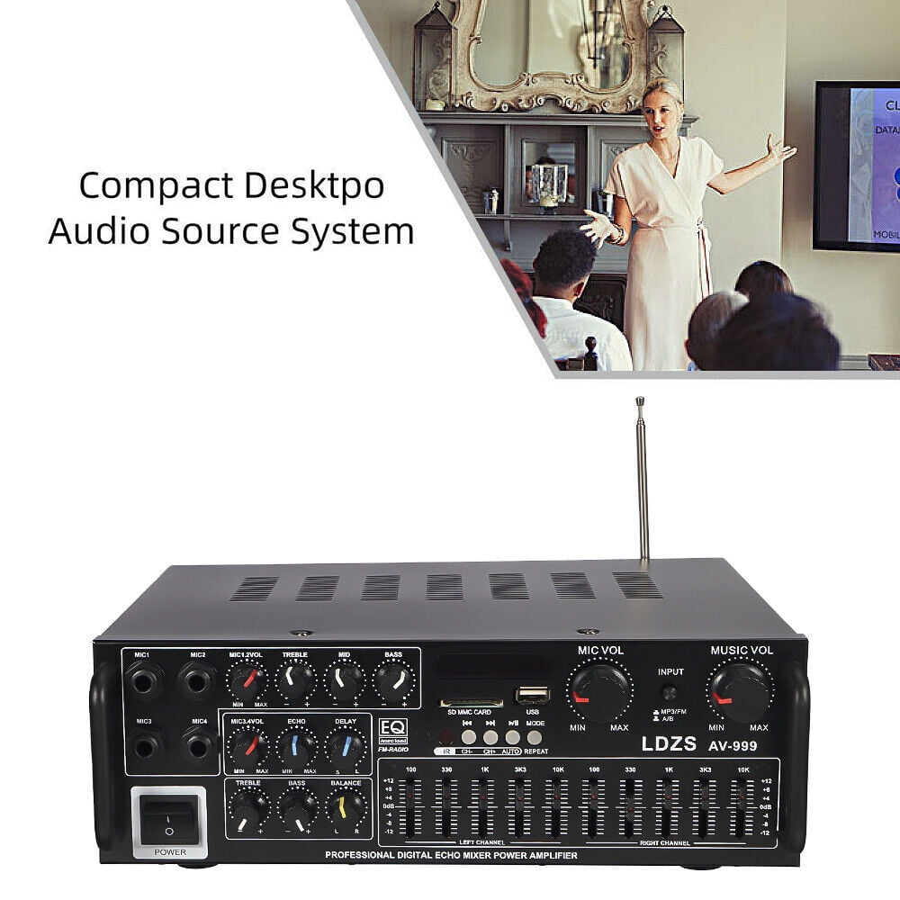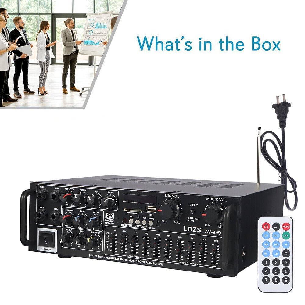 Powerful and Versatile: With 5000W output, this Bluetooth stereo amplifier supports 4 microphone inputs and Bluetooth connectivity, making it perfect for karaoke, home theater, and acoustic sound Intuitive Control: This room AV receiver features a built-in digital LED display that shows input mode, track, and folder name. Easily adjust audio settings with the included remote control and enjoy Reliable and Durable: Made with high-quality components, this AV power amplifier is built to last. Its standard impedance of 4 to 16 ohms and low distortion level of ≤0.5 ensure clear and crisp sound Multiple Connectivity Options: This power amplifier offers various audio input options including USB, SD, and stereo L/R RCA outputs. Connect it to your devices and enjoy seamless playback with a Enhanced Audio Experience: Equipped with 2 big headphone outputs with EQ control, reverb, trim, and balance functions, this amplifier allows you to tailor the sound according to your preferences. The