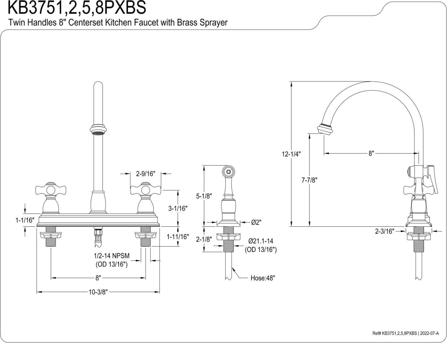 Kingston KB3751PXBS Restoration Two-Handle 4-Hole 8″ Centerset Kitchen Faucet with Brass Sprayer in Polished Chrome