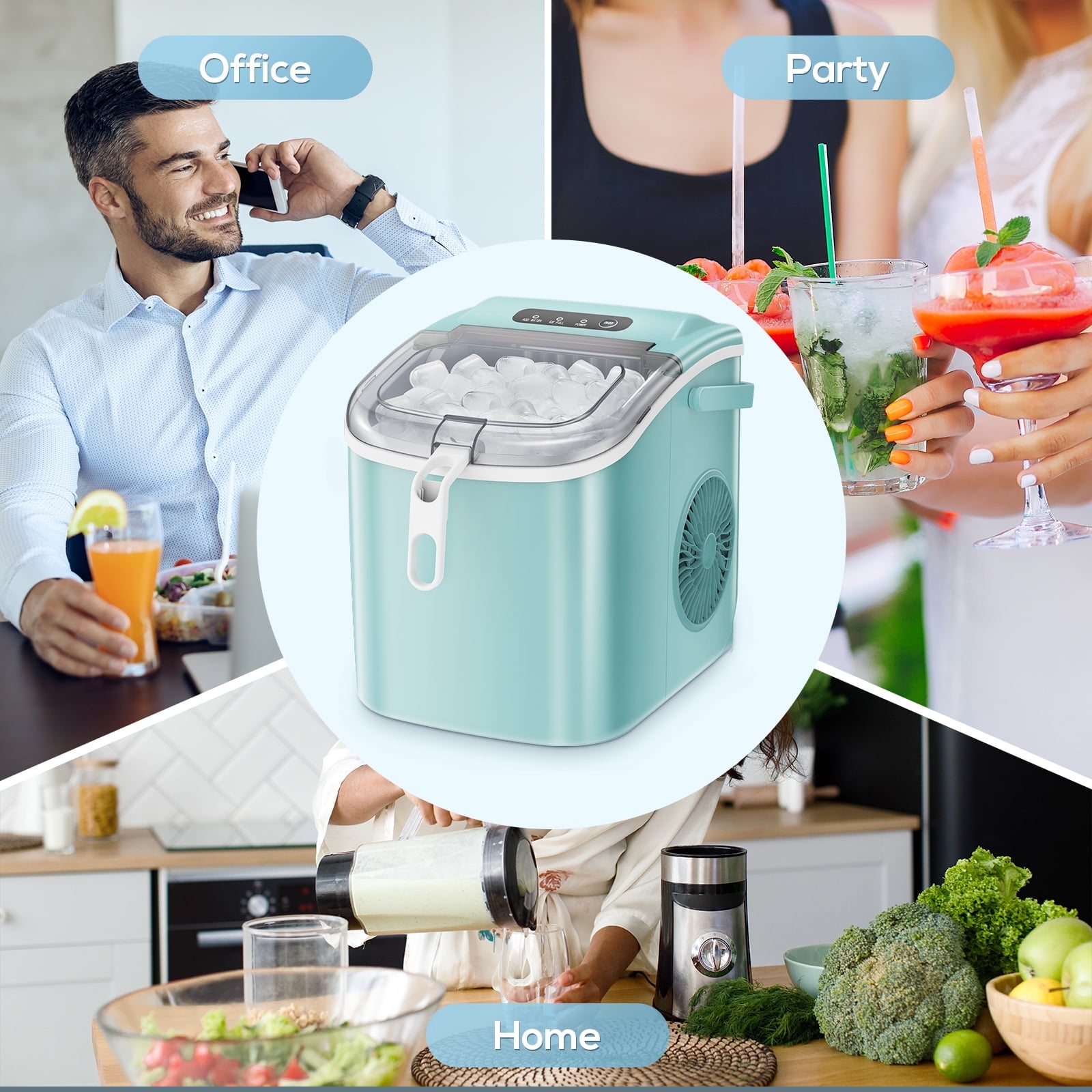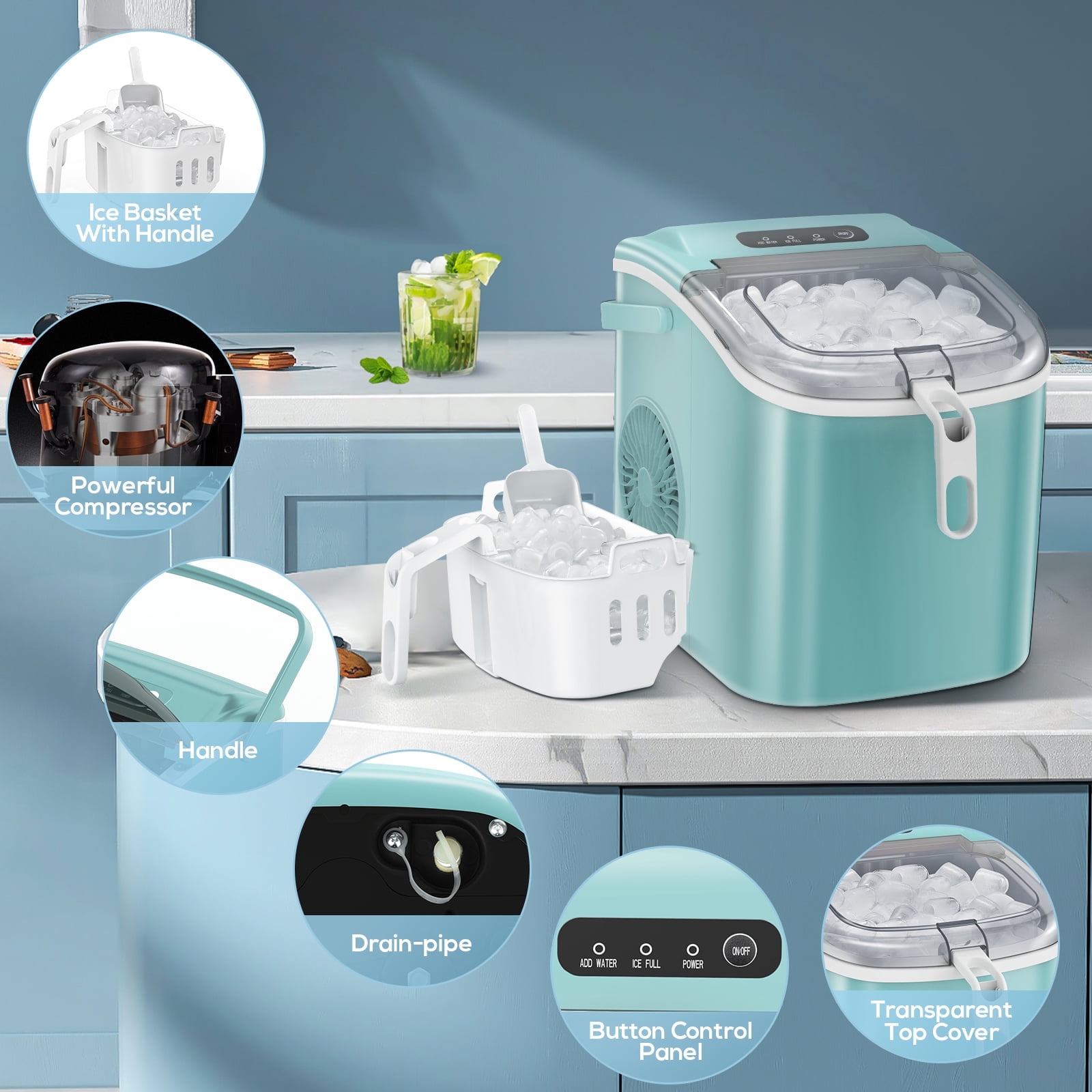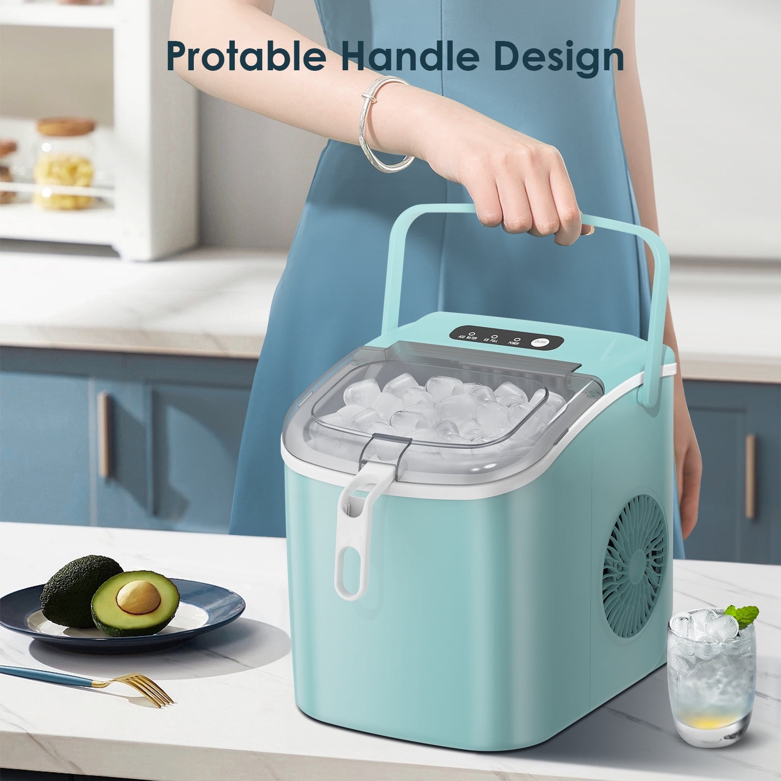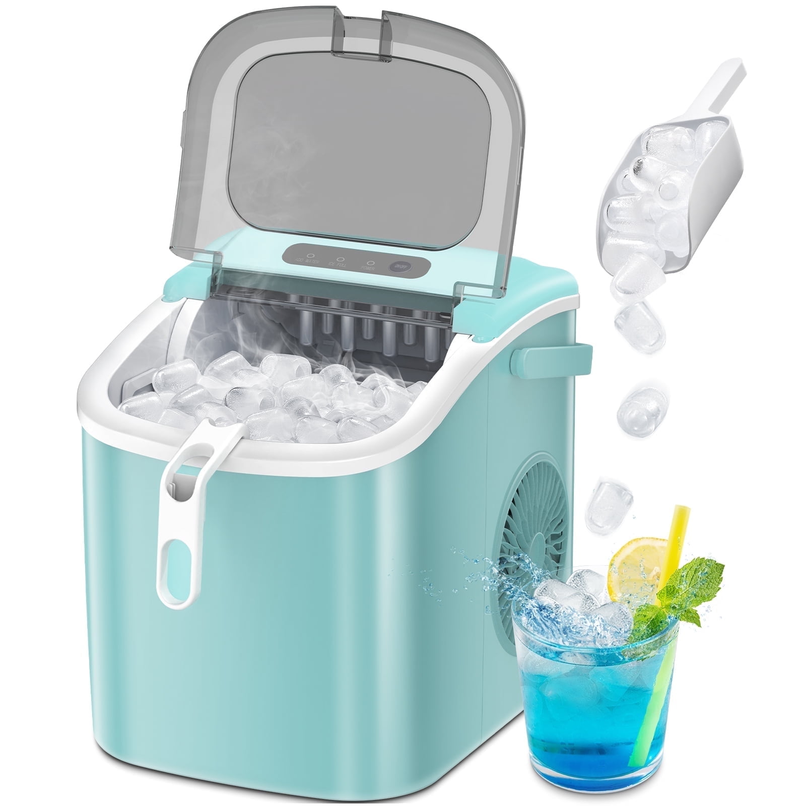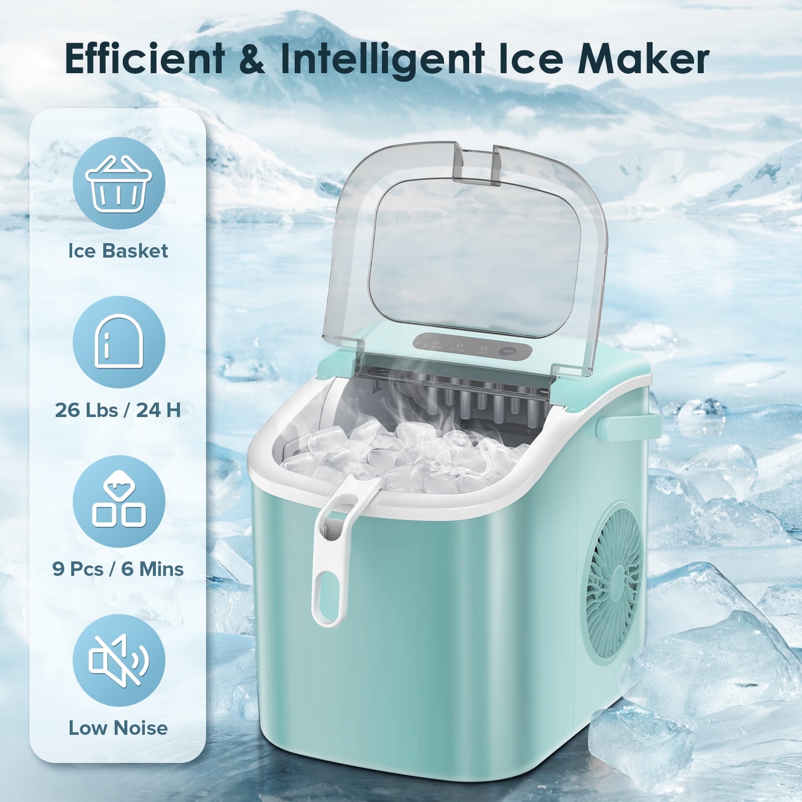 Auseo Countertop Ice Maker, 26lbs/24H, 9 Cubes in 6-12 Mins, Auto-Cleaning Portable with Basket and Scoop, Green