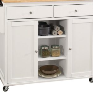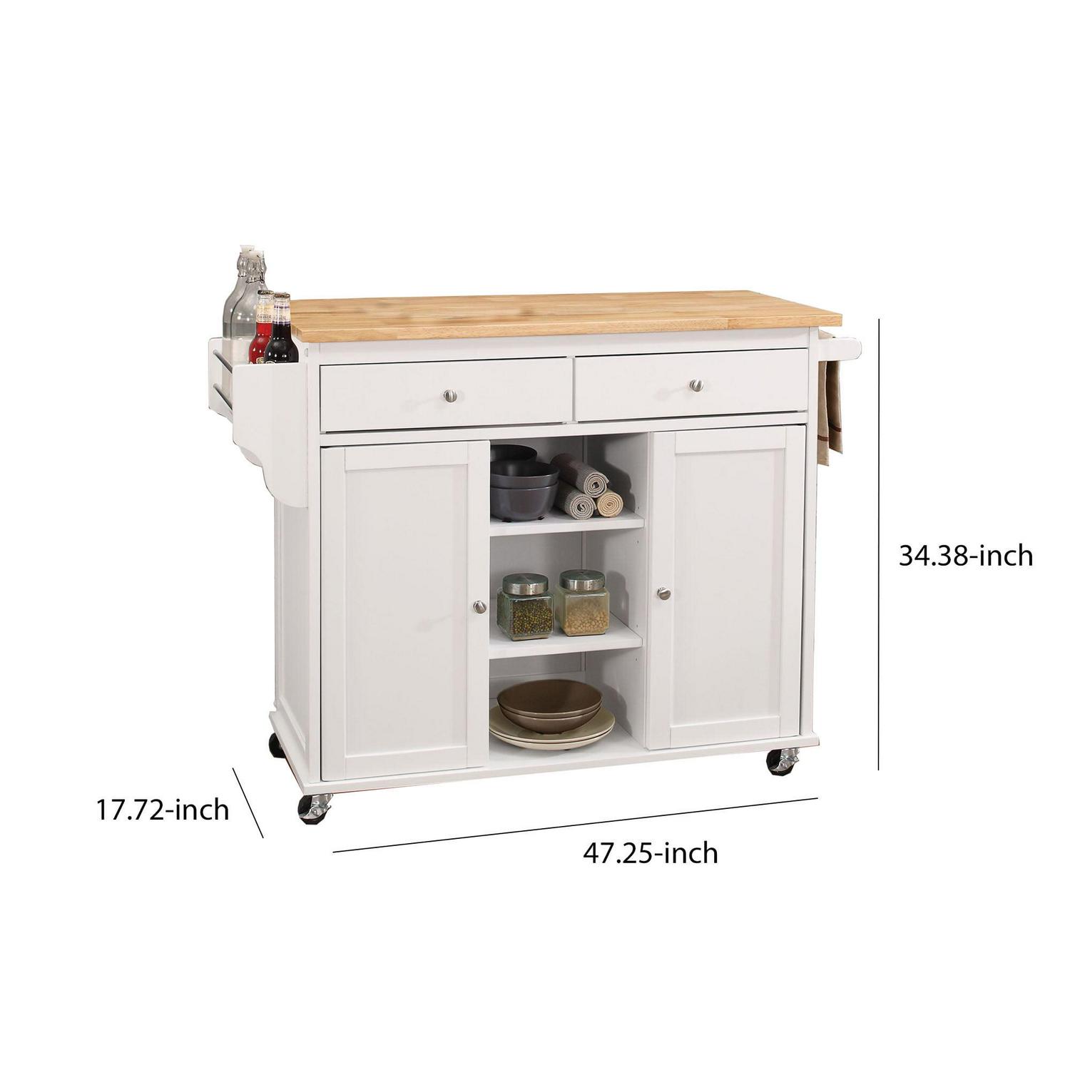 Kitchen Cart With Wooden Top, Natural & White- Saltoro Sherpi This kitchen cart is a very efficient and functional piece to include in a kitchen interior. This kitchen cart features 2 door each with 1 shelf inside, 2 drawers, 3 open storage compartments, and wooden top. Its 4 caster wheels (2 with locks) make this cart for friendly to use. This cart has separate spice and towel rack.