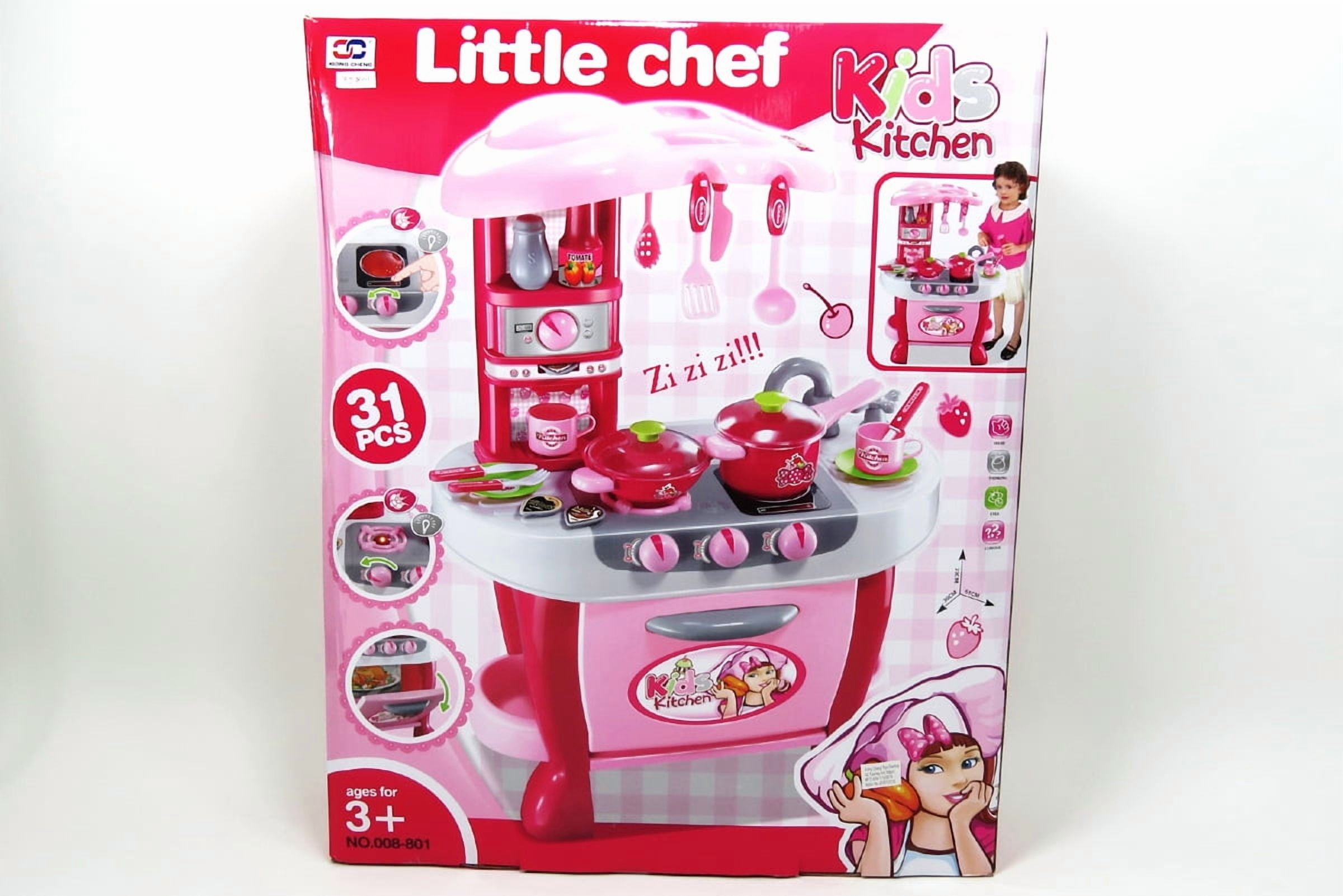 This is the perfect kitchen play set for a future chef! This kitchen appliance play set comes with a stove, sink, and oven. The stove top lights up and emits the sound of boiling water like an actual stove with the turn of a knob. The play set also includes pots, utensils, and other accessories to form a complete kitchen! Features: Stove, Sink, Oven (Lights and Sounds) Real Action Coffee Time 31 Pieces Requires 3 AA Batteries — not included Package Contents: 31 Piece Play Set 7 Utensils 2 Cups Pot + Pan 2 Lids 2 Plates Ketchup + Salt 3 Coffee + Coffee Machine 4 Knobs Faucet + Handle Sink + Oven + Overhang Product Dimensions: 25 x 20 x 5 Recommended Age: 3+ (Adult Assembly)